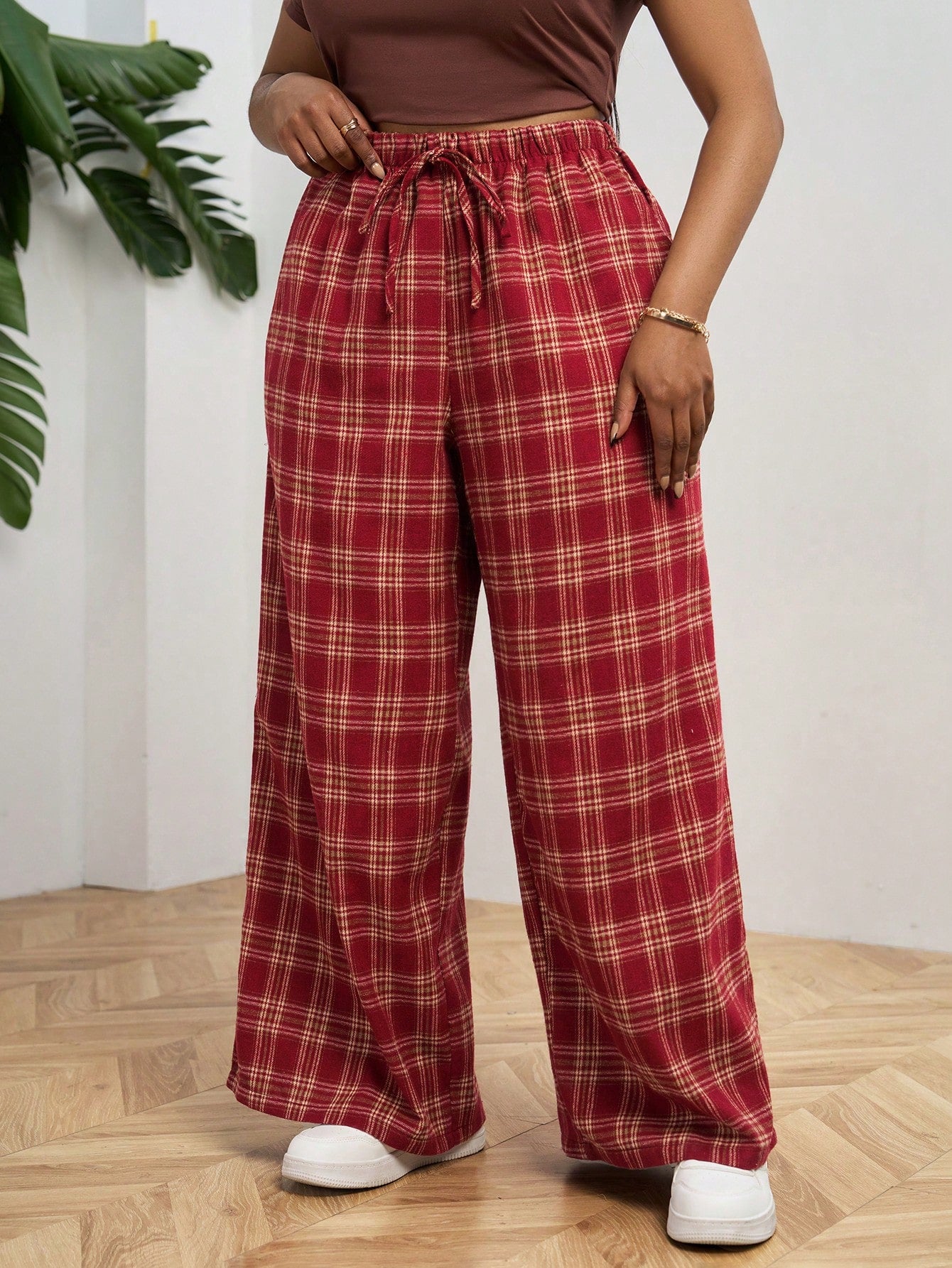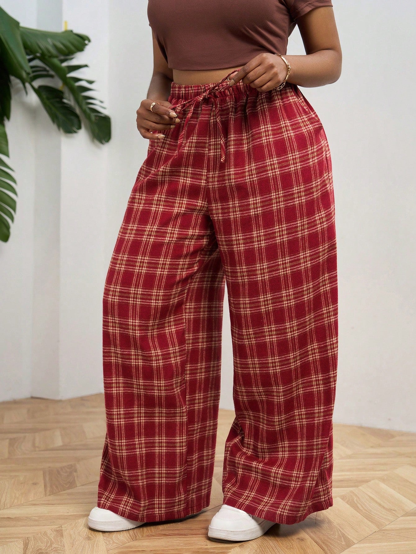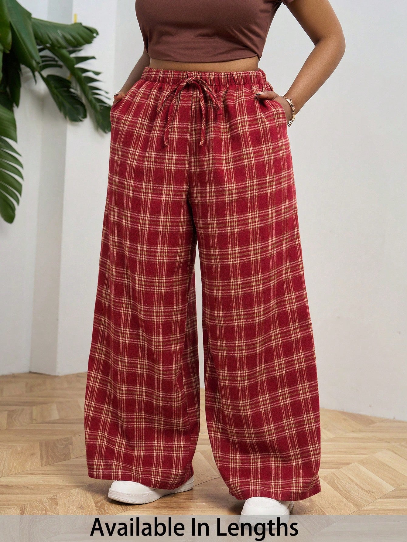 PETITE CURVE Plus Size Front Tie Plaid Casual Pants, Everyday Wear