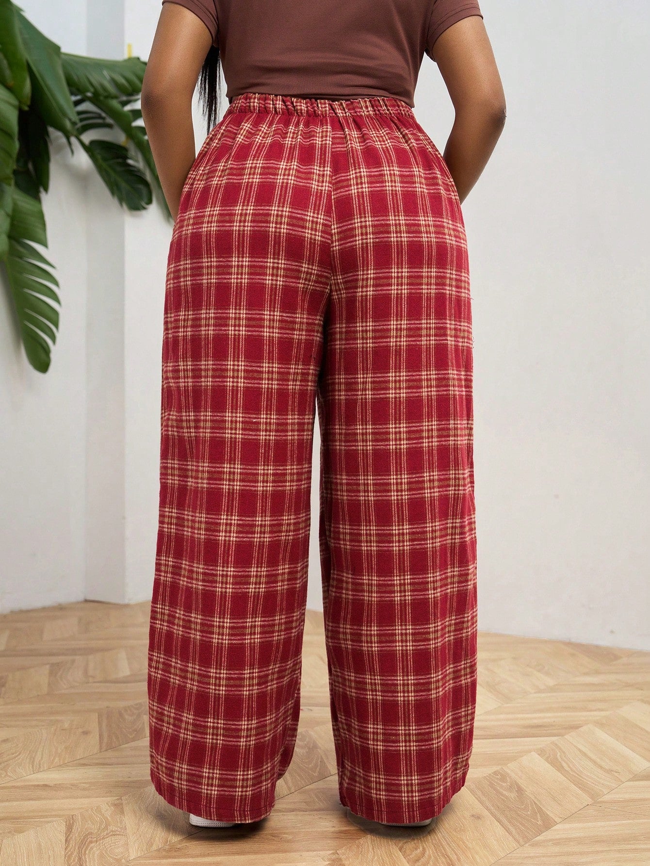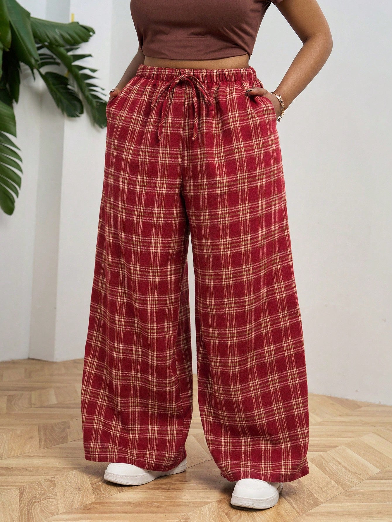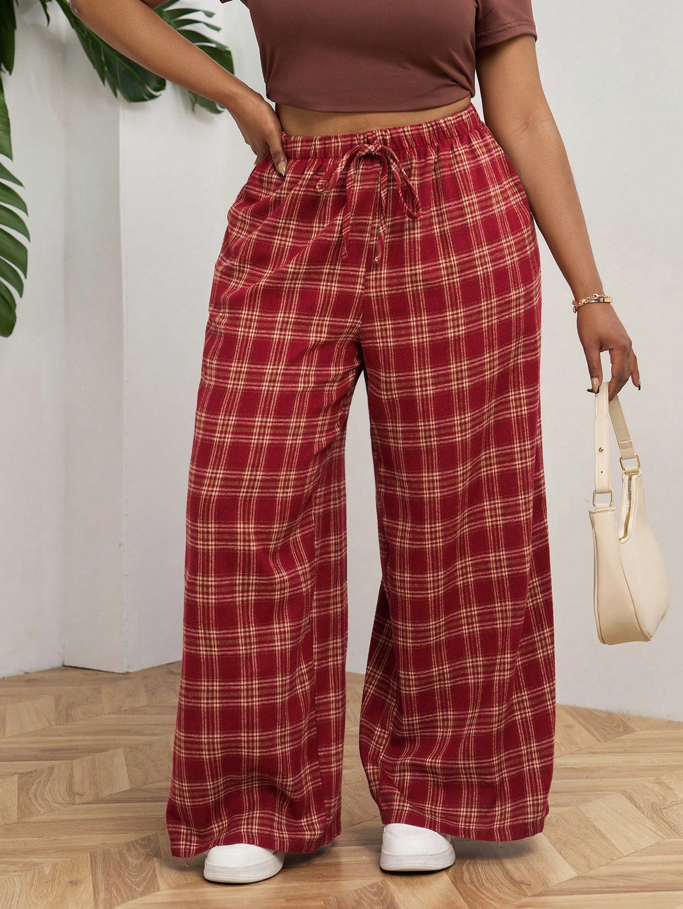 PETITE CURVE Plus Size Front Tie Plaid Casual Pants, Everyday Wear