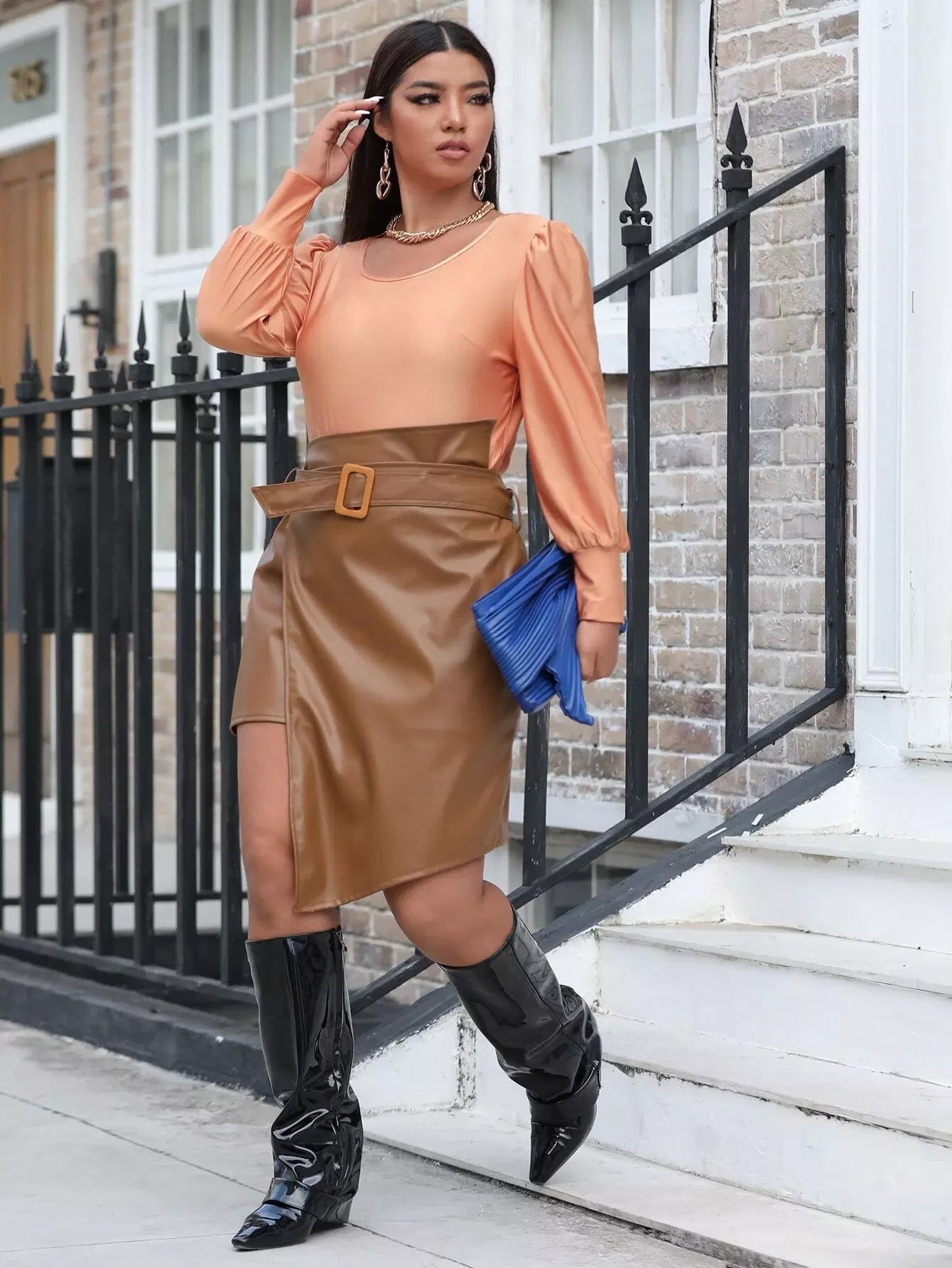 بالإضافة إلى تنورة من جلد البولي يوريثان بحاشية غير متناظرة بدون حزام