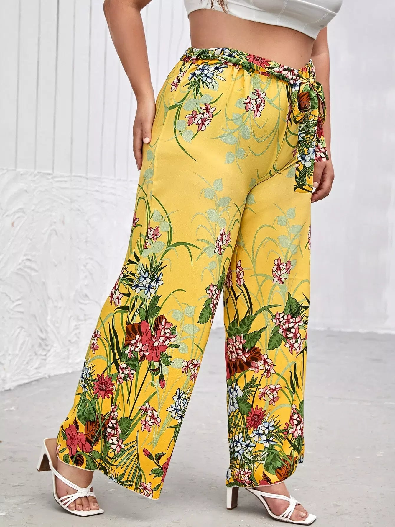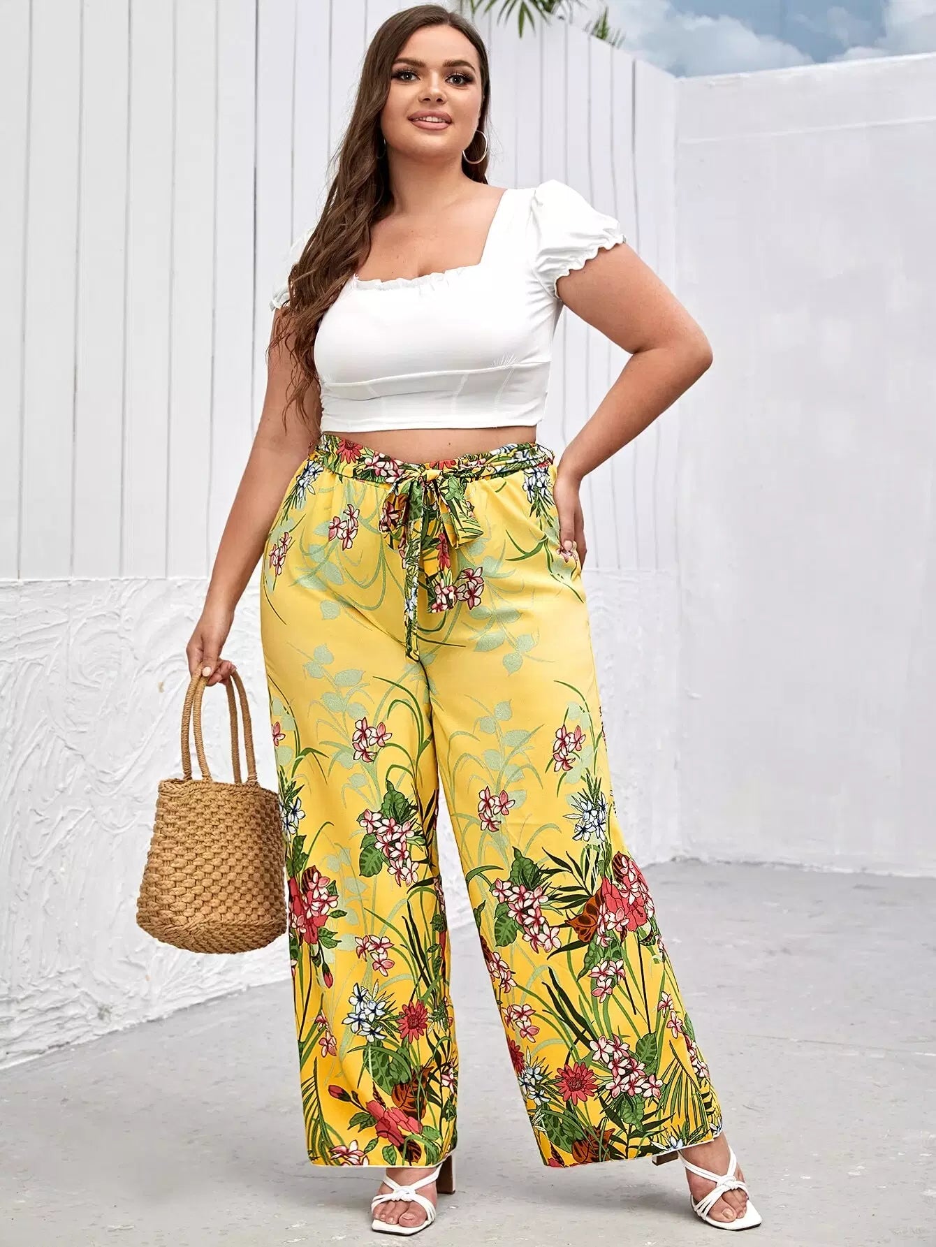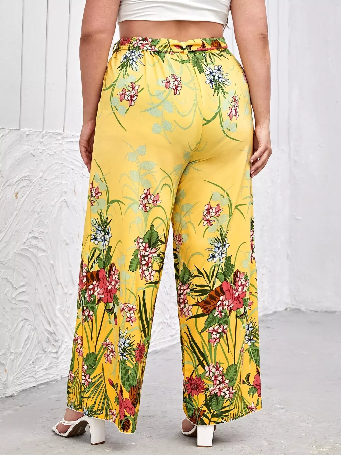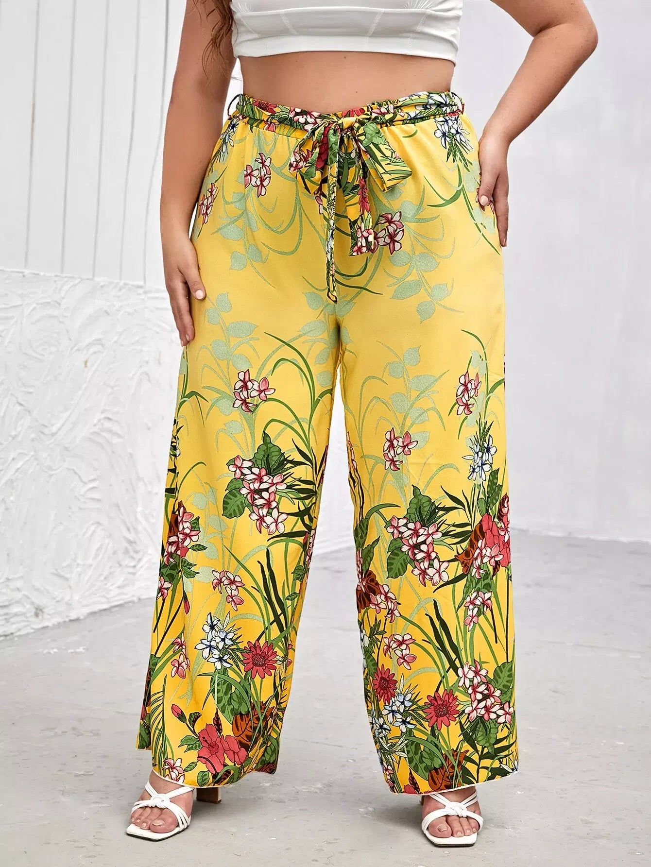 نحيف - مقاس كبير بنطال واسع الساق بحزام وطبعة زهور