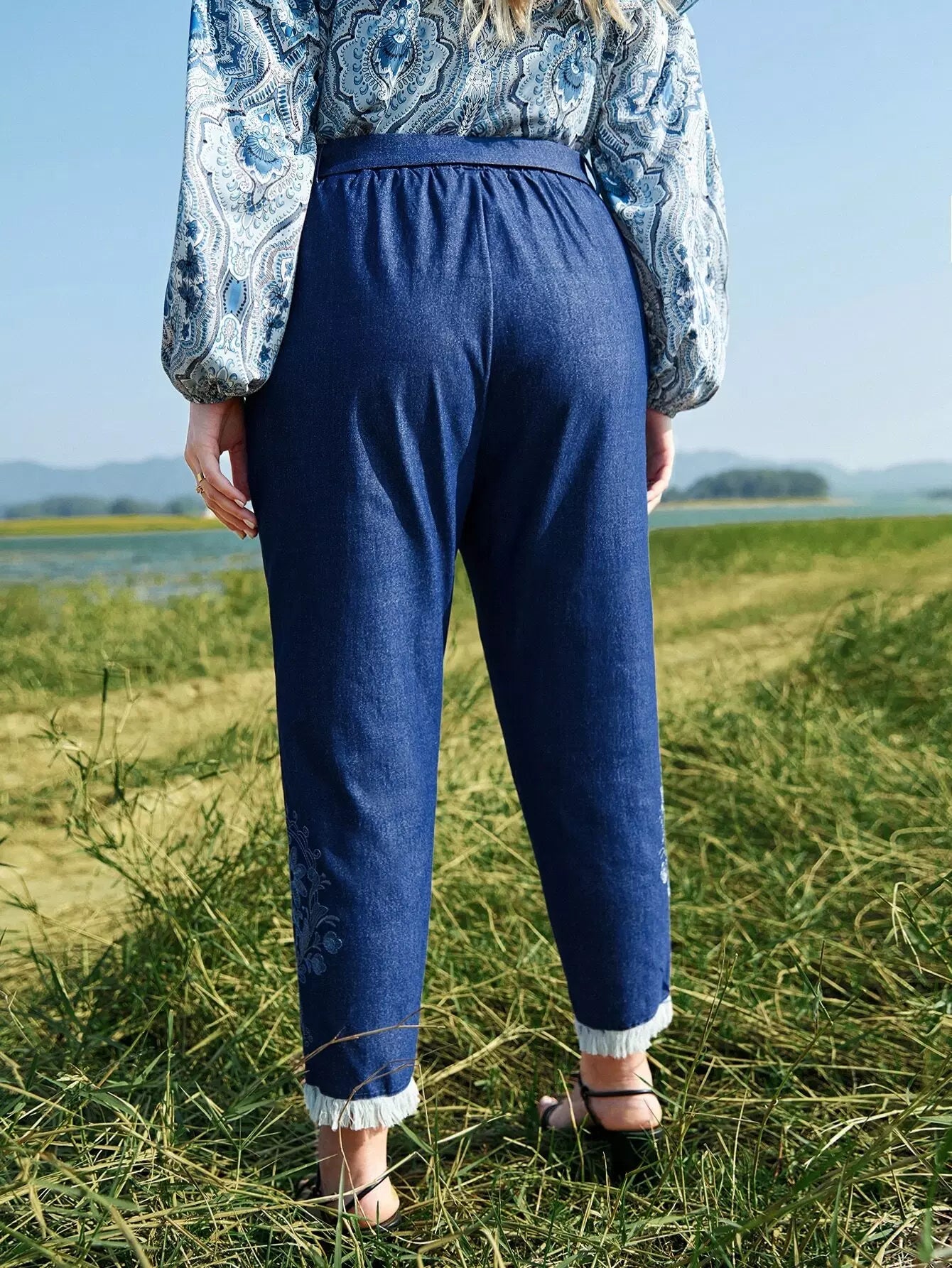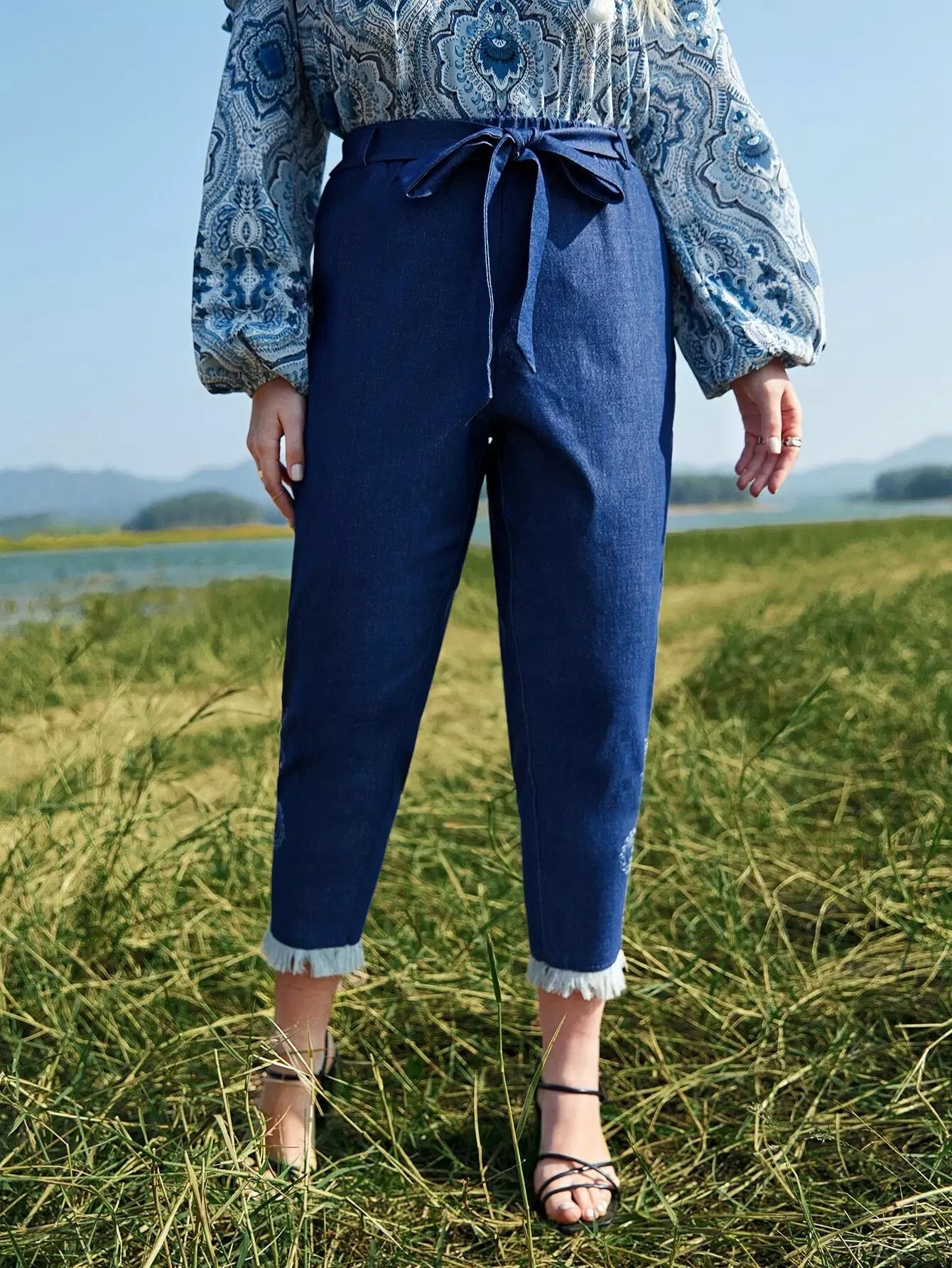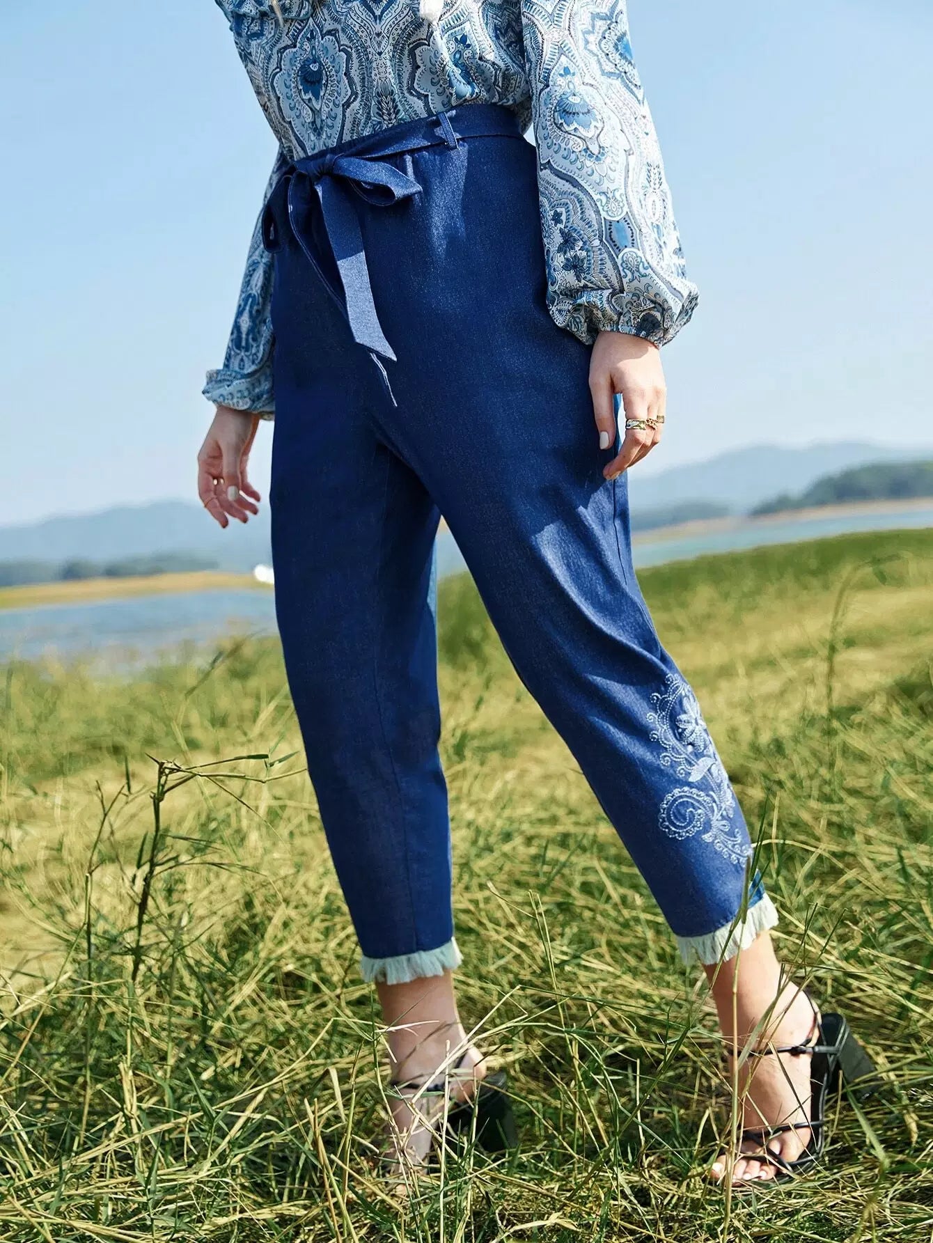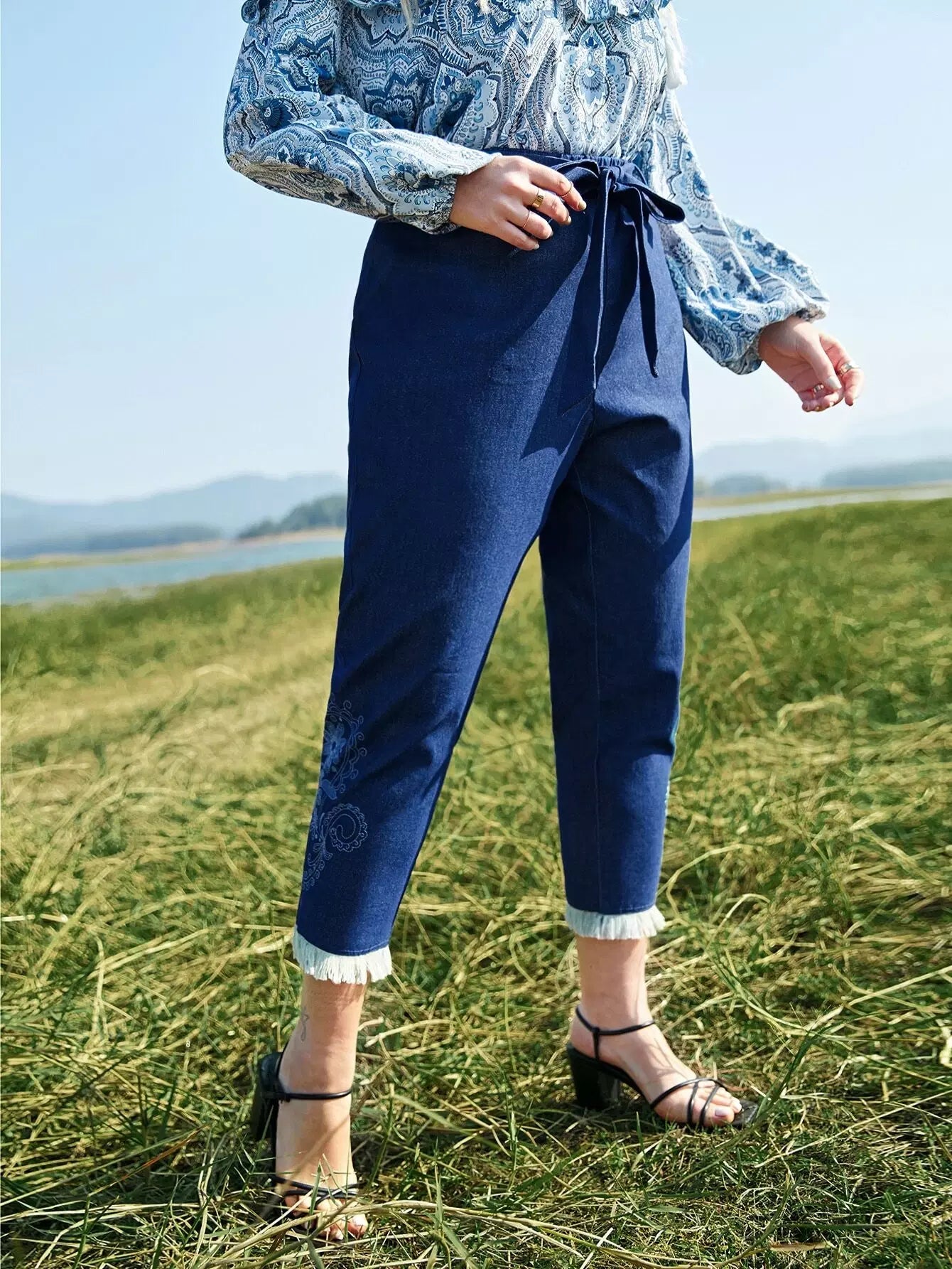 بالإضافة إلى بنطال مطرز بأهداب وأهداب بدون حزام