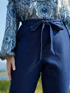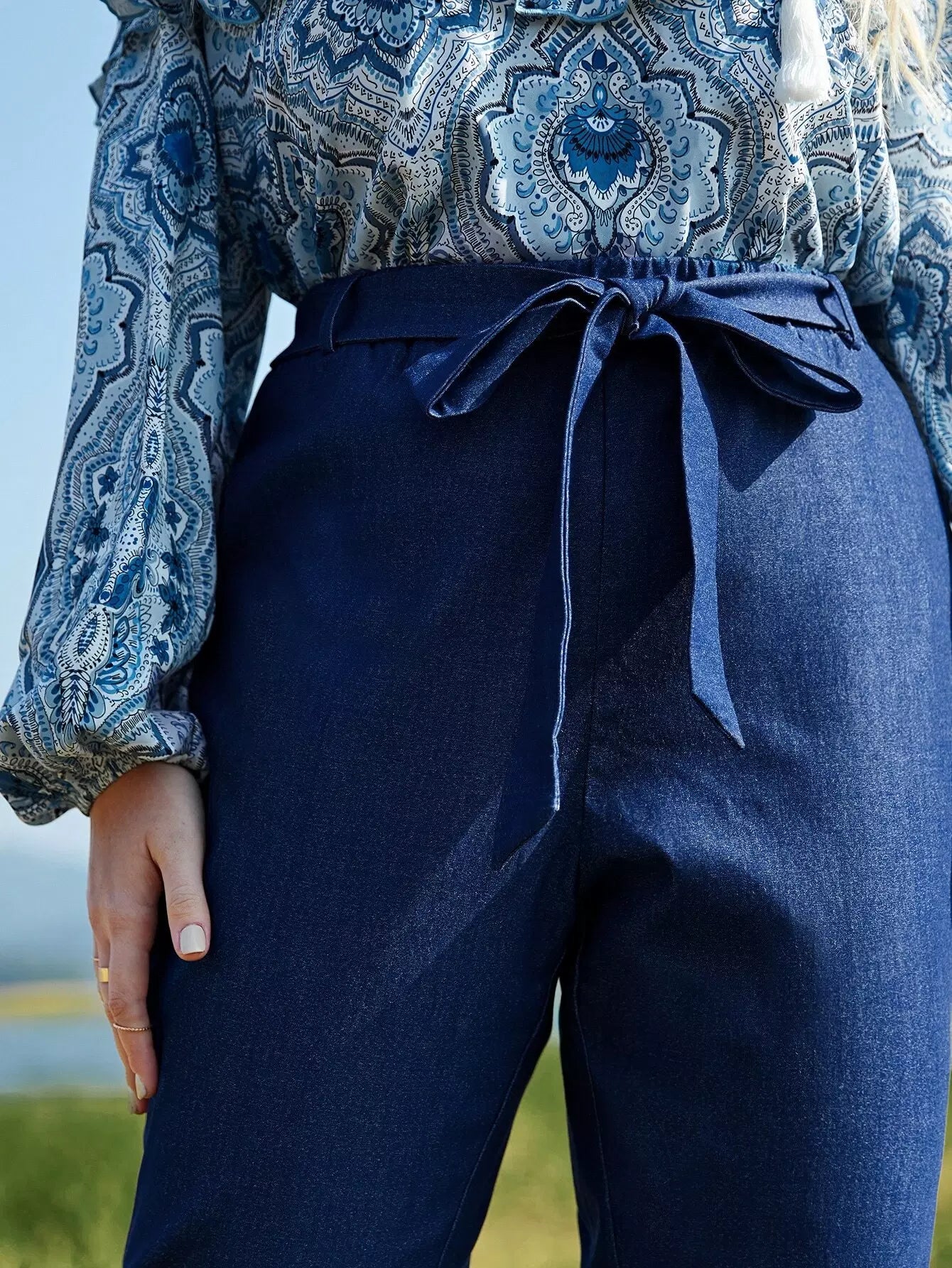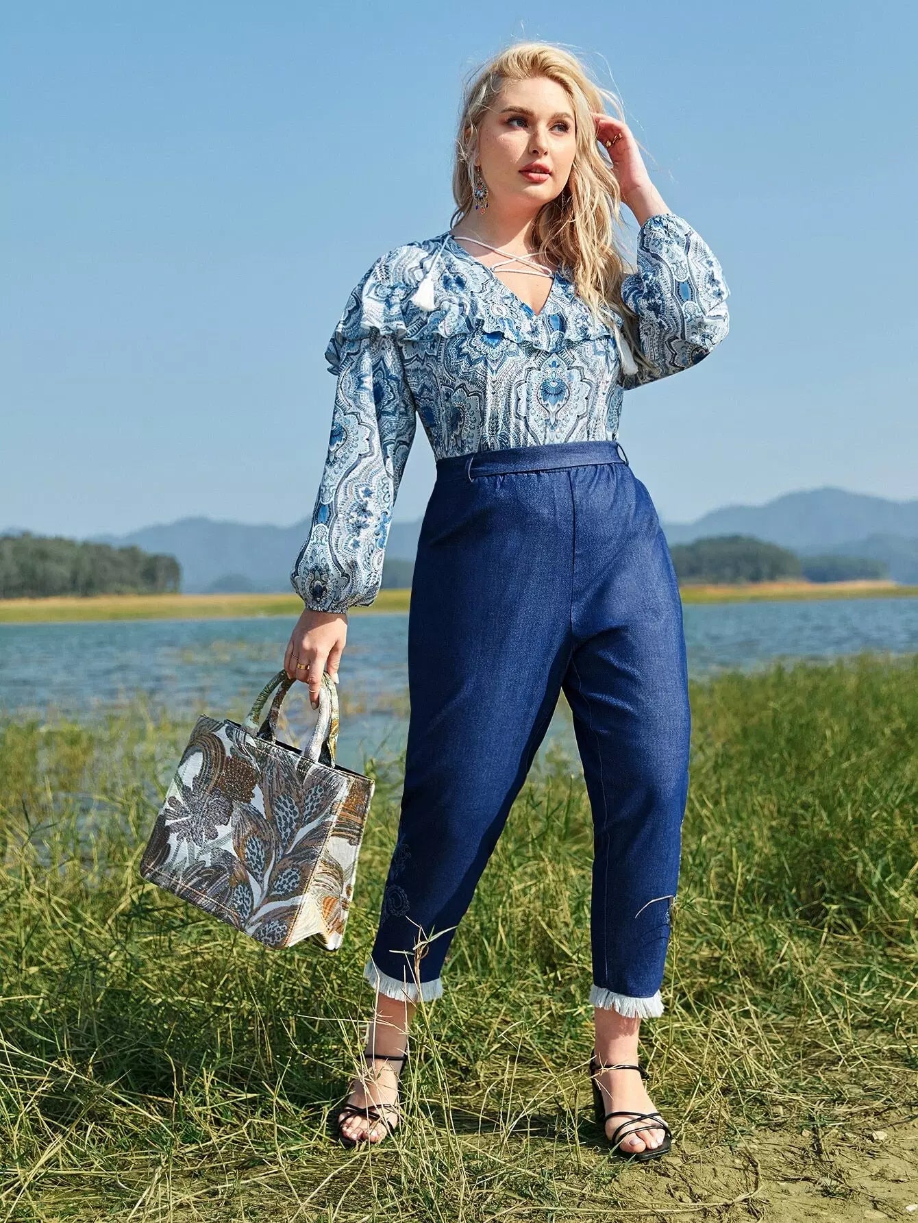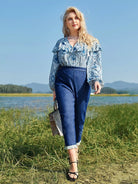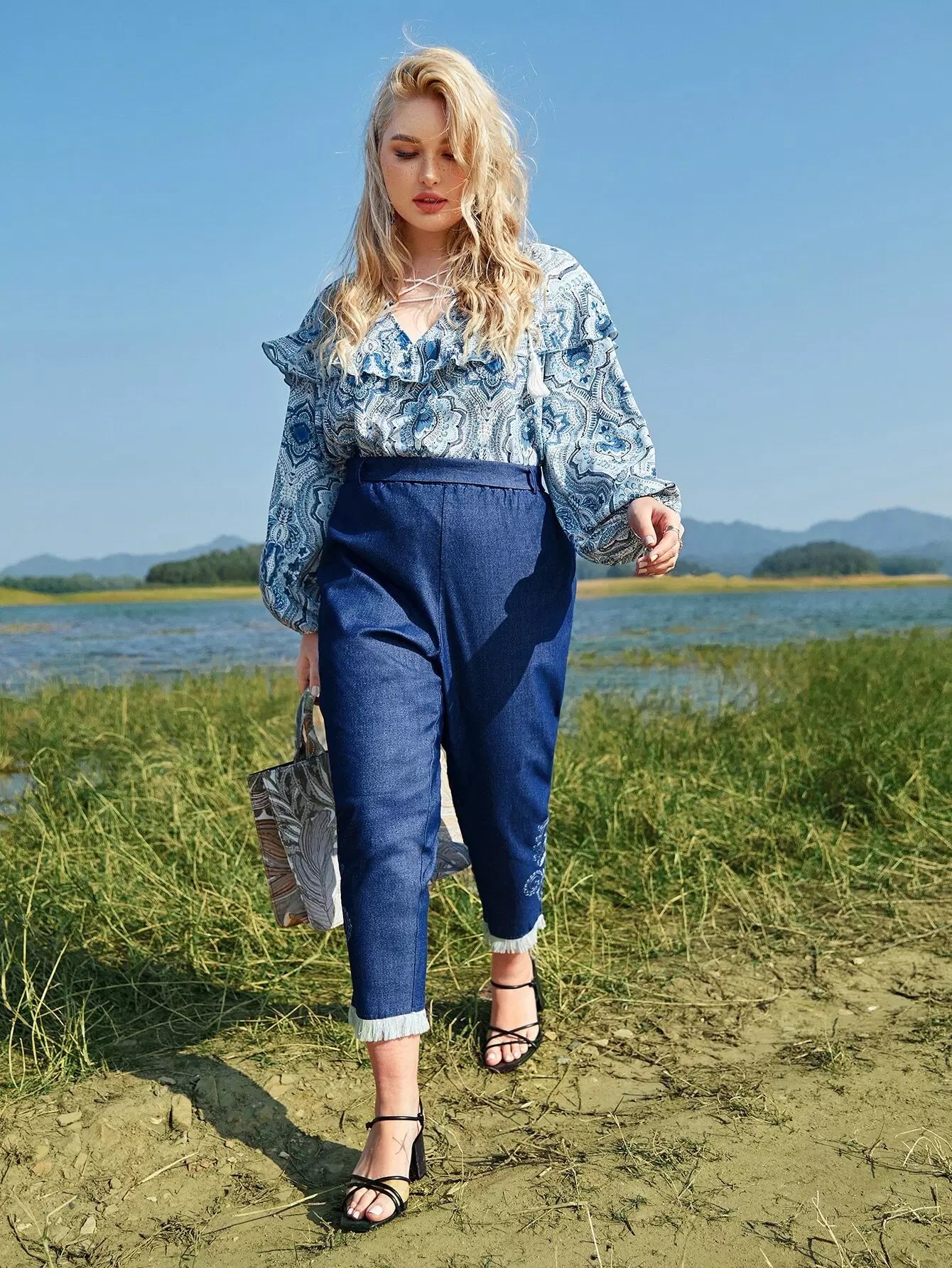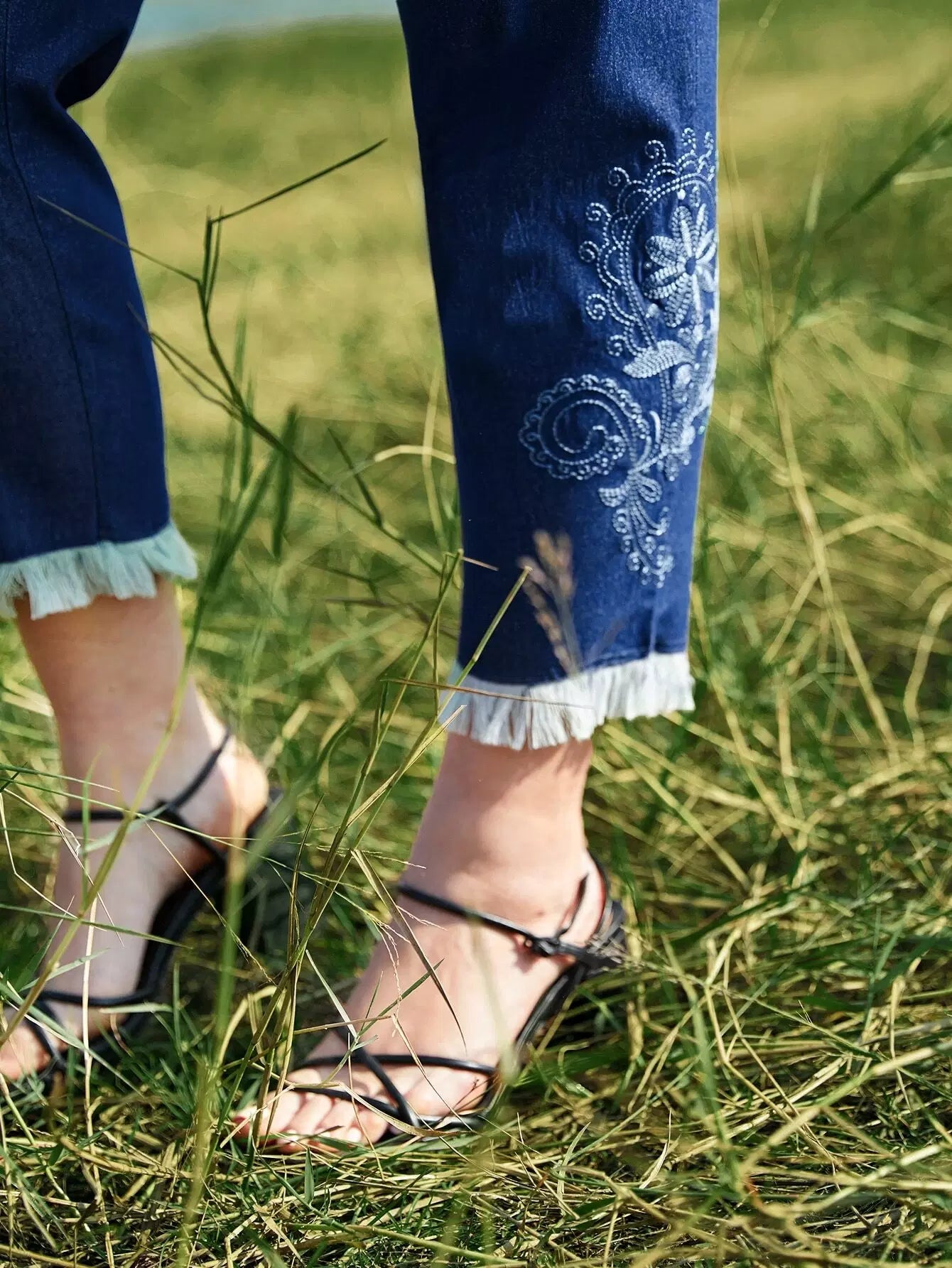 بالإضافة إلى بنطال مطرز بأهداب وأهداب بدون حزام