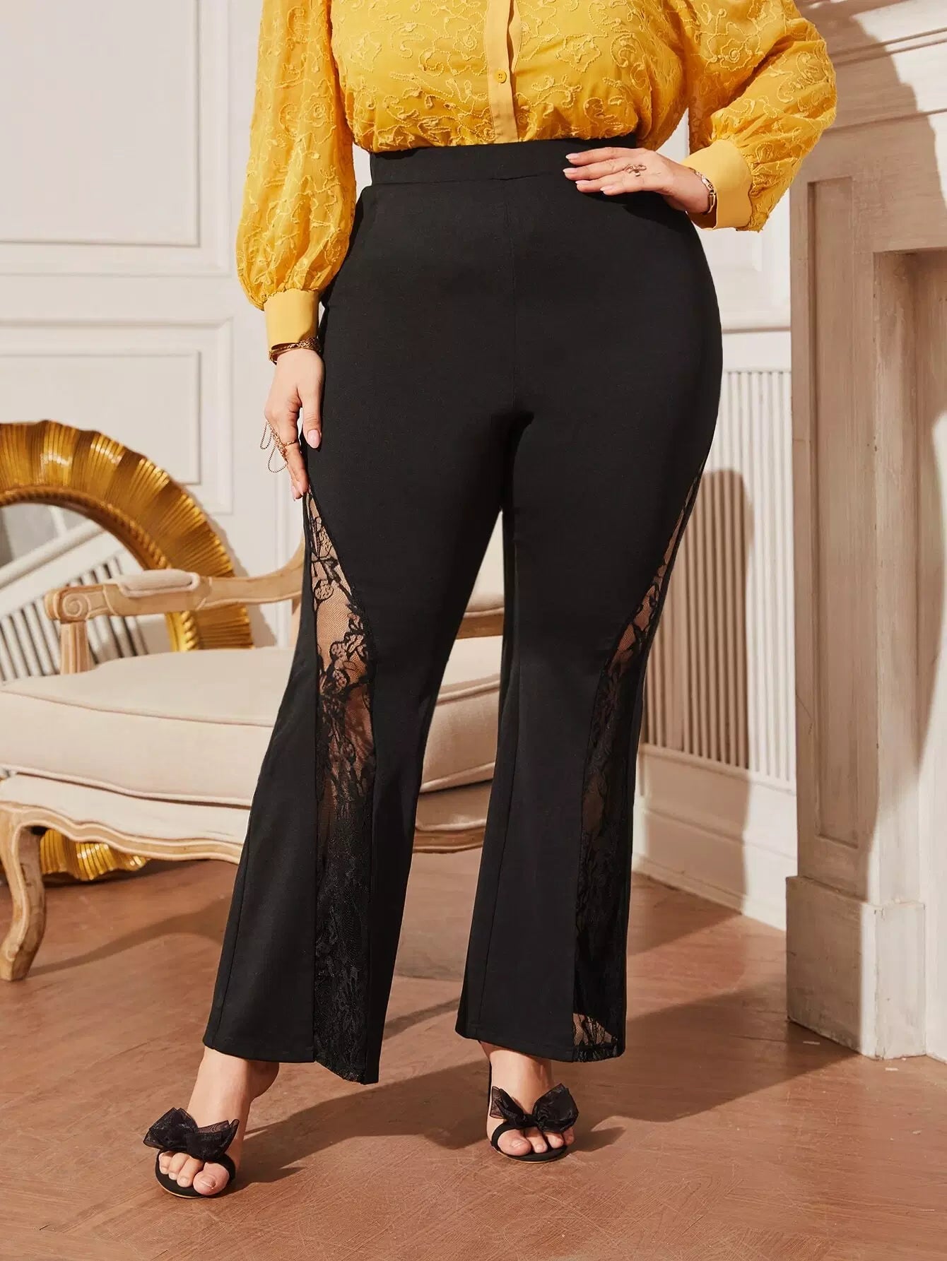 بنطلون ذو خصر عالٍ زائد بحشوة دانتيل بأرجل واسعة