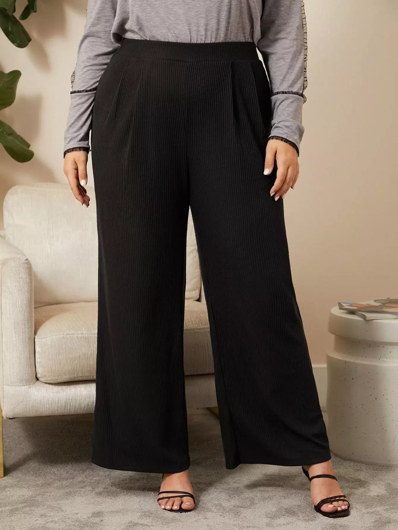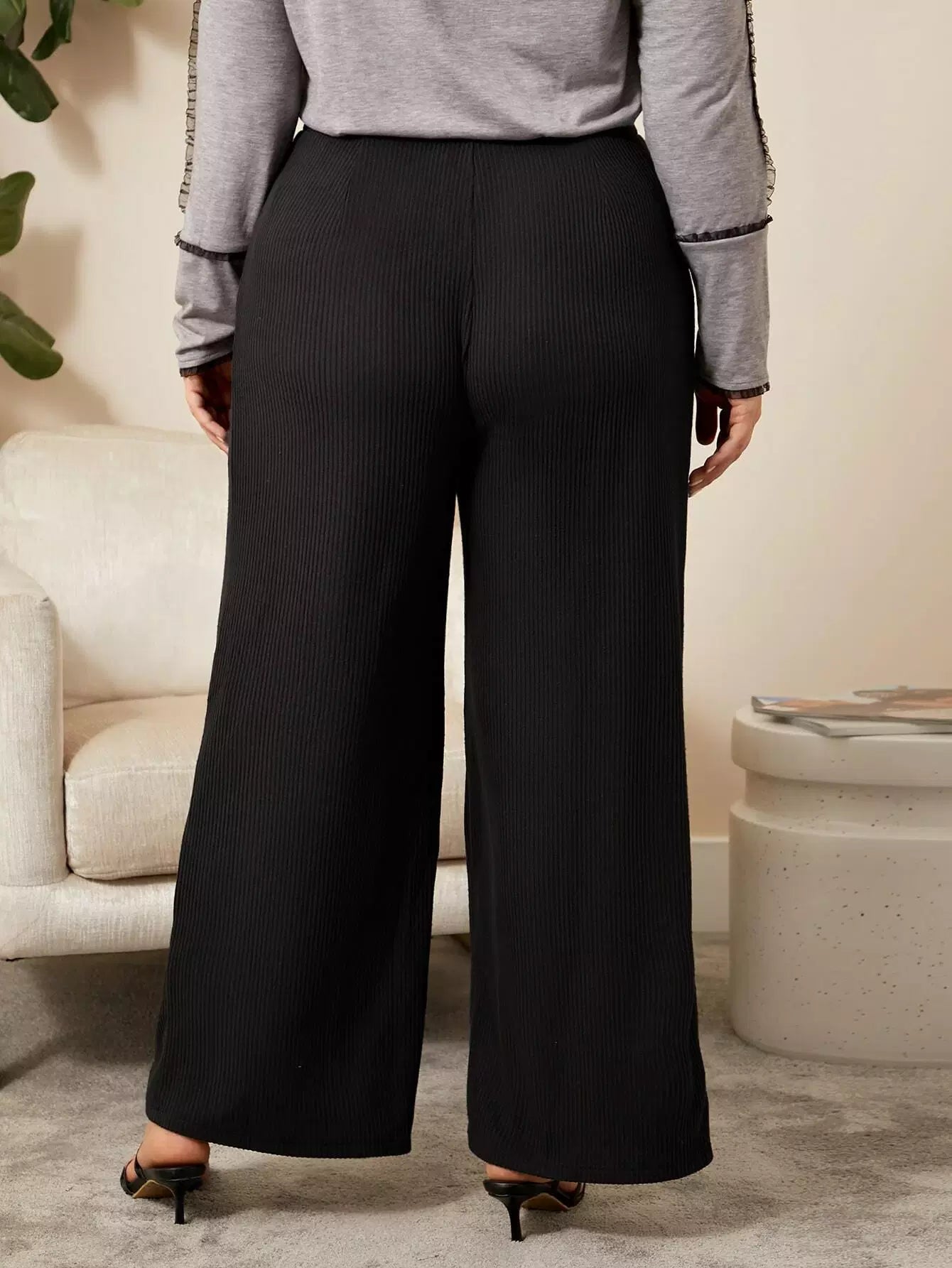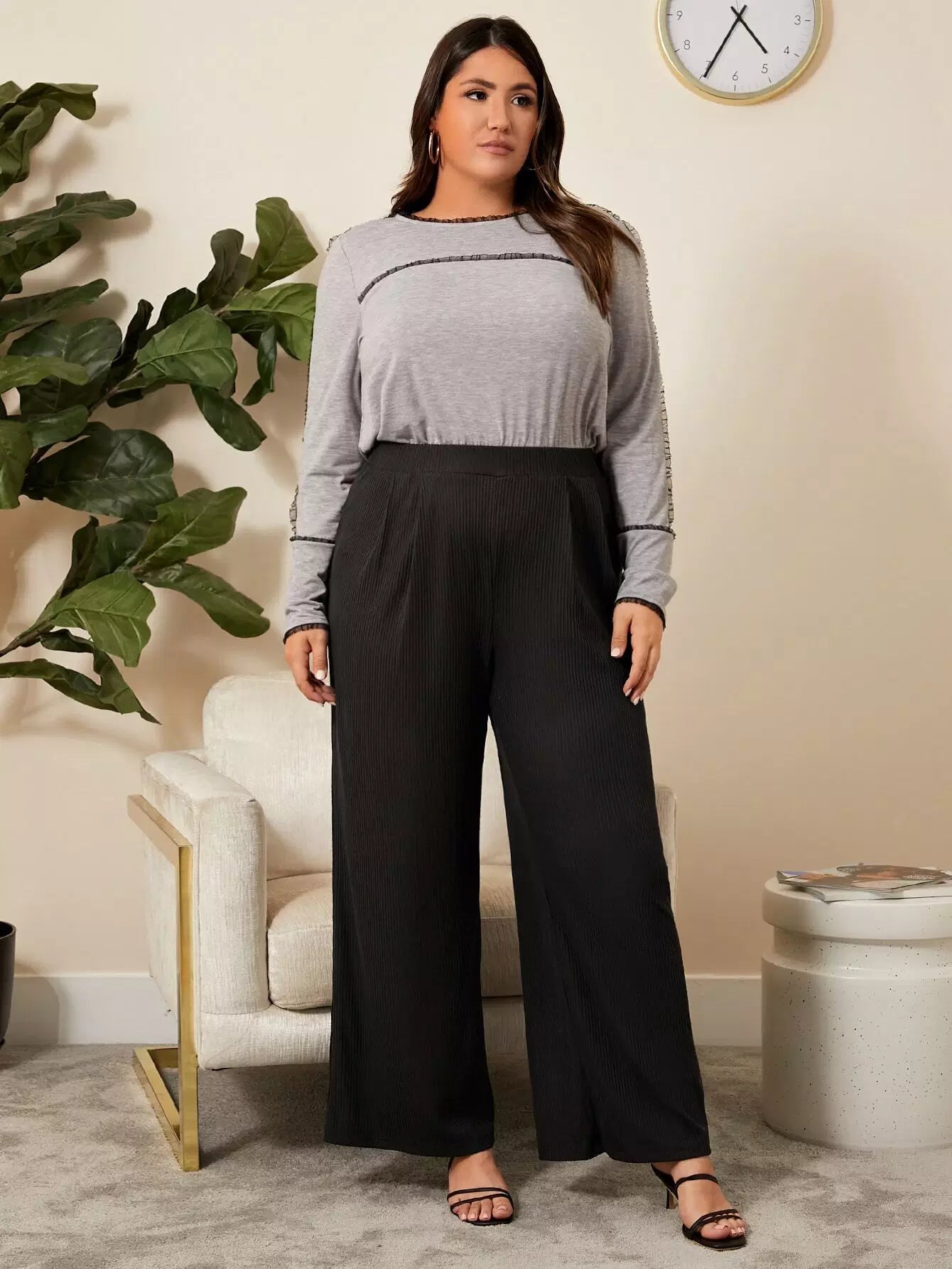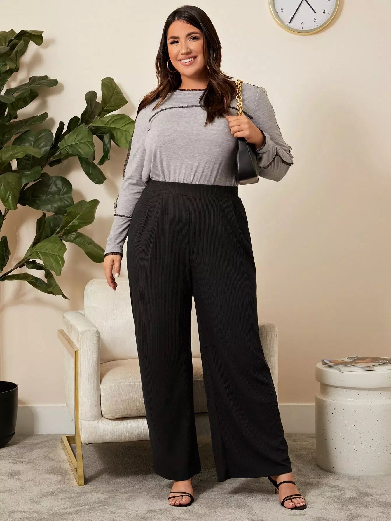 بنطلون سادة عالي الخصر عريض الساقين سادة بلس