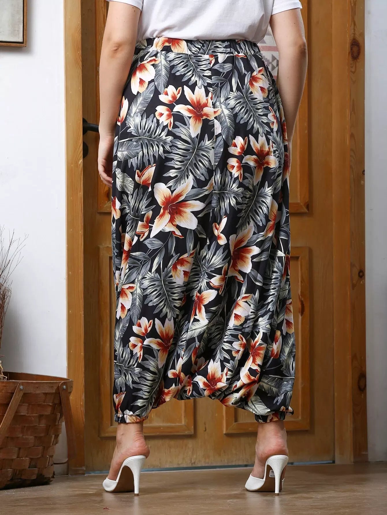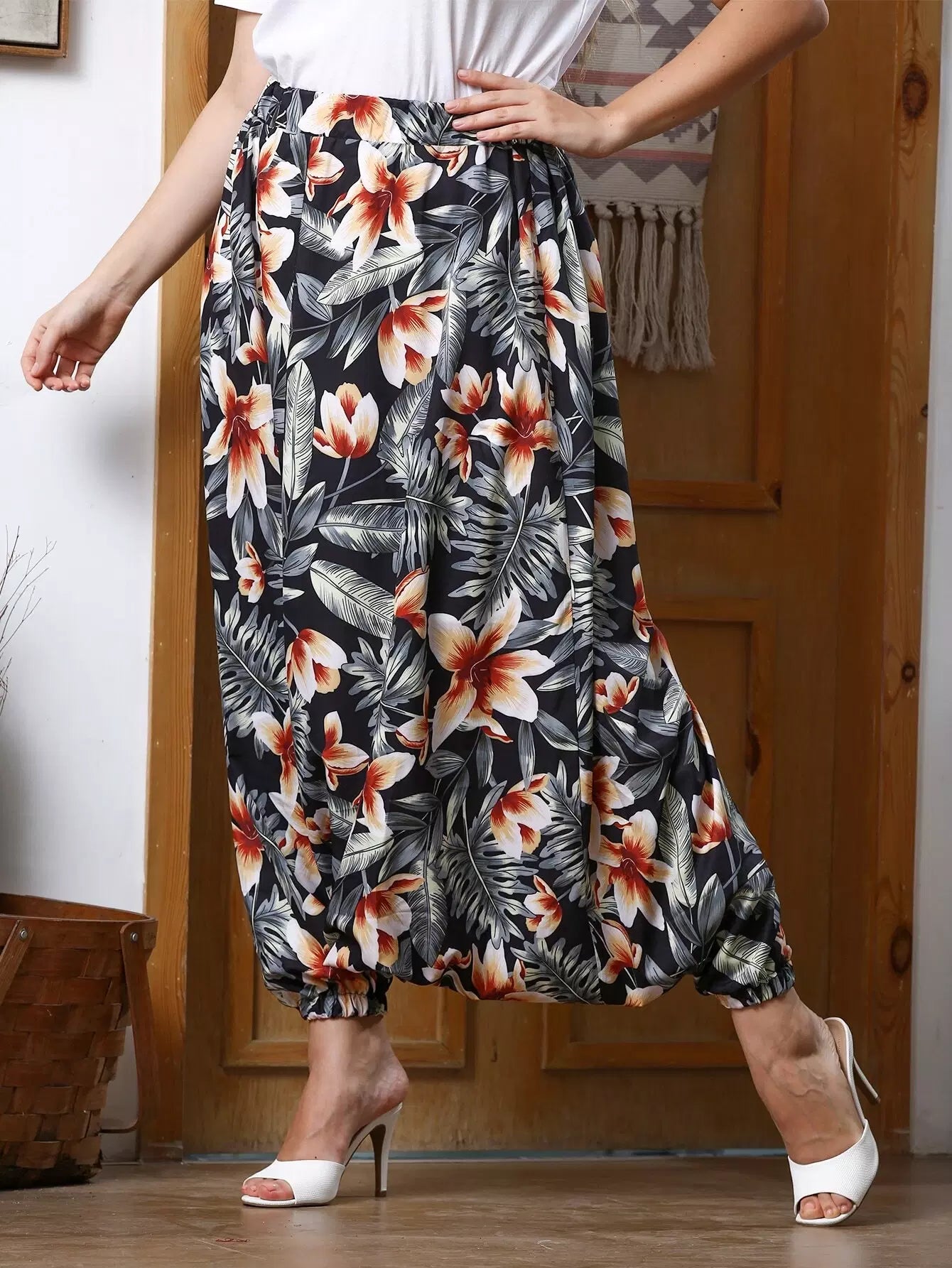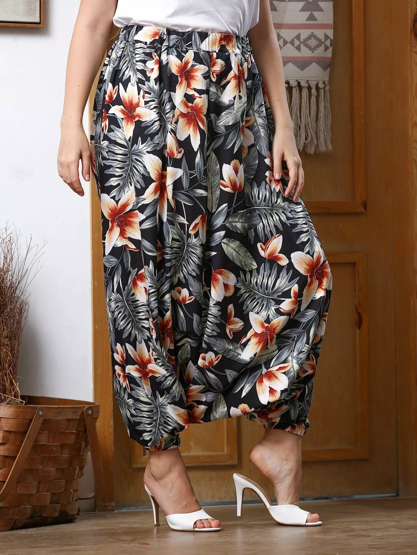 بنطلون بطبعة استوائية منسدلة منسدلة من الأعلى