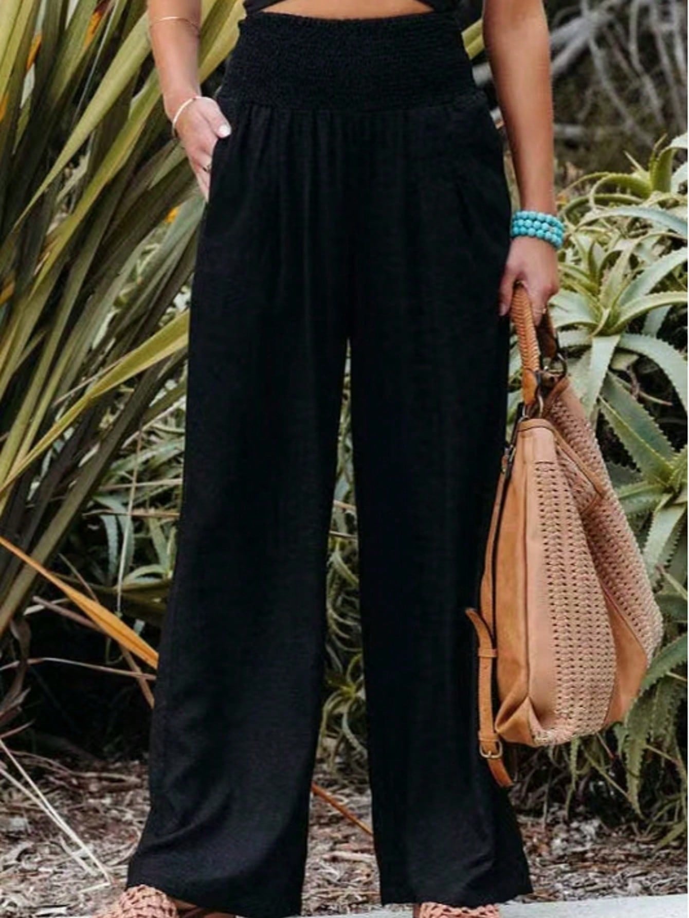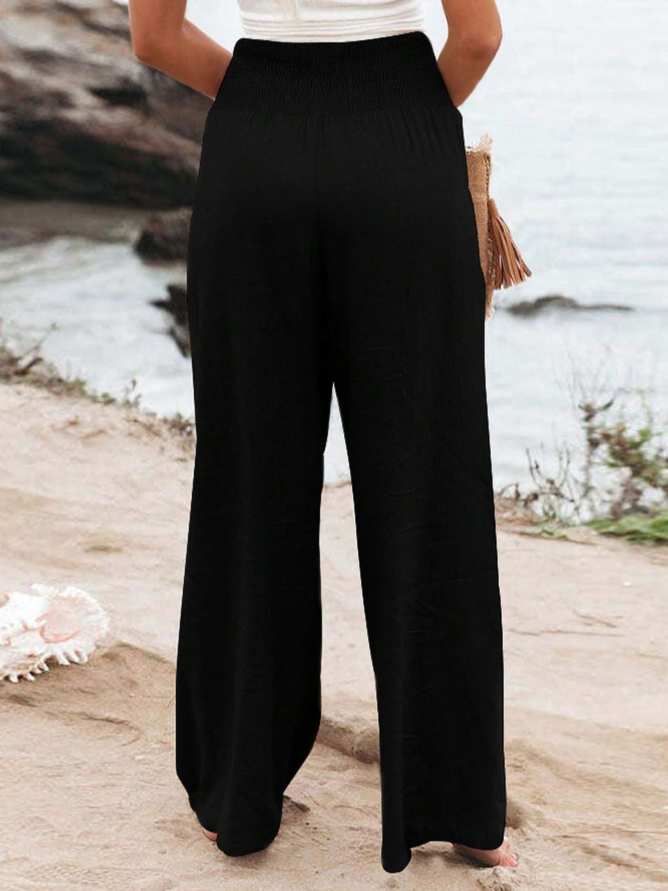 بنطلون نسائي بسيط واسع الساقين بمقاسات كبيرة مع جيوب مائلة