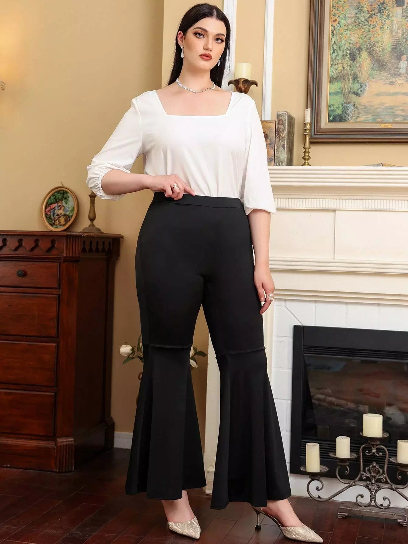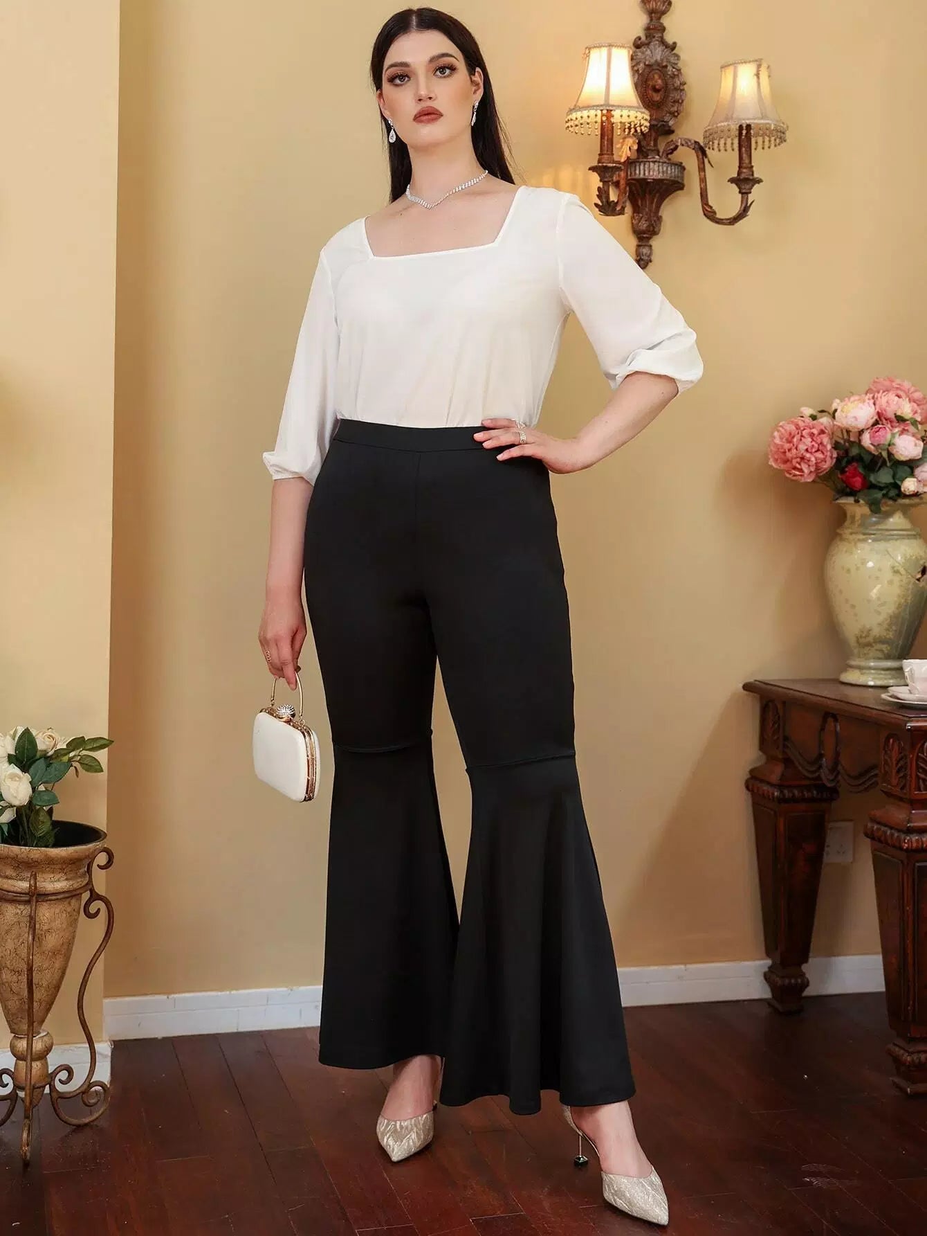 بنطلون بخصر عالٍ واسع واسع الساقين زائد الخصر