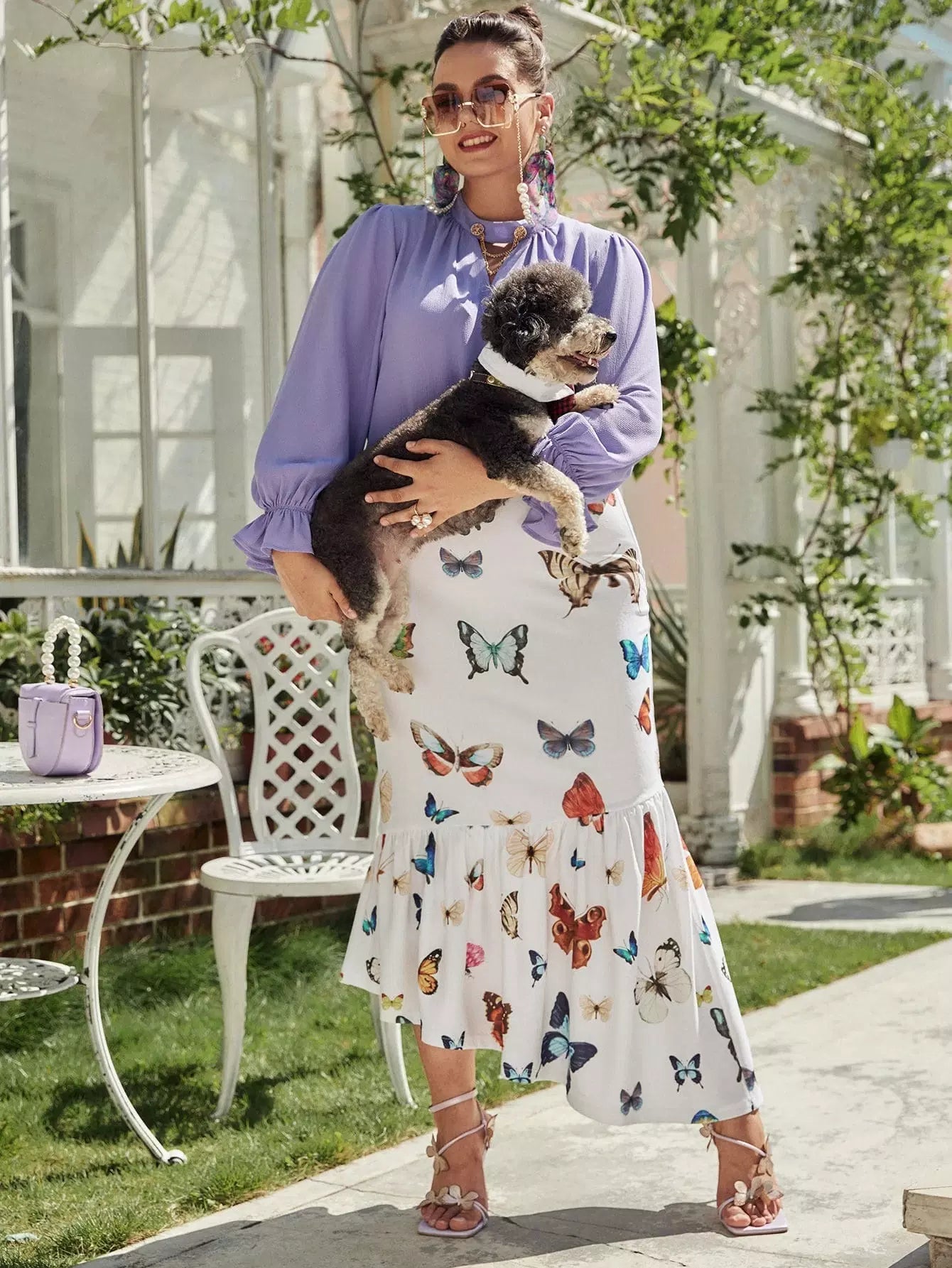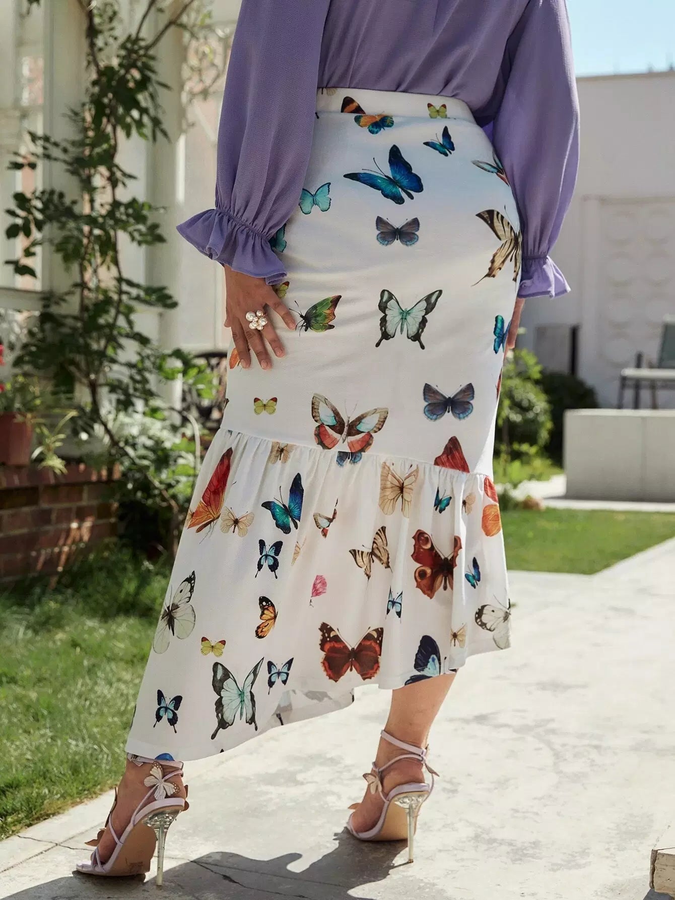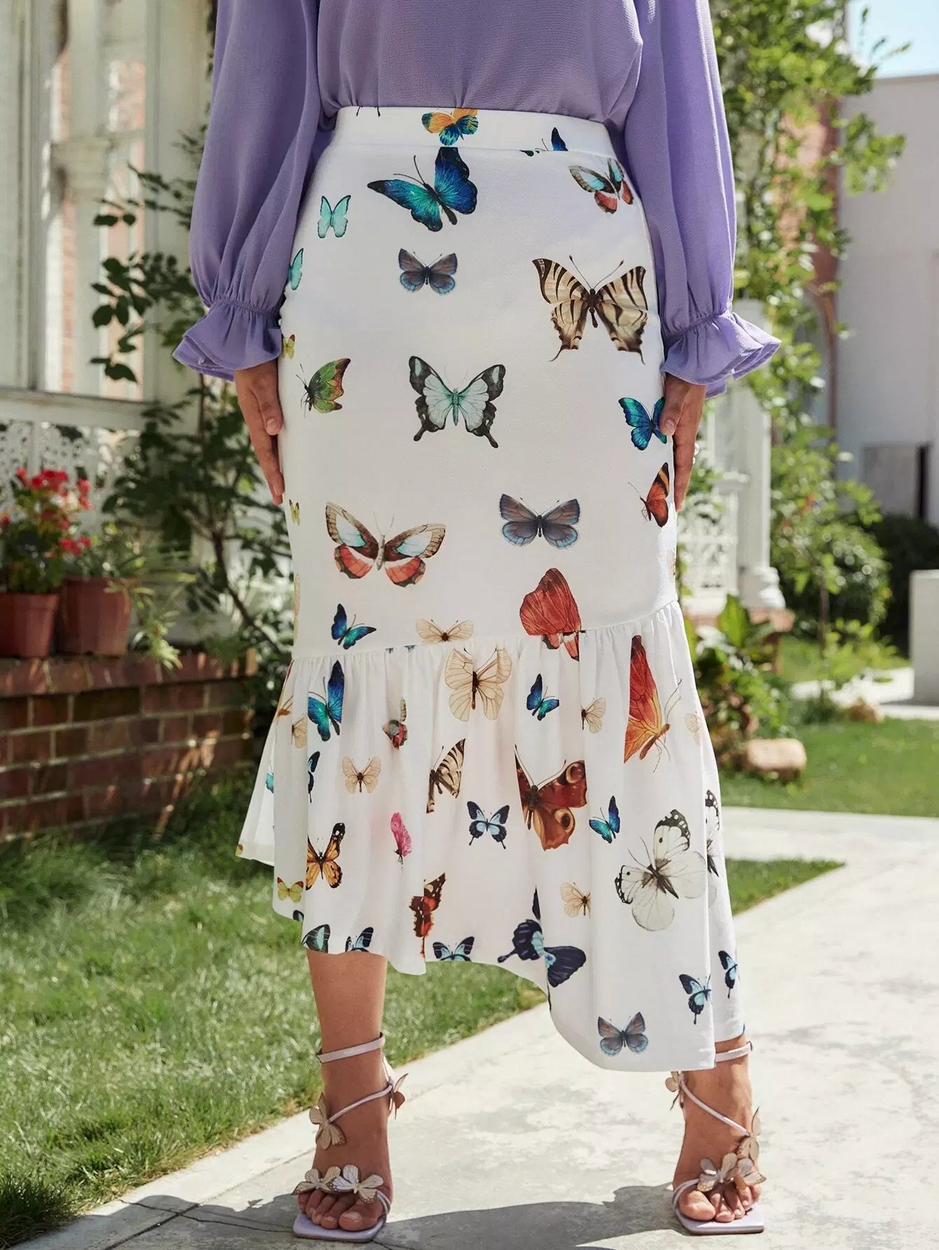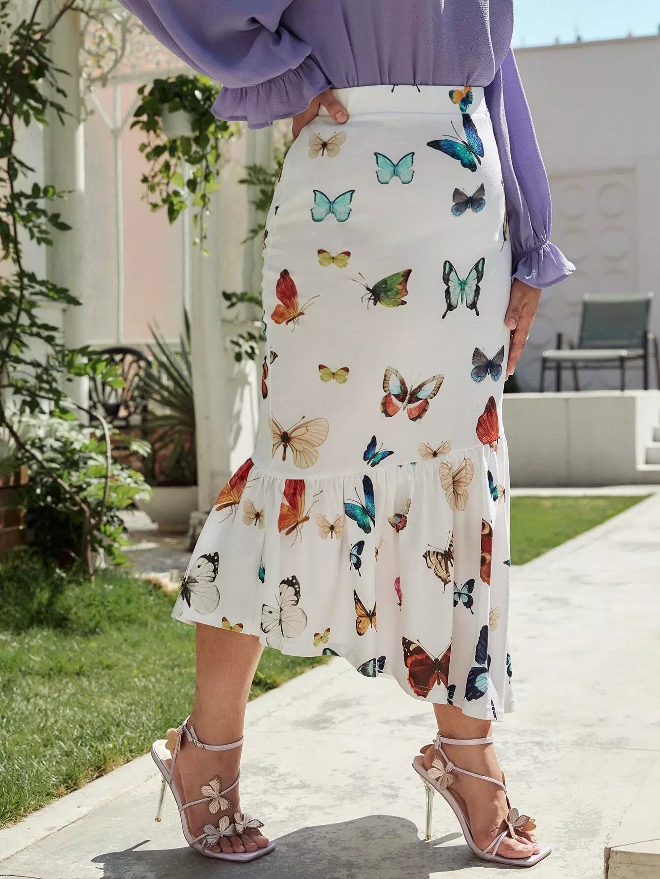 تنورة بحاشية ذيل سمكة مطبوع عليها فراشات زائد