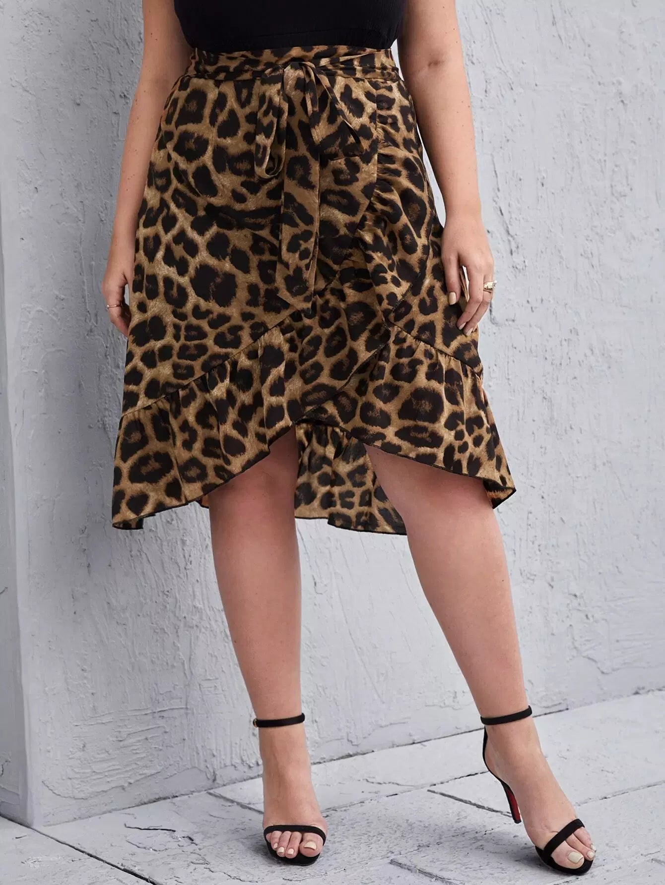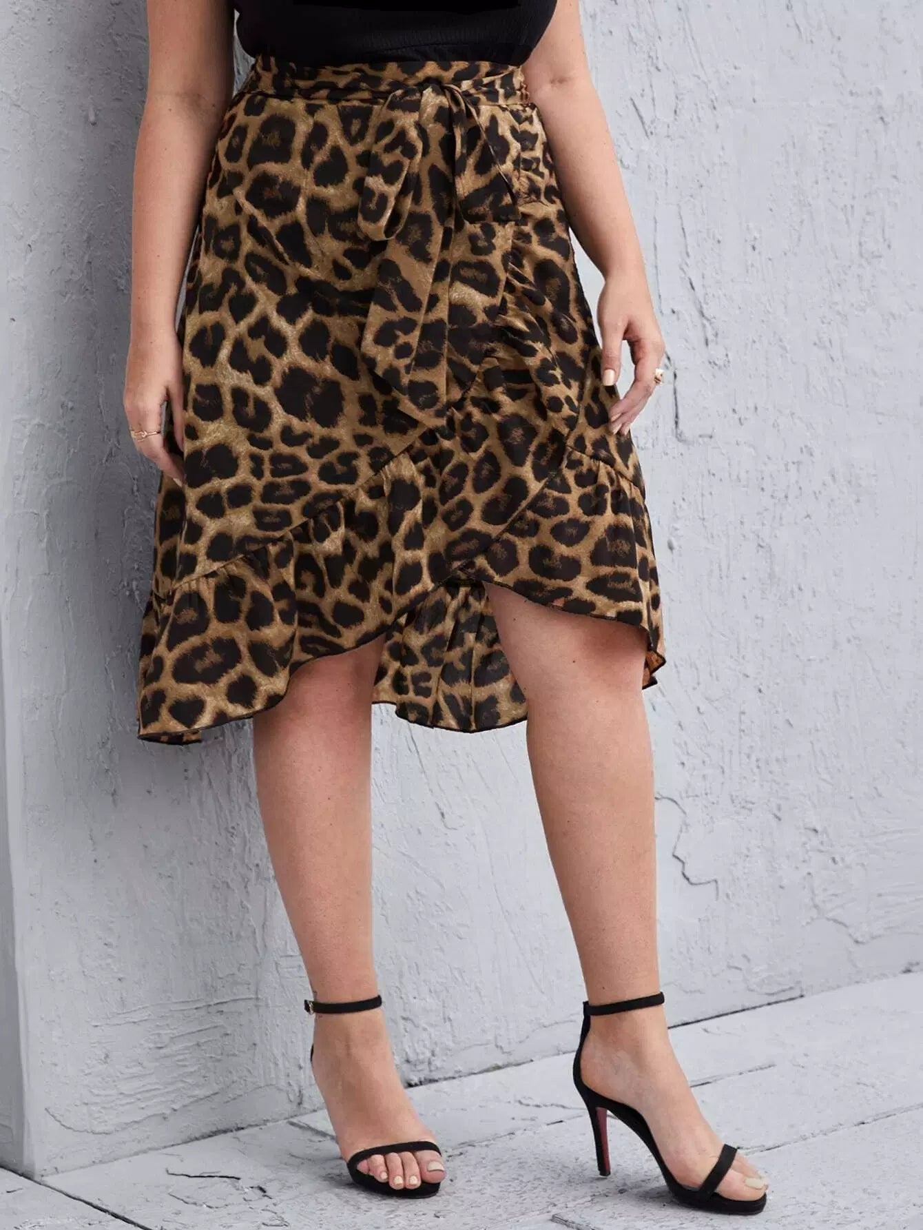 بالإضافة إلى تنورة بحاشية ملفوفة مكشكشة بطباعة جلد الفهد بدون حزام