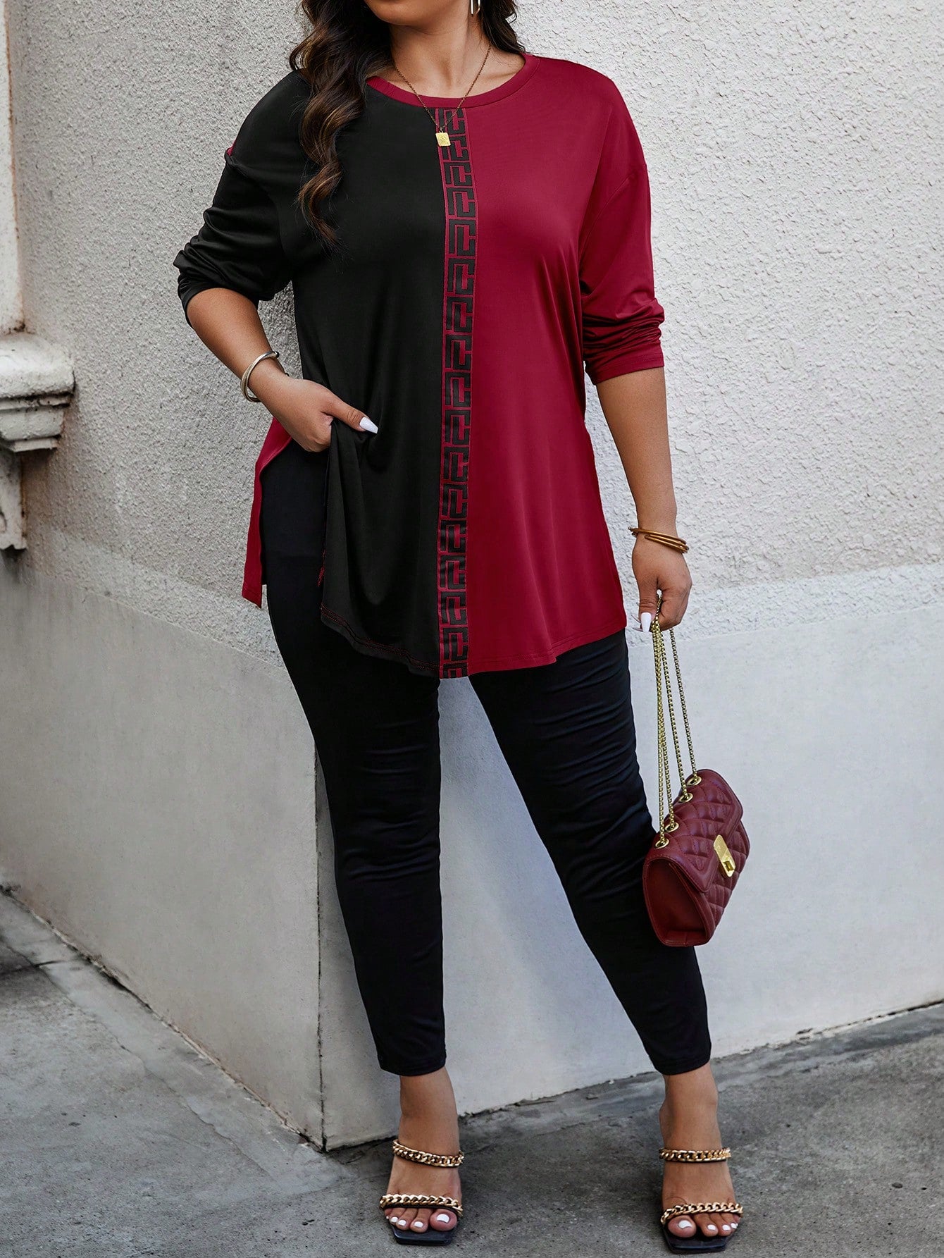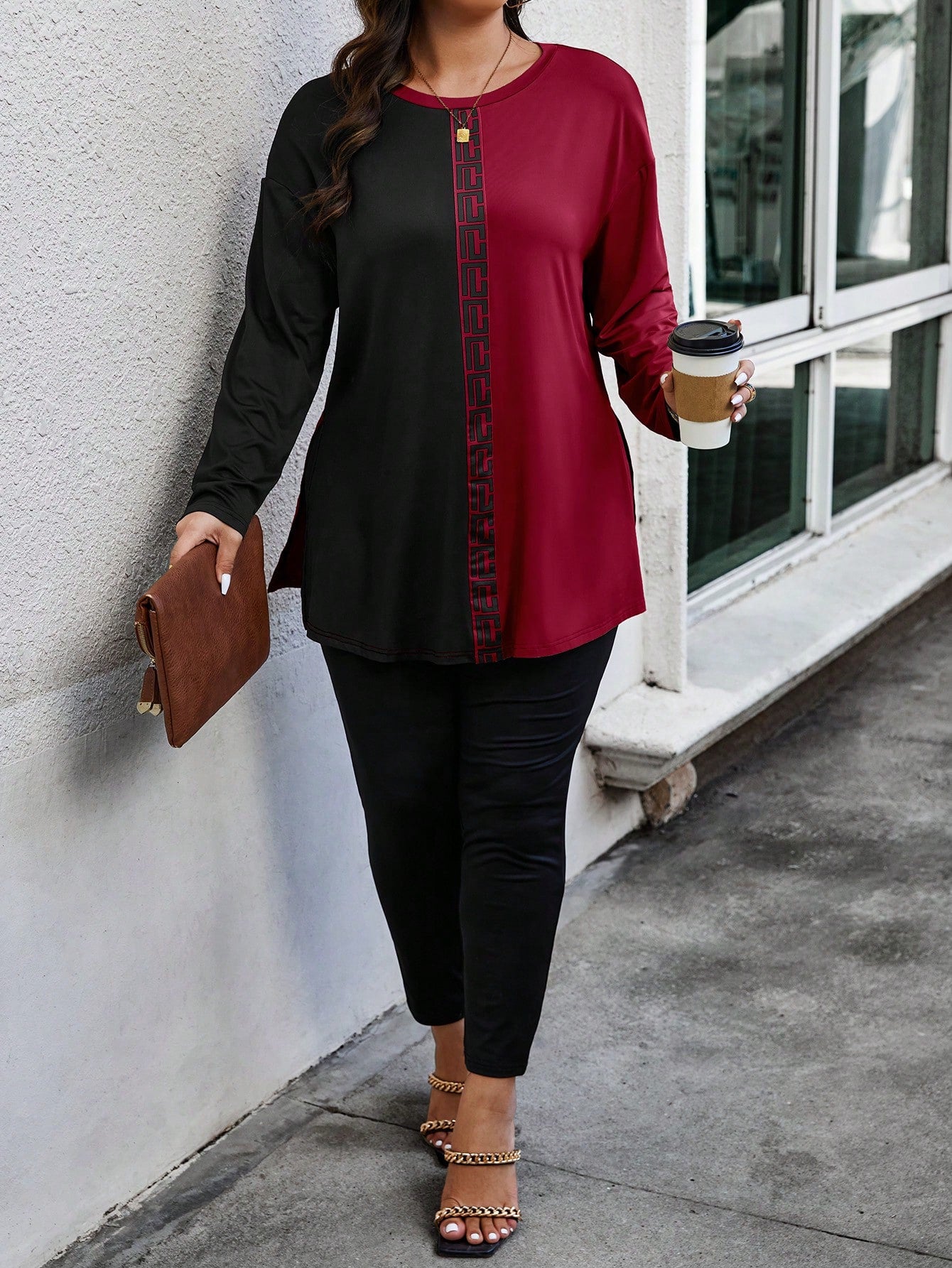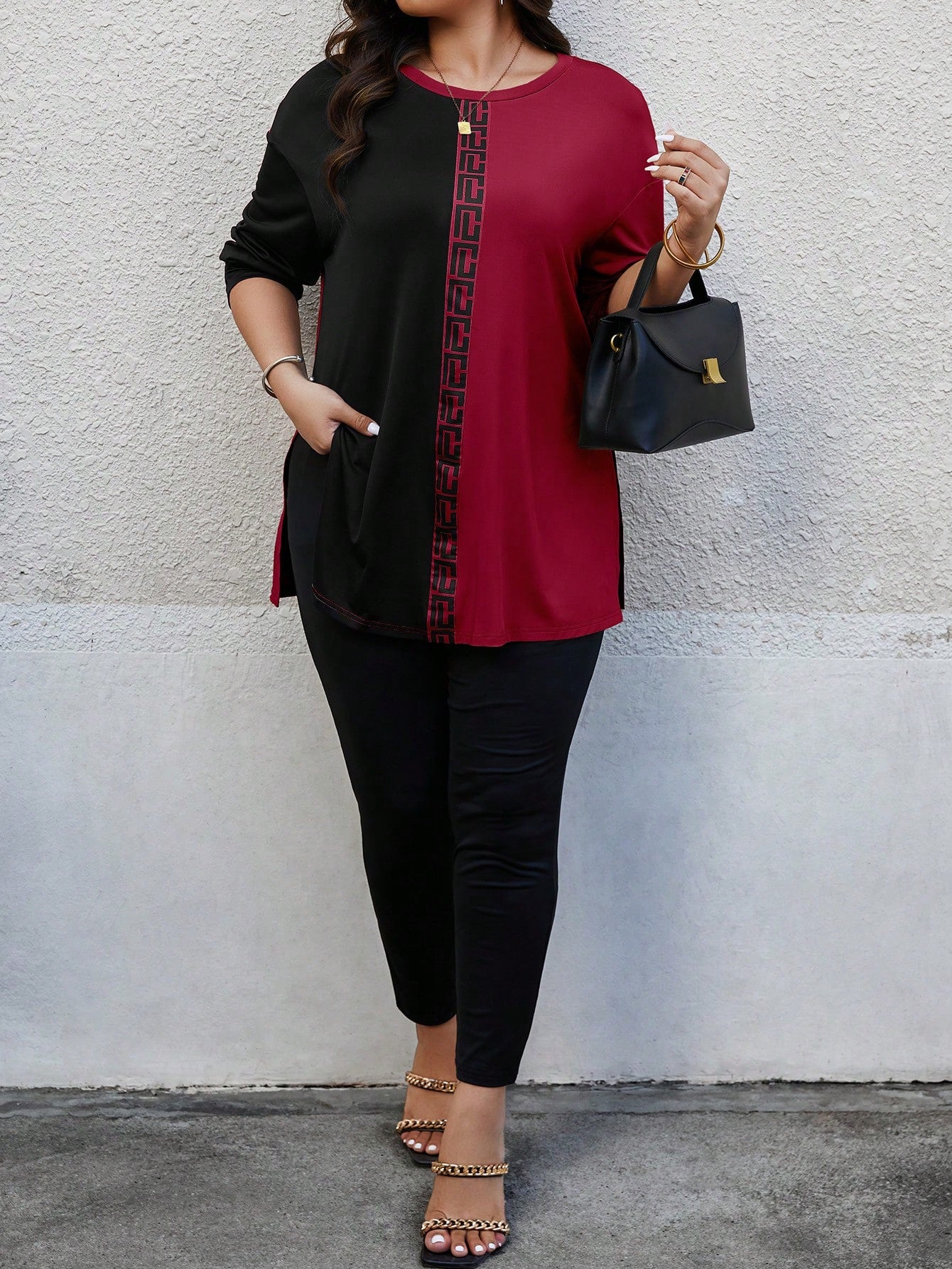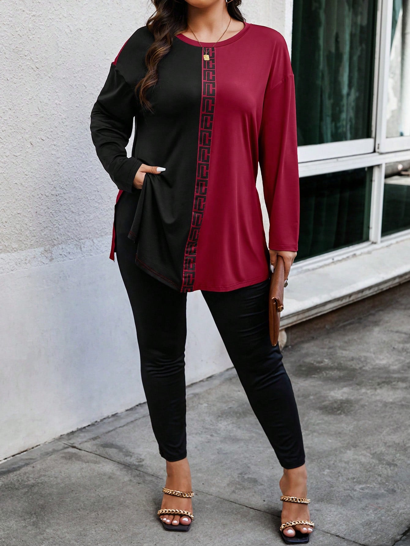 EMERY ROSE Plus Size Random Geometric Print Women Crew Neck Long Sleeve T-Shirt And Pants Casual 2 Pieces