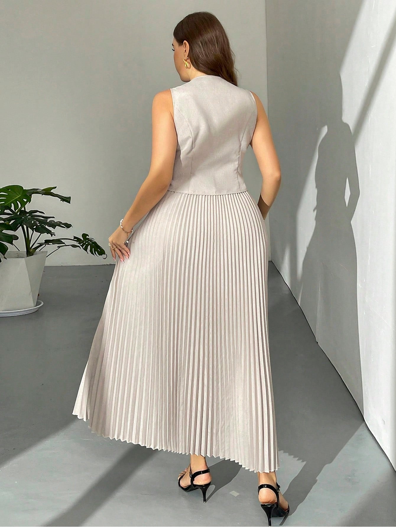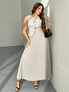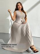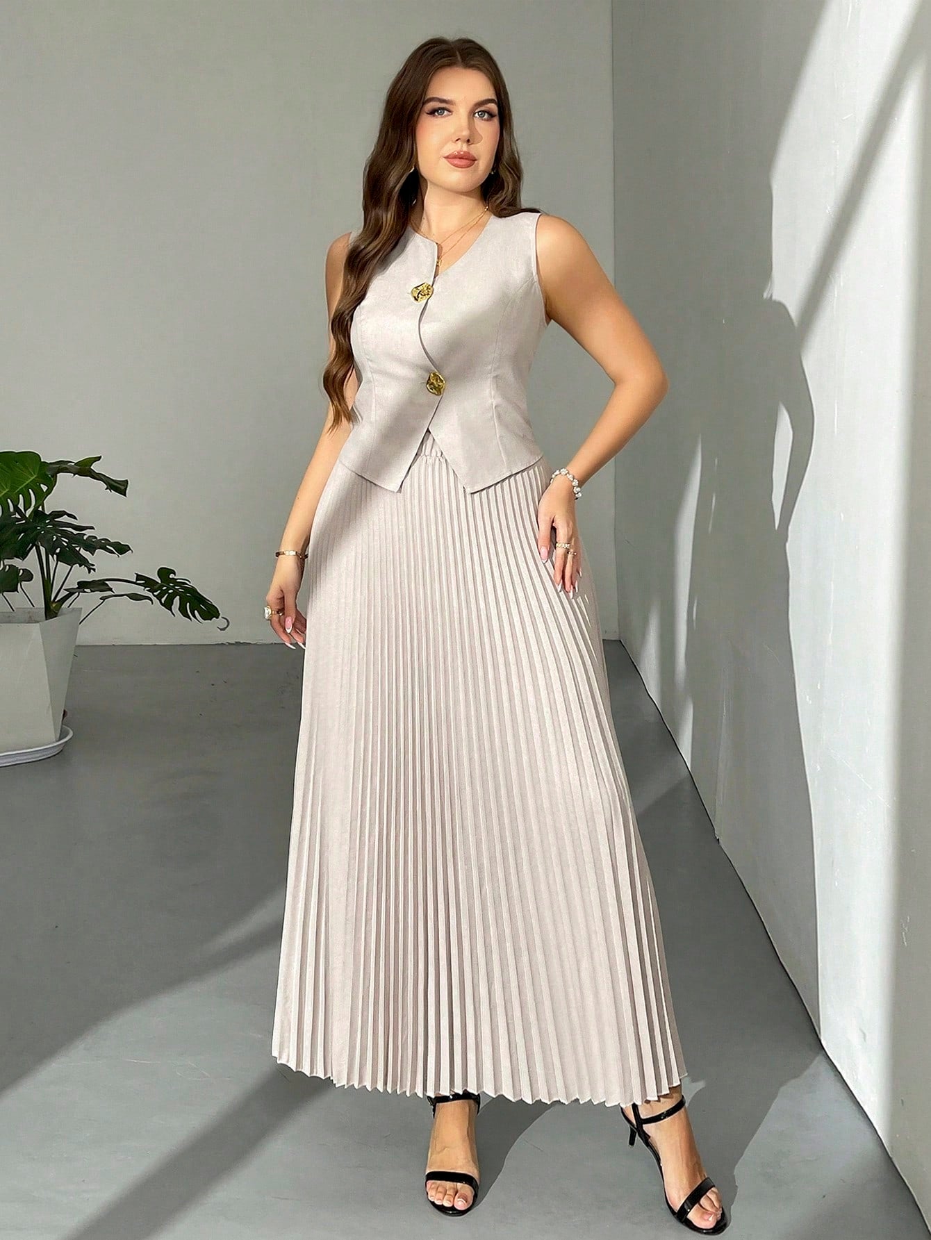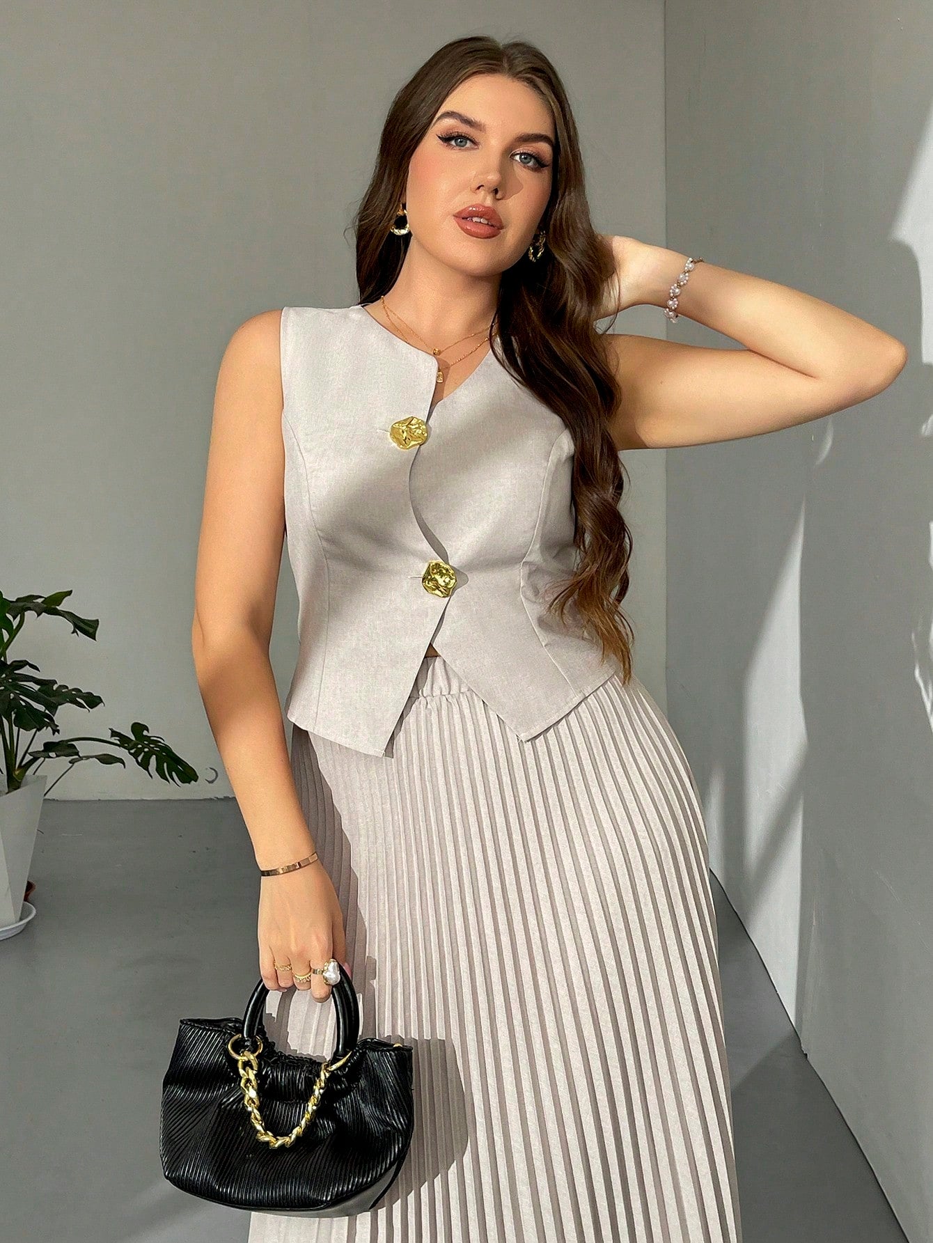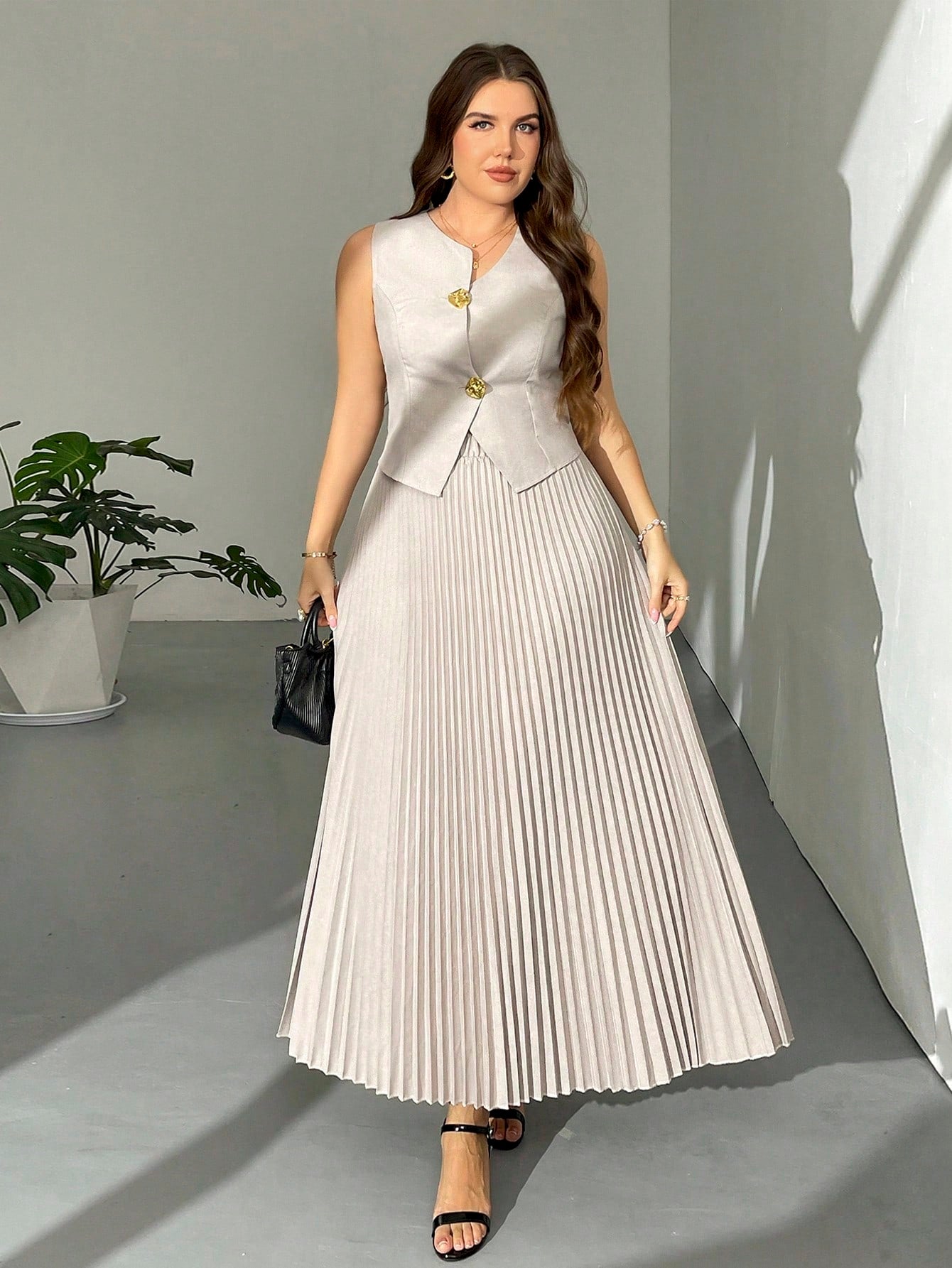 Firerie Plus Size Women's Elegant "Prive" Asymmetric Metal Button Pleated Skirt And French Vest Two Pieces