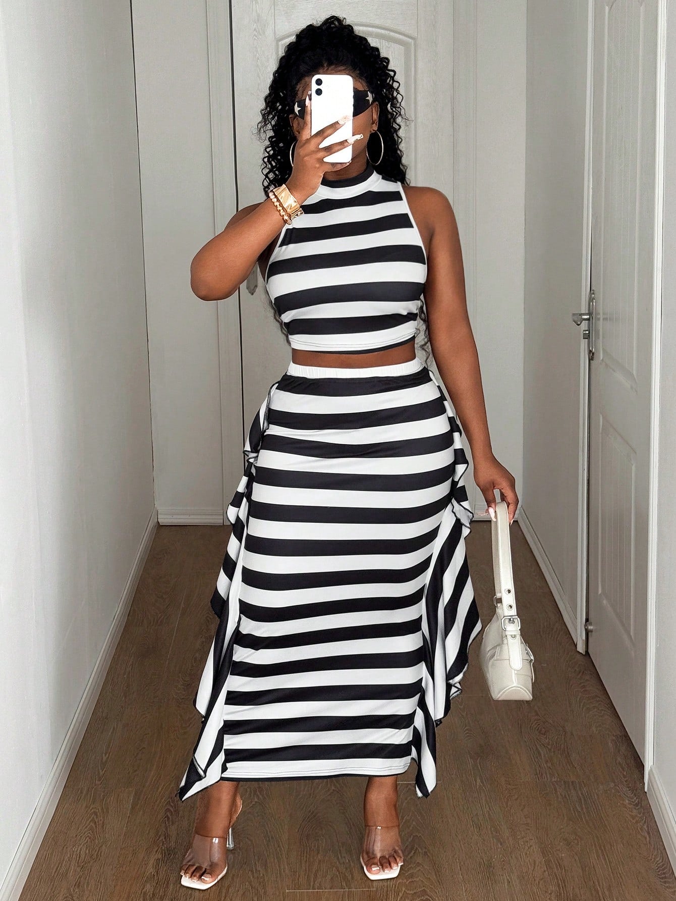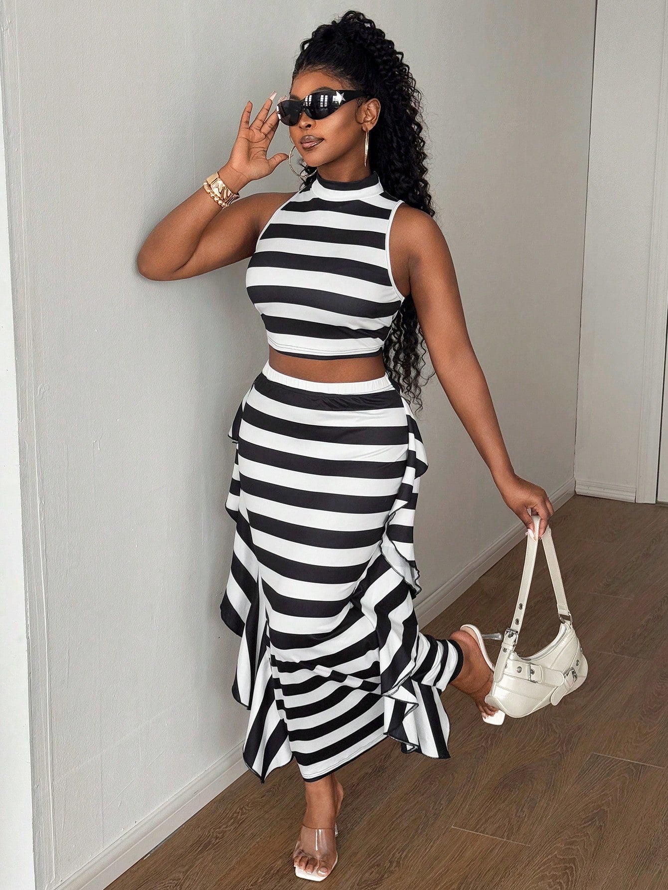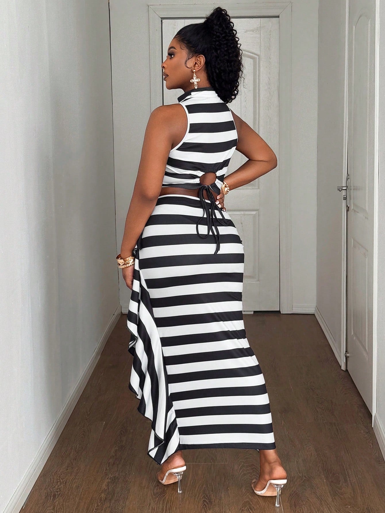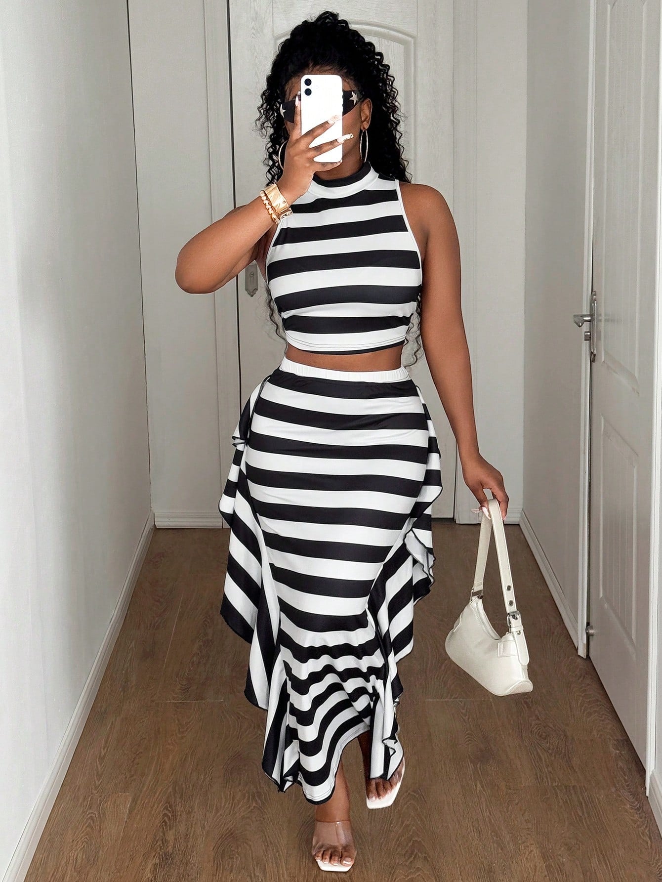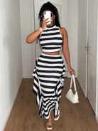 طقم ماوي للنساء بمقاسات كبيرة، بلوزة مخططة بدون أكمام مع تنورة قصيرة، قطعتين