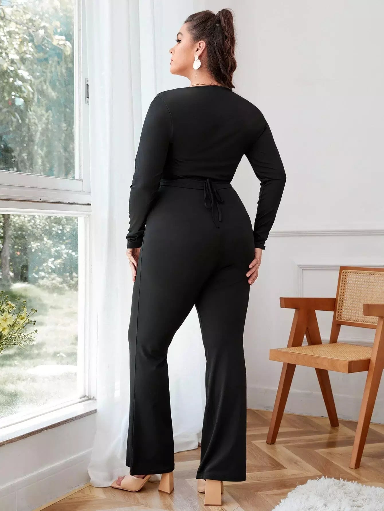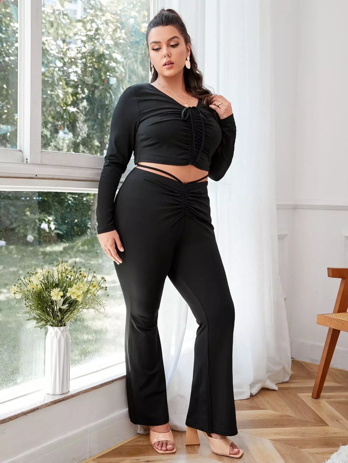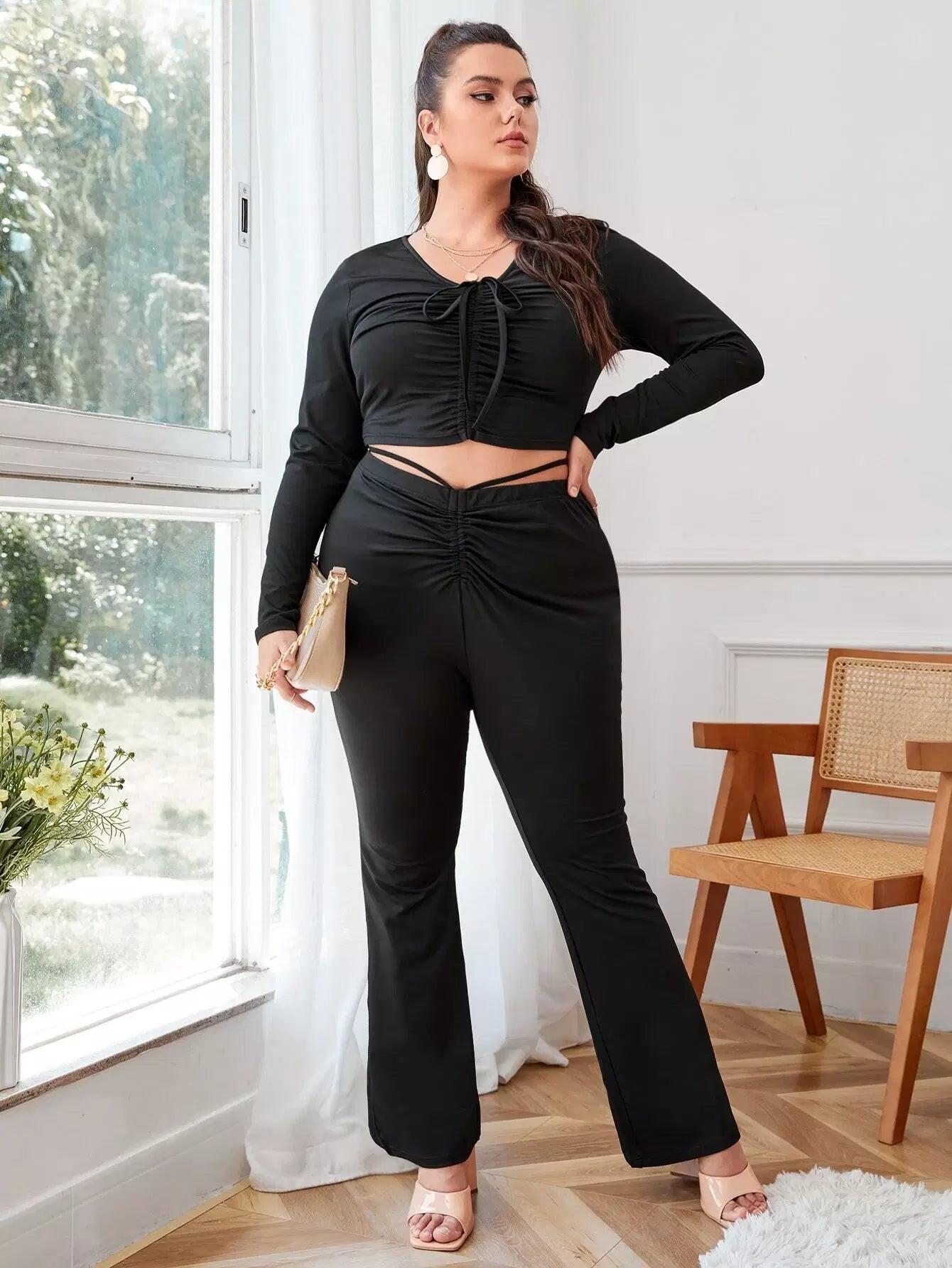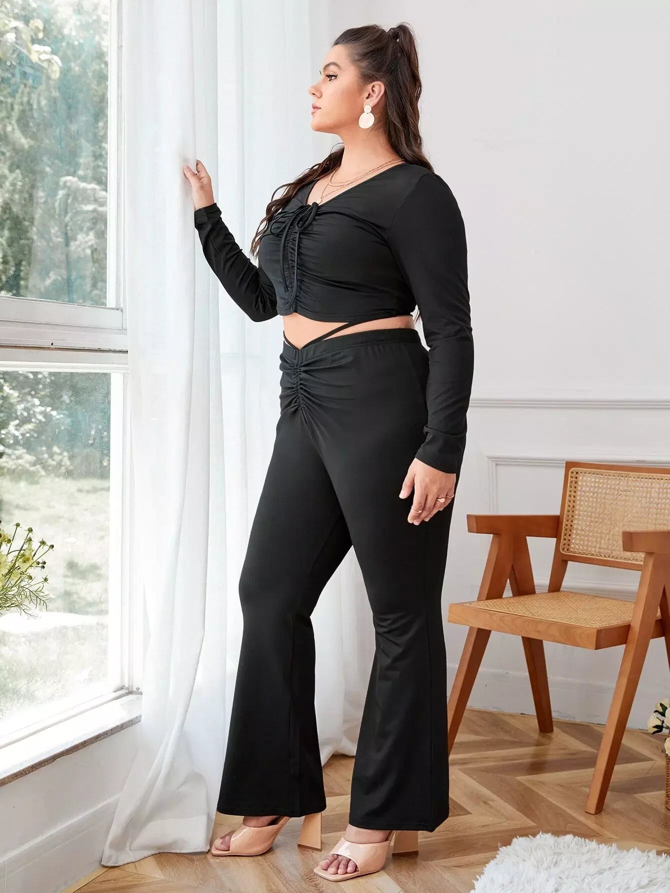 بلوزة ضيقة برباط بلاس قصير وبنطلون بساق واسعة برباط من الخلف