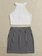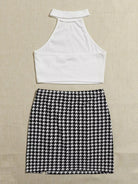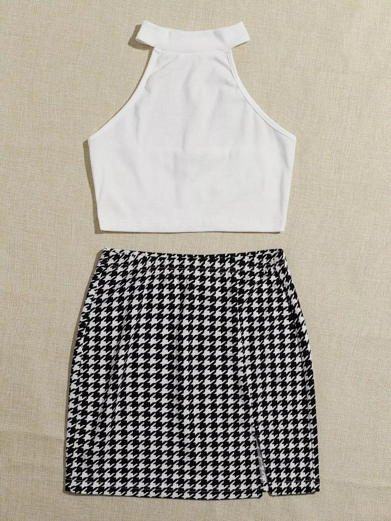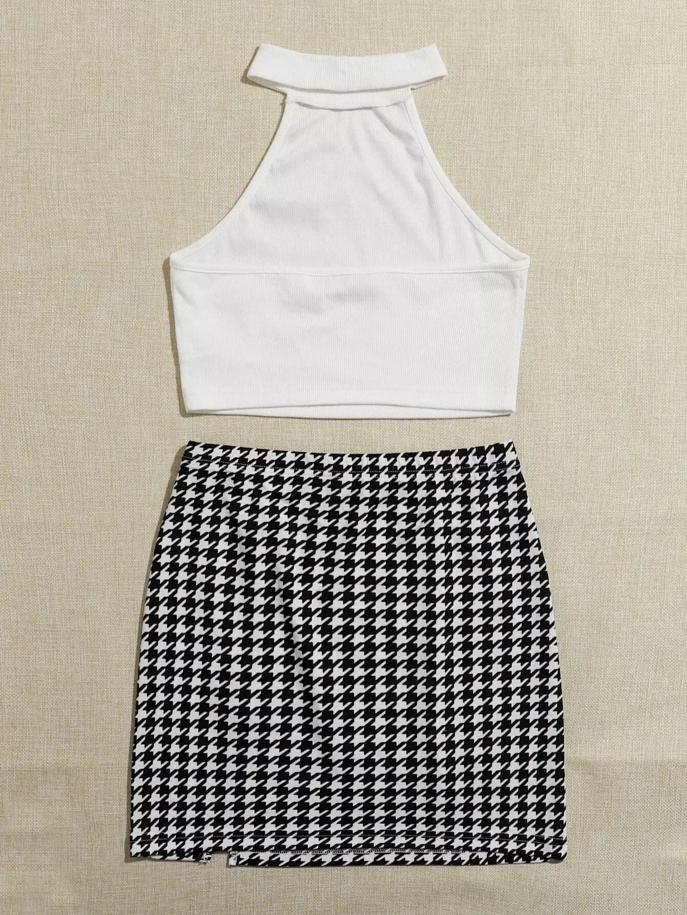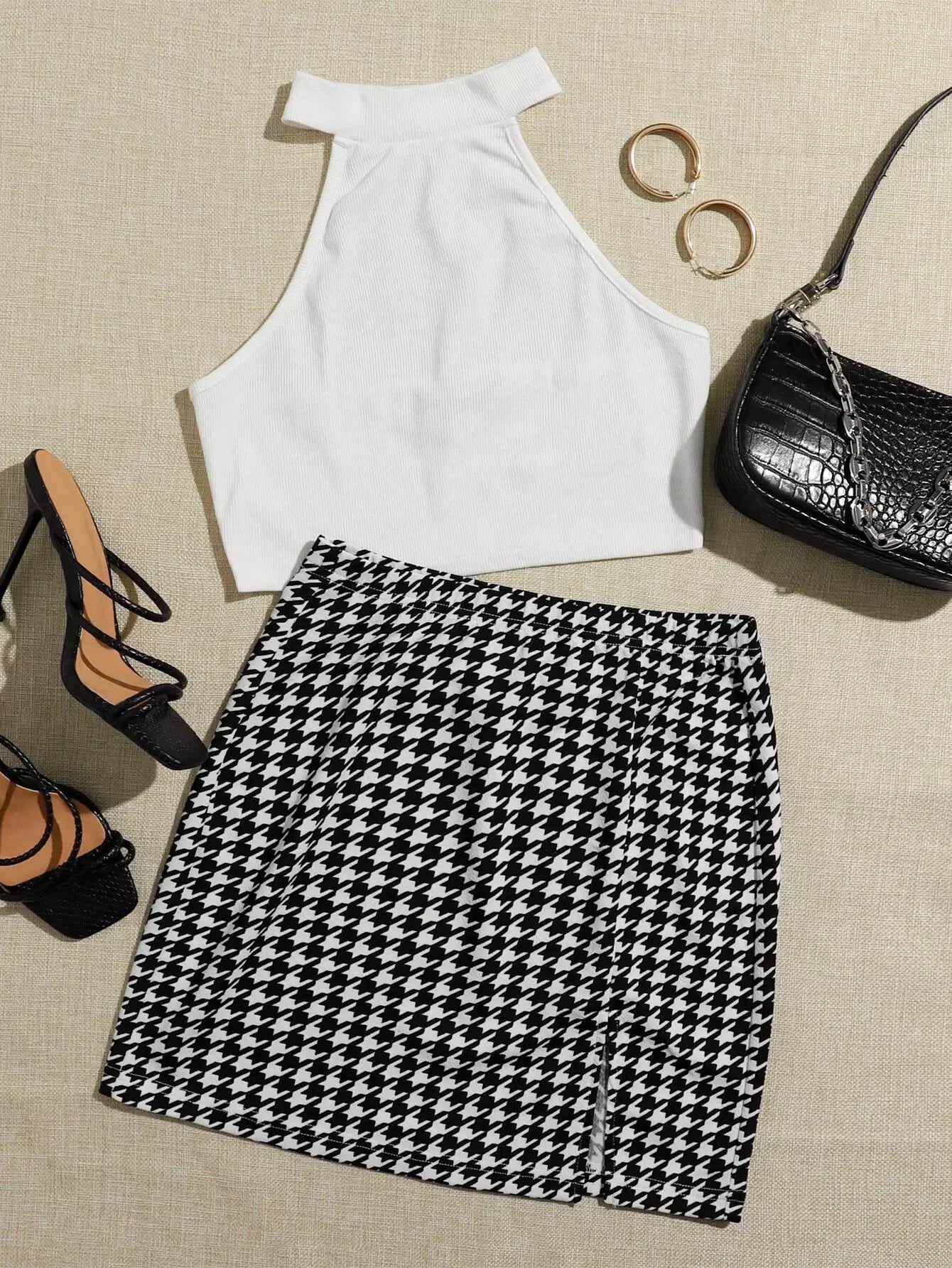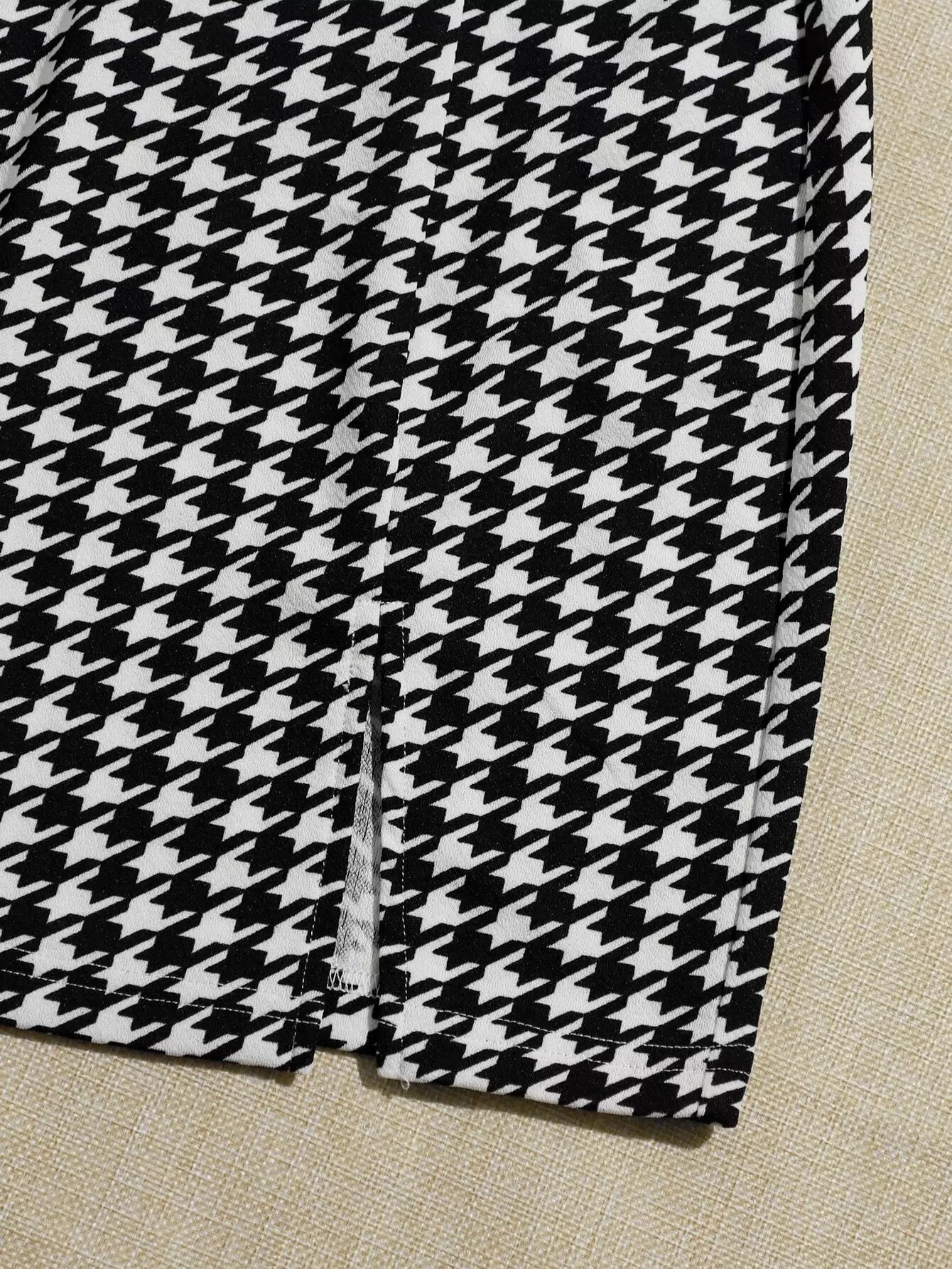 طقم بلوزة بفتحة رسن بلس وتنورة بحافة منقسمة بقصّة هاوندستوث