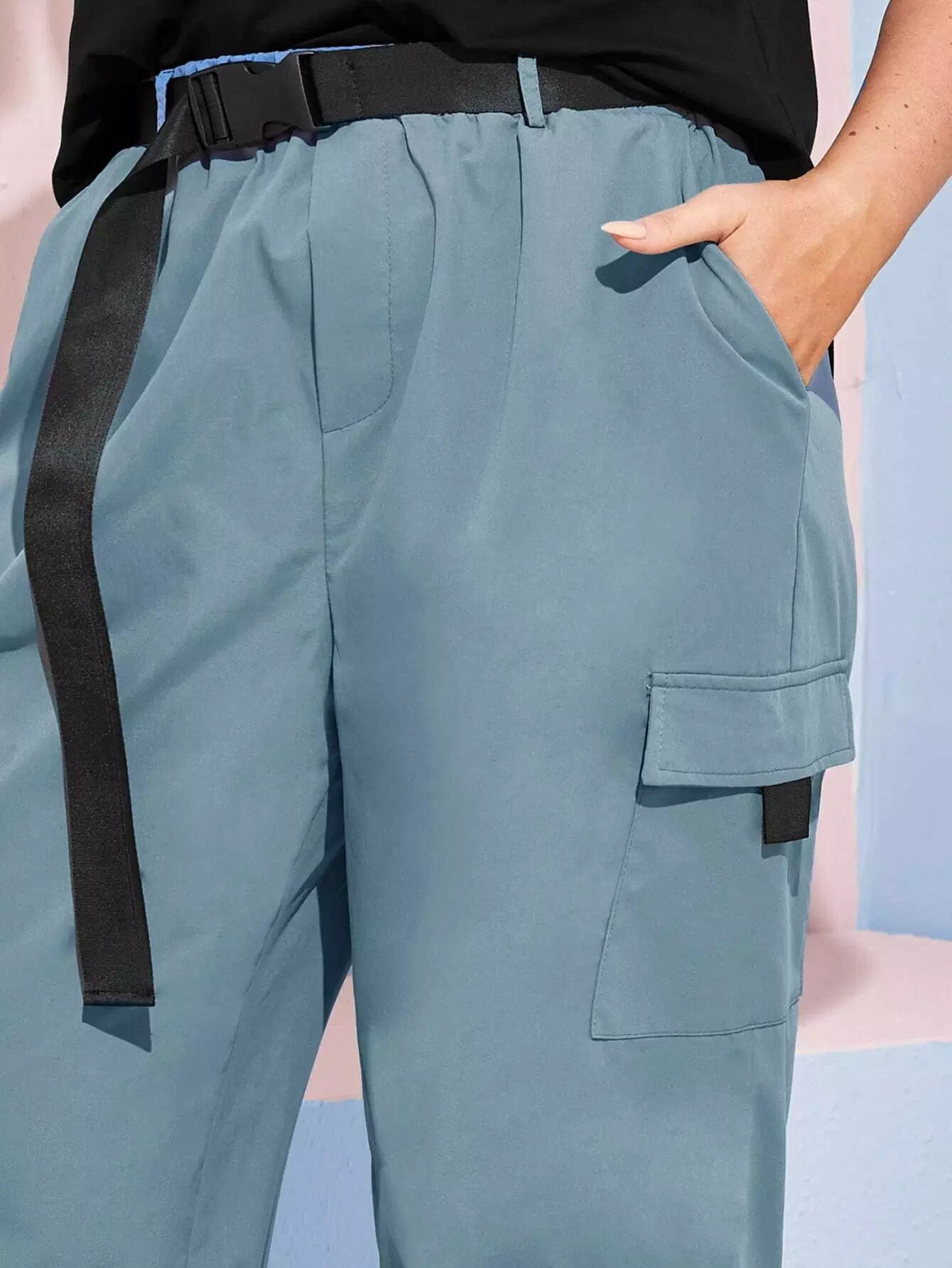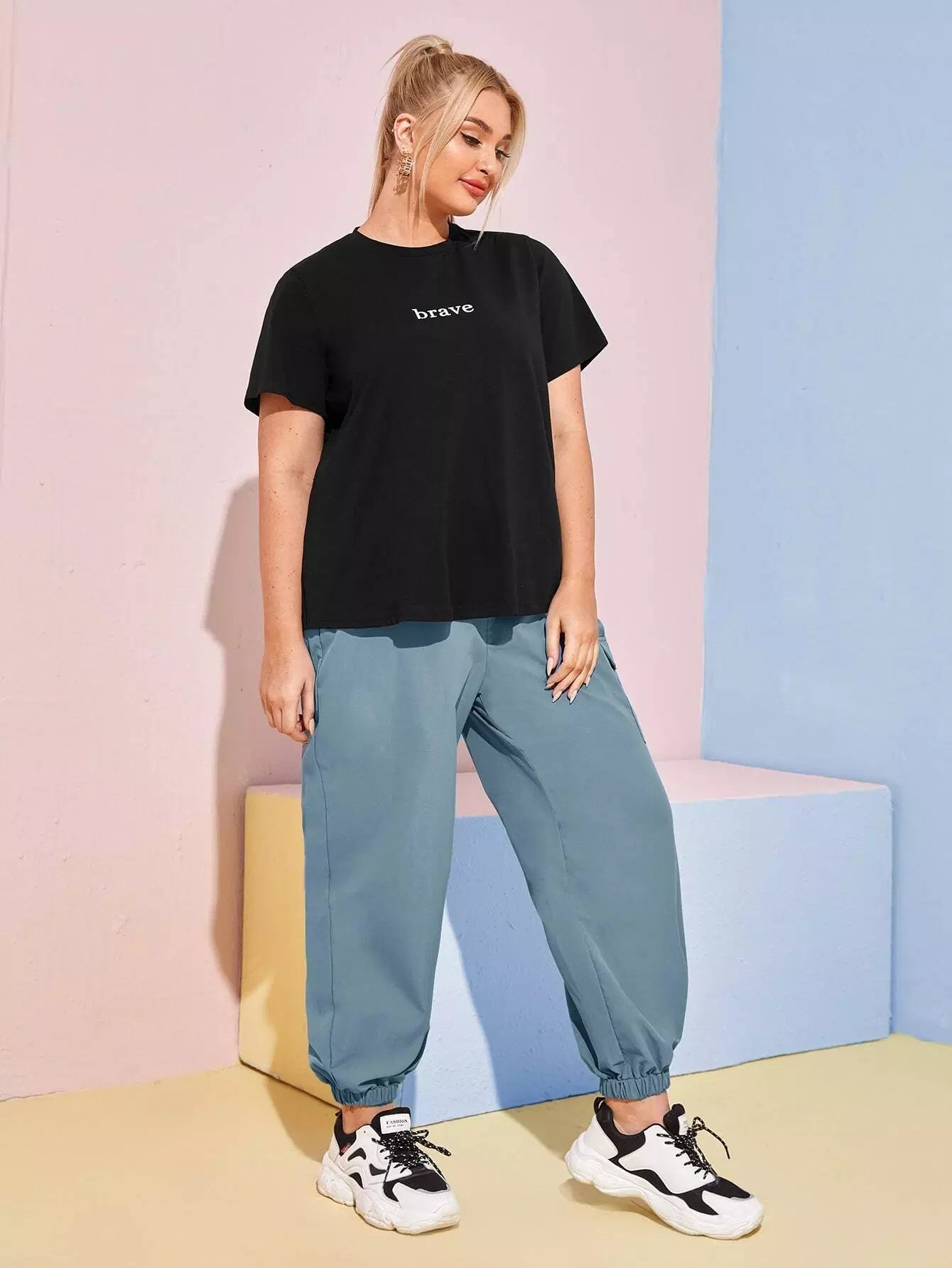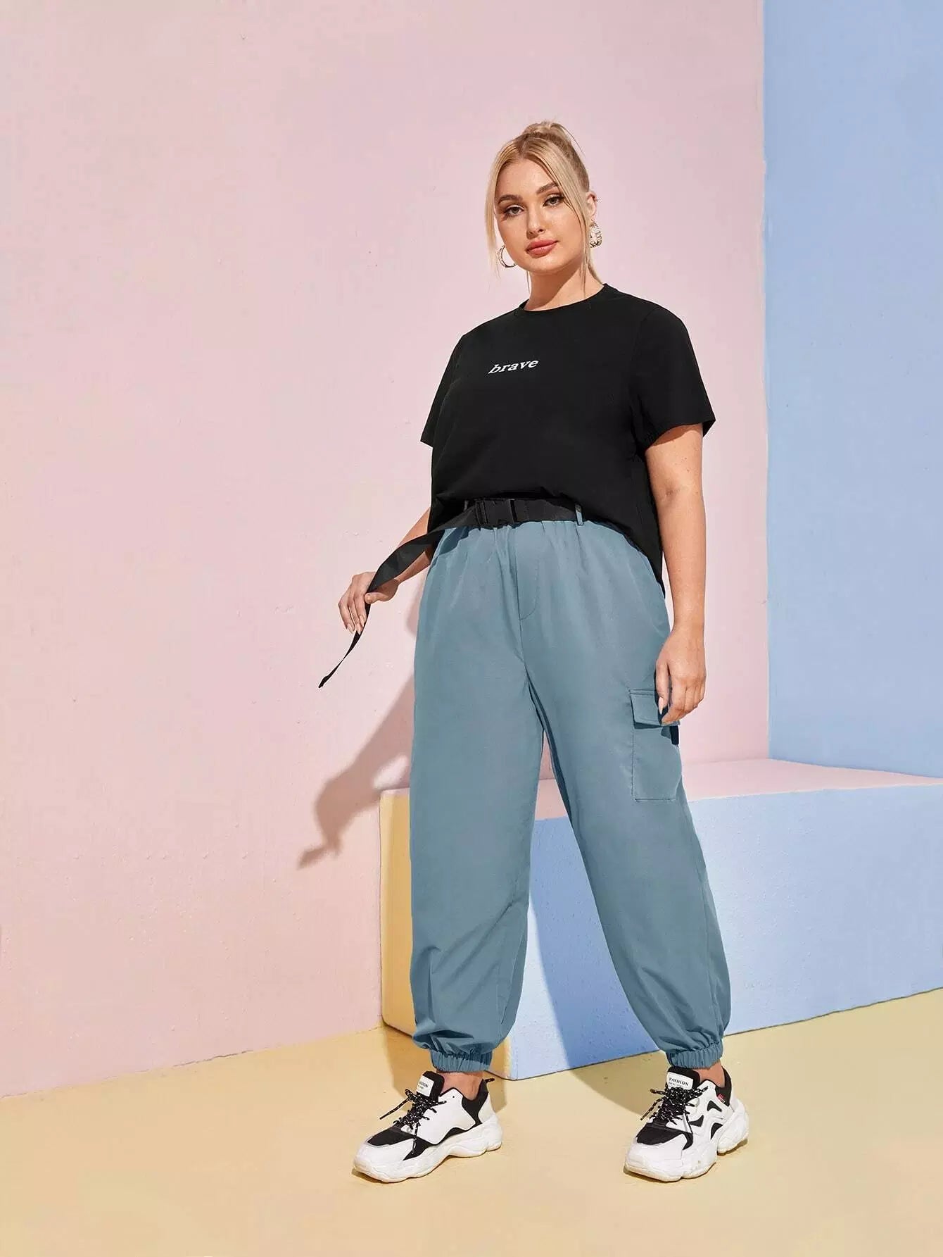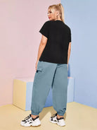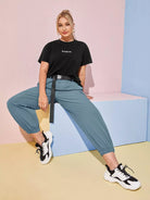 نحيف - مقاس كبير طقم بنطال بحزام على شكل تي شيرت برسومات الحروف وحزام بإبزيم