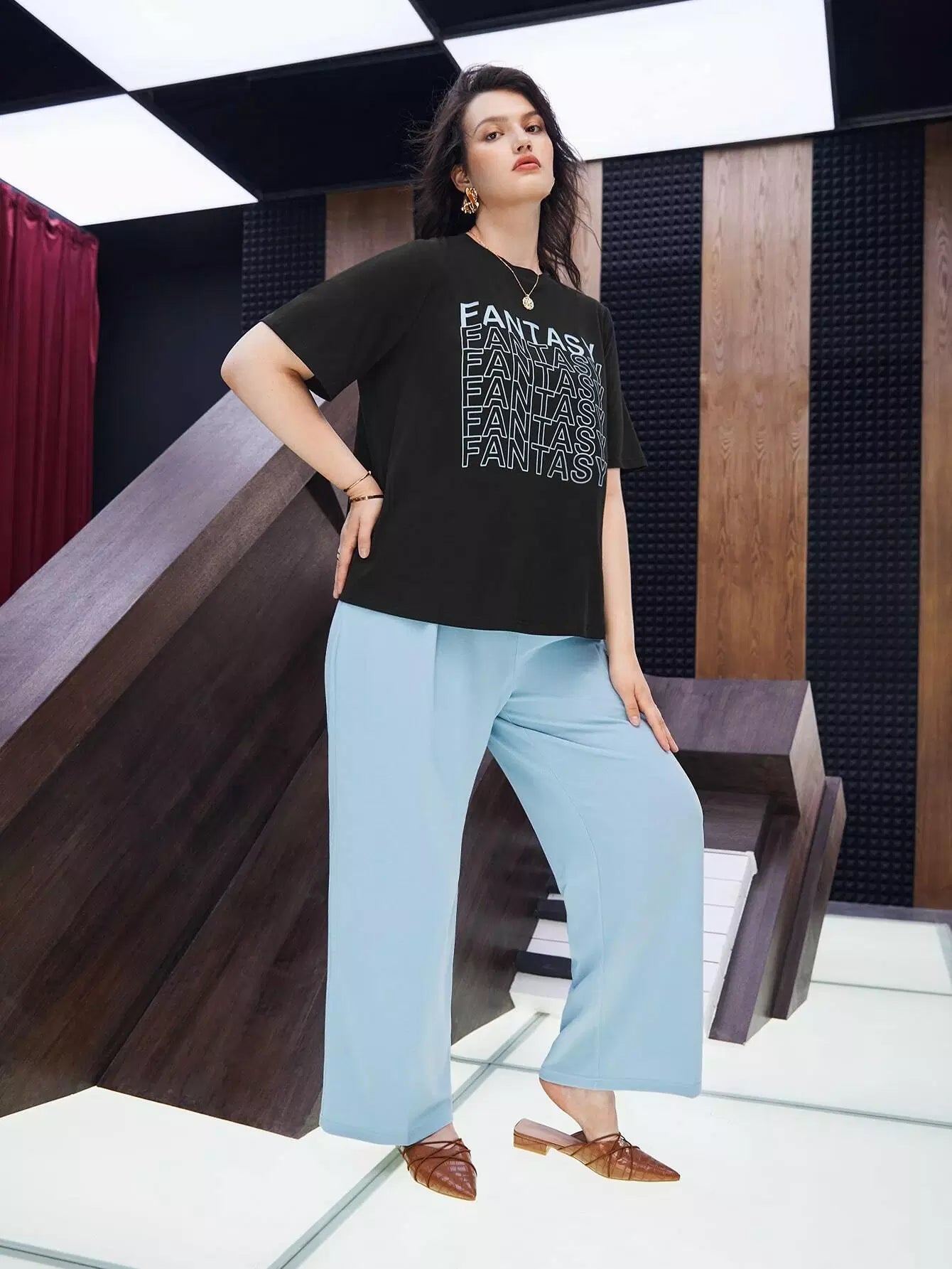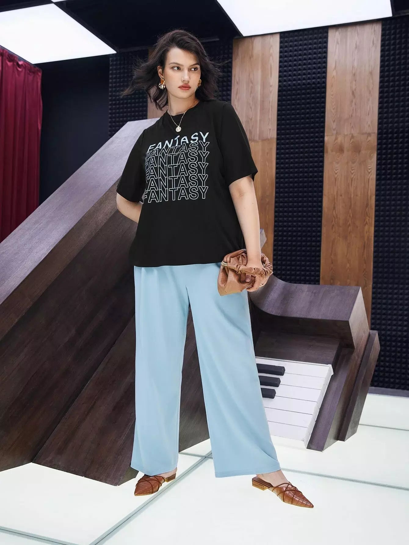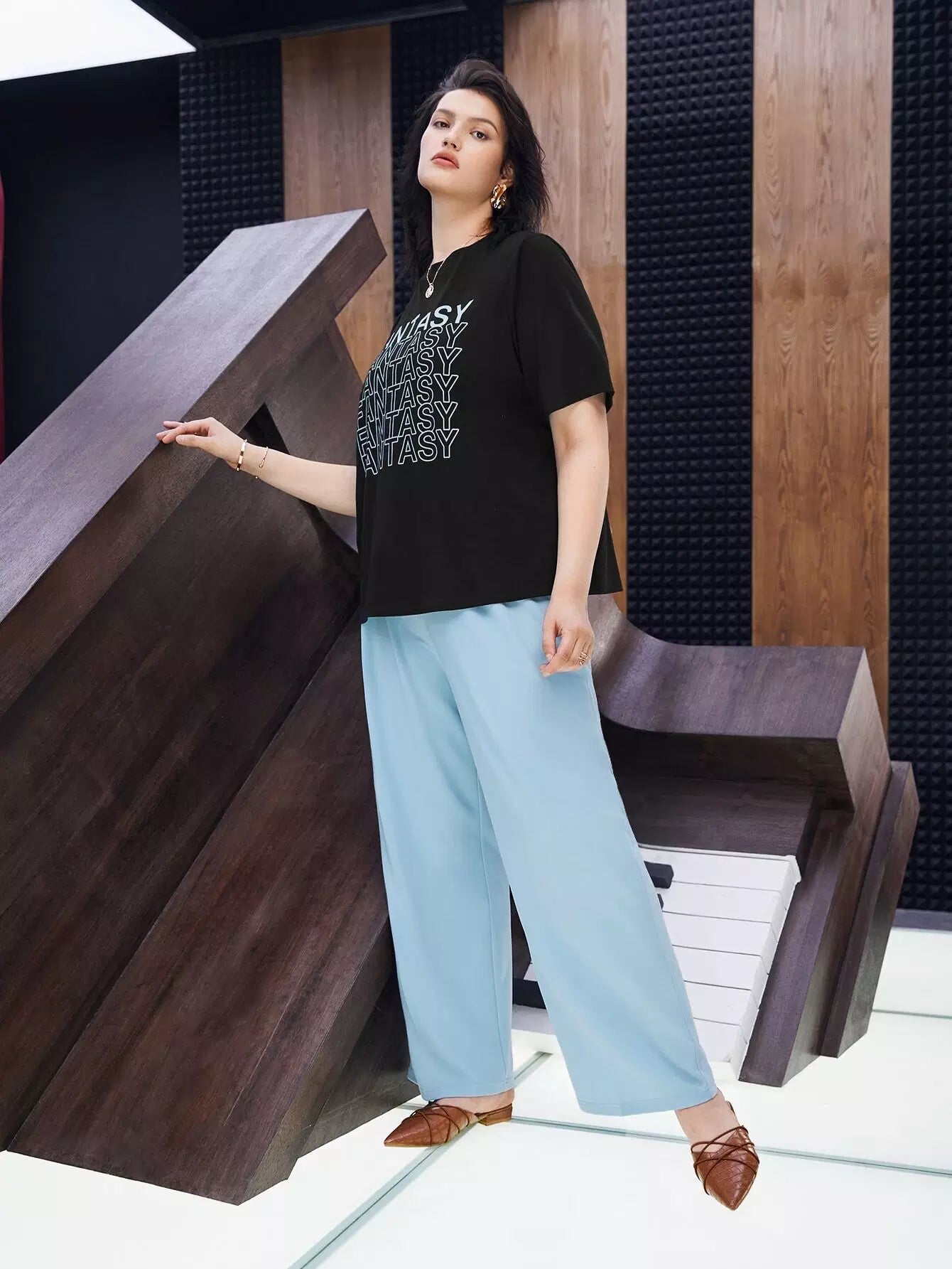 تي شيرت جرافيك برسوم حروف زائد وبنطال واسع الساقين