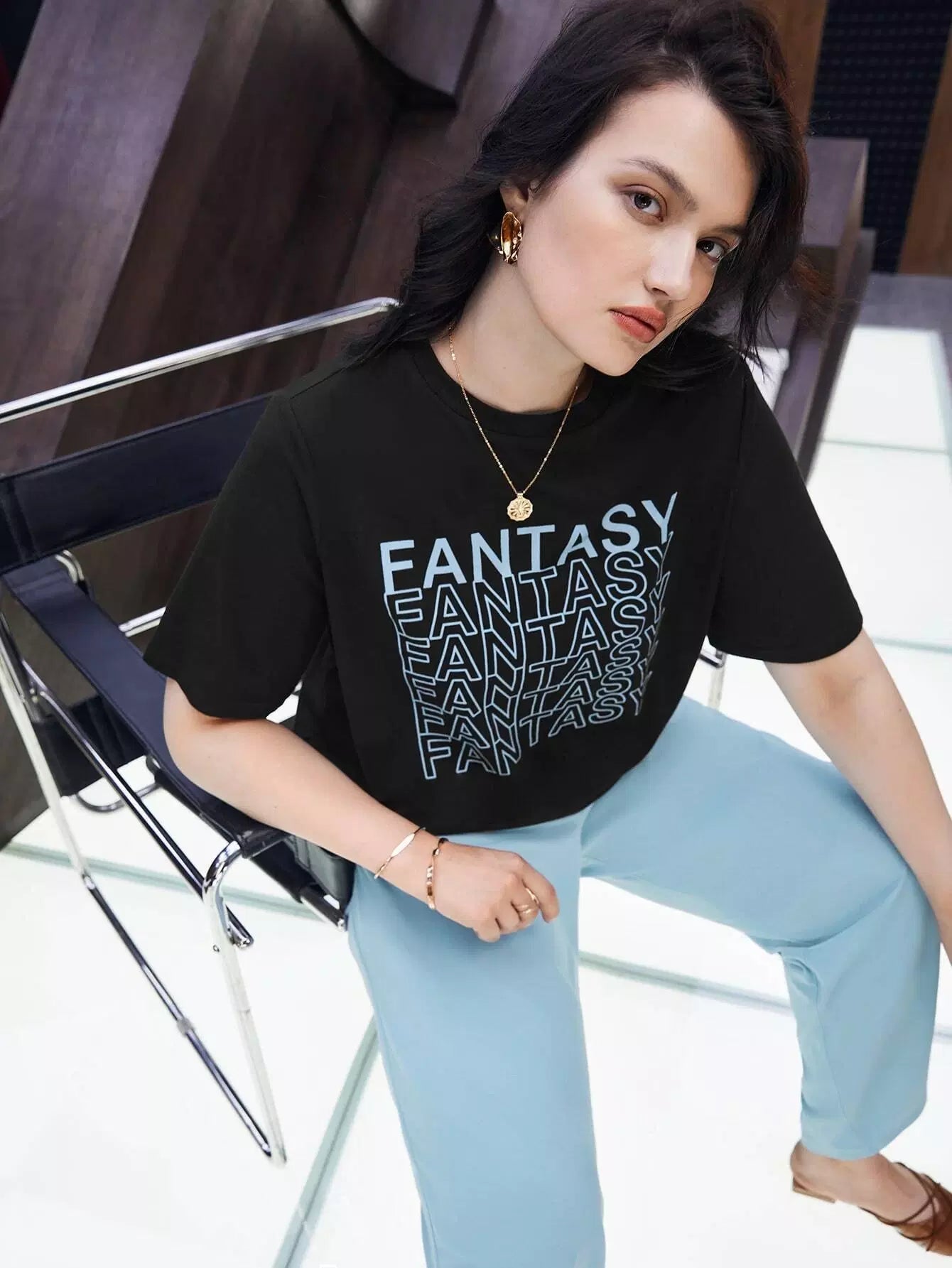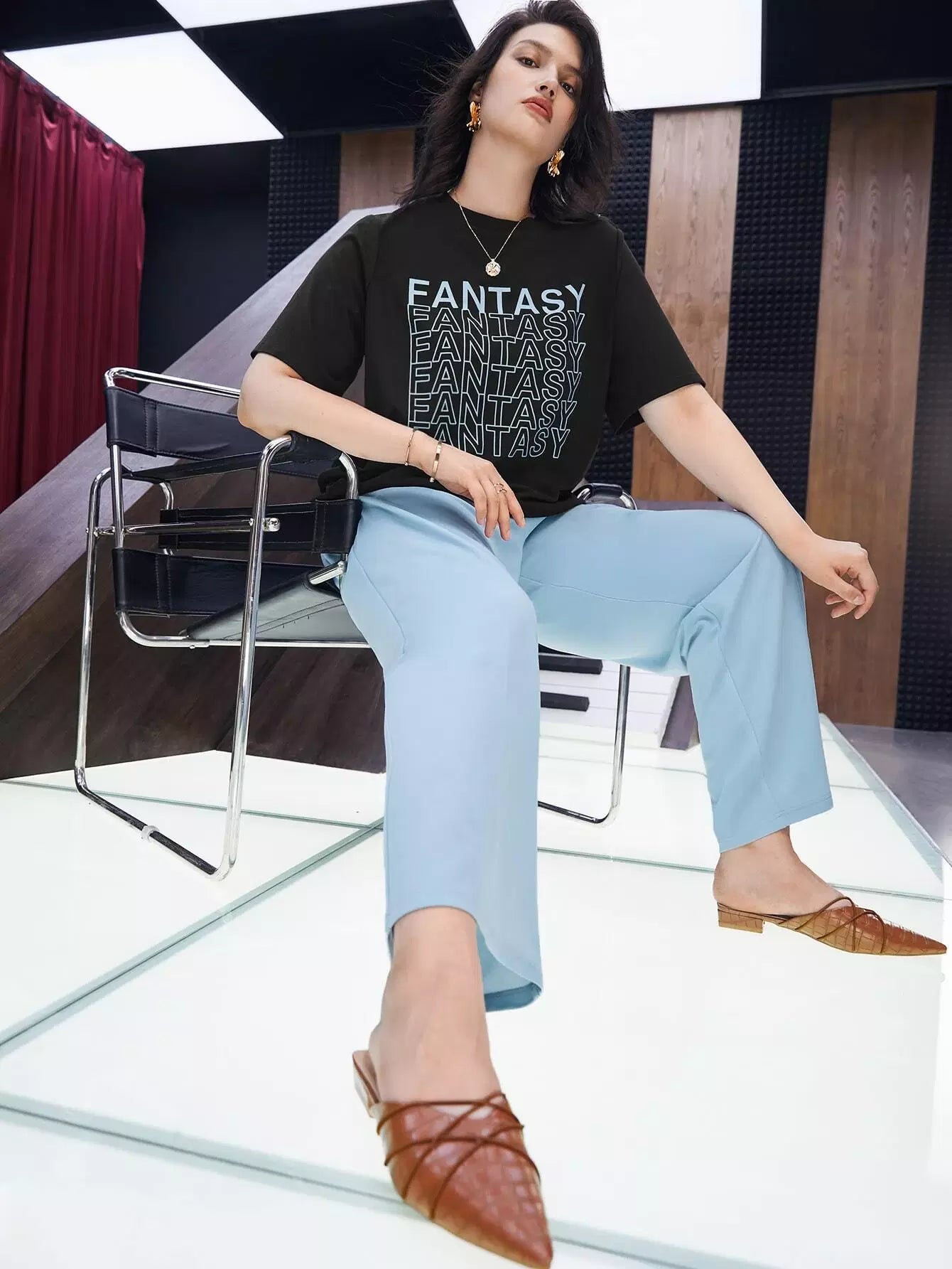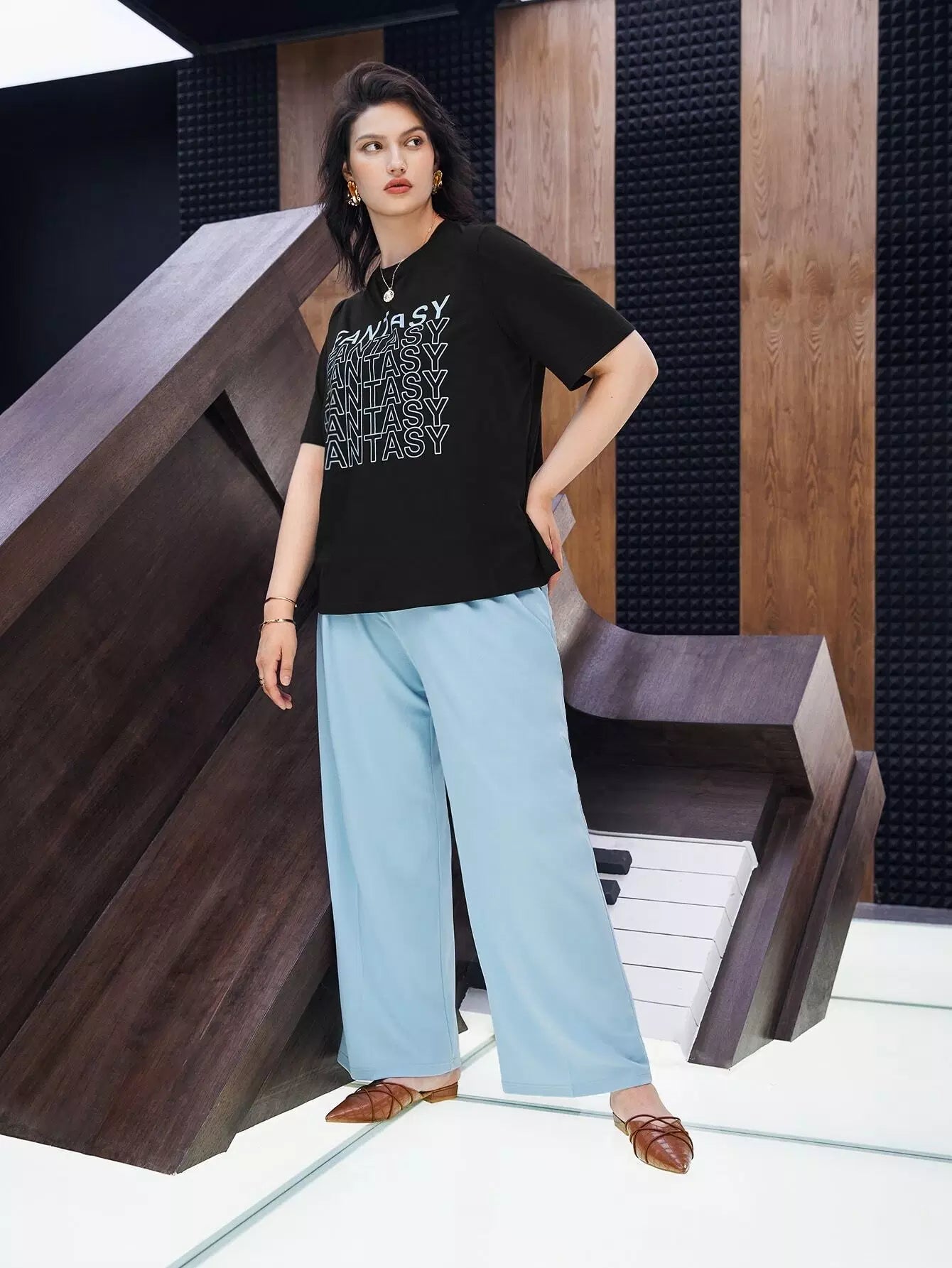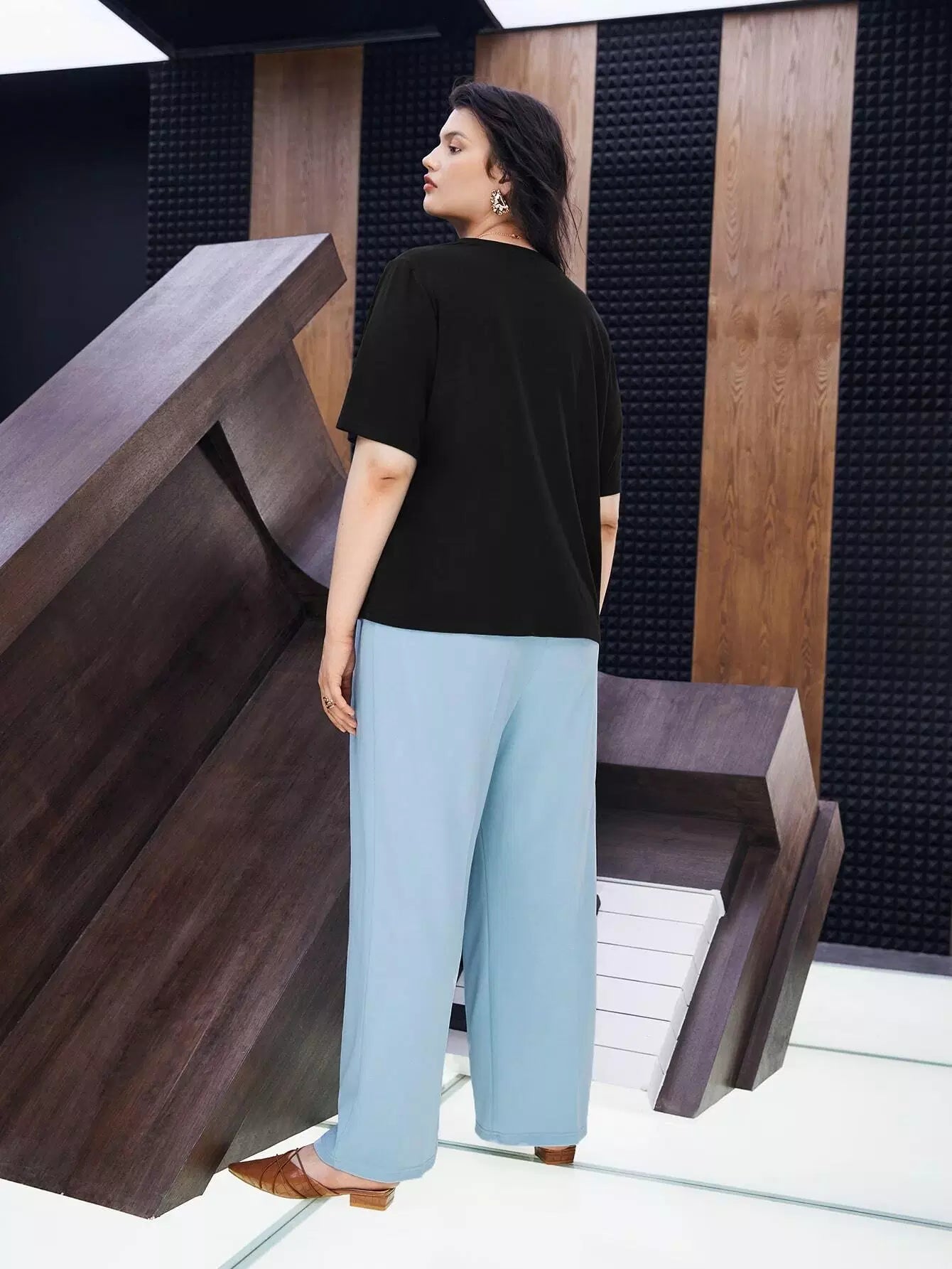 تي شيرت جرافيك برسوم حروف زائد وبنطال واسع الساقين
