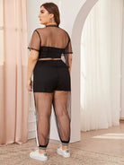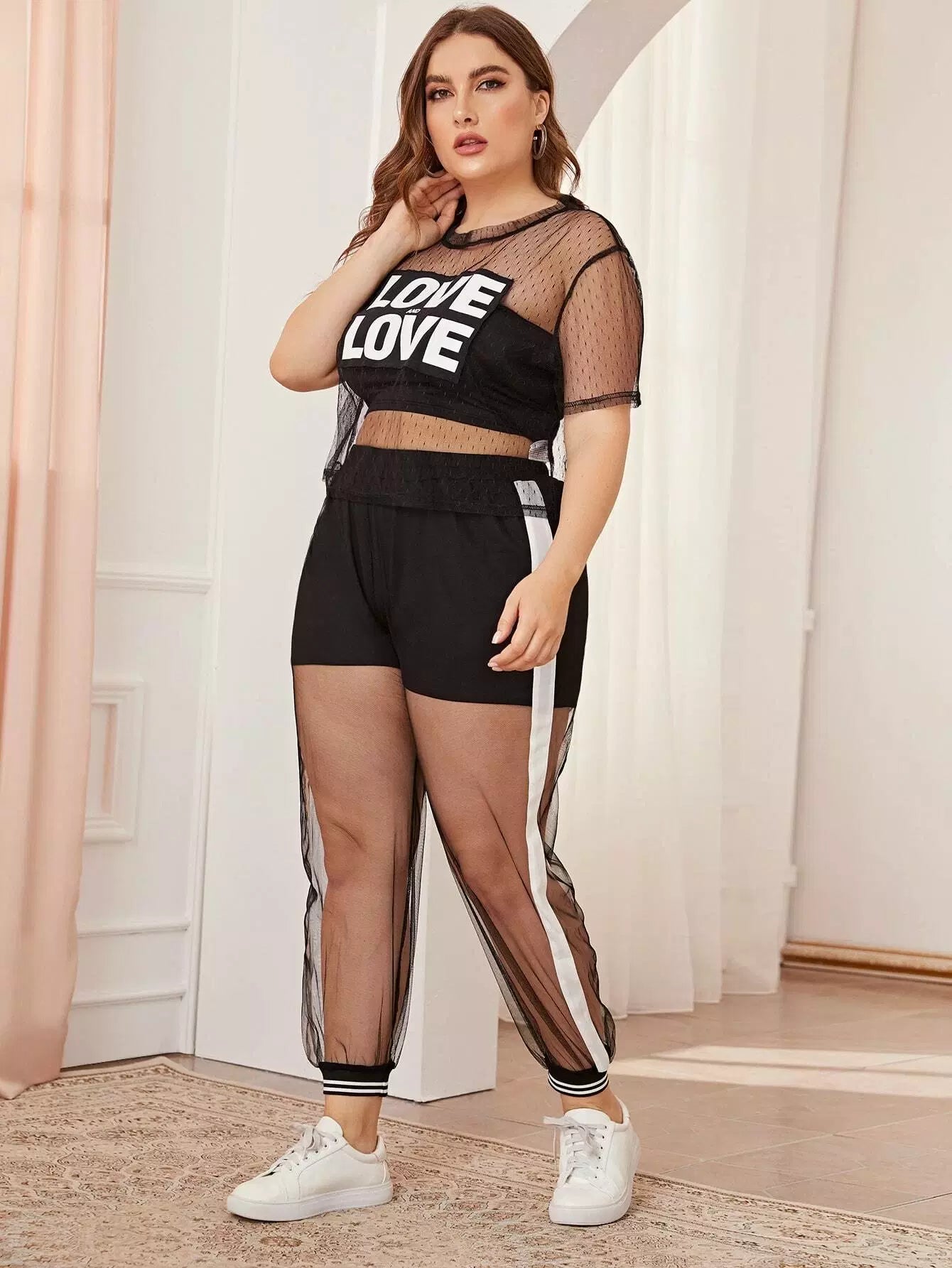 طقم بلوزة بنطلون شبكي منقّط بنقشة حروف بلس وبنطلون شبكي بلون مغاير