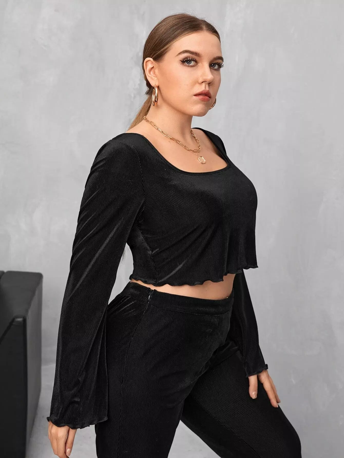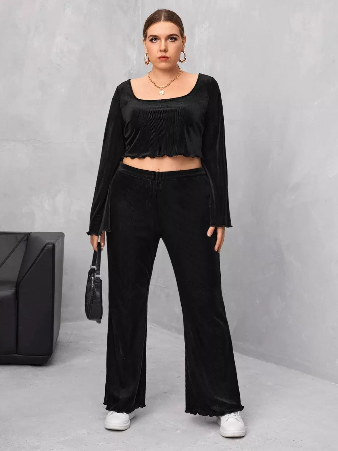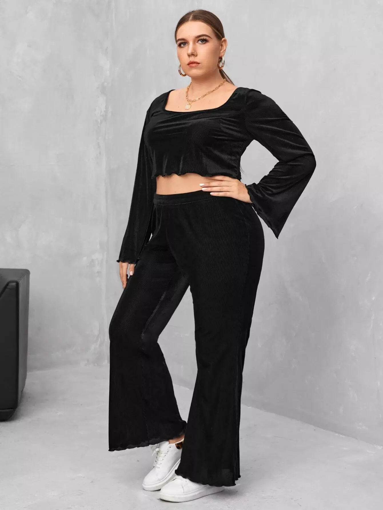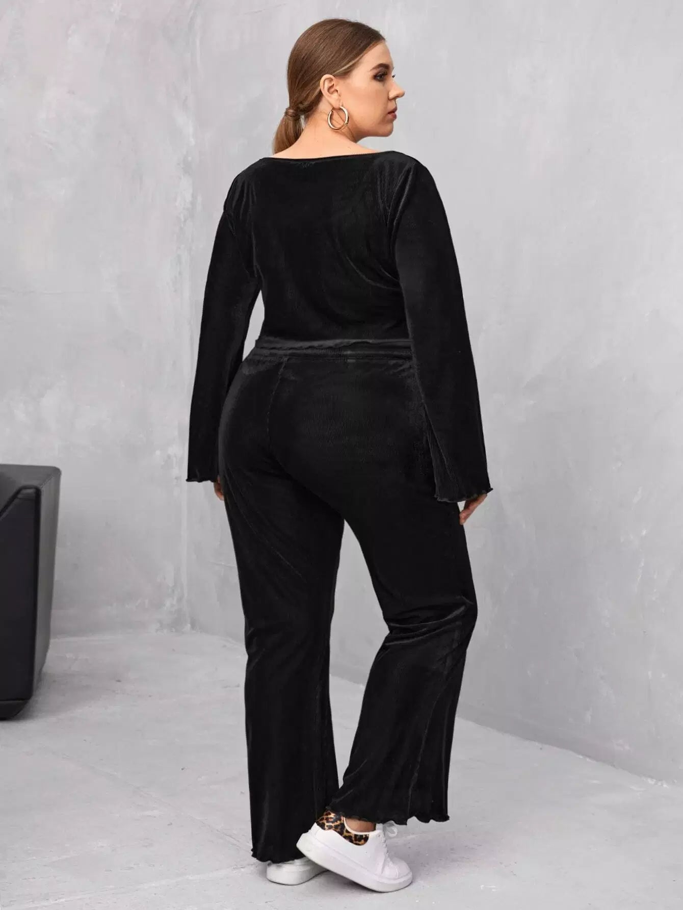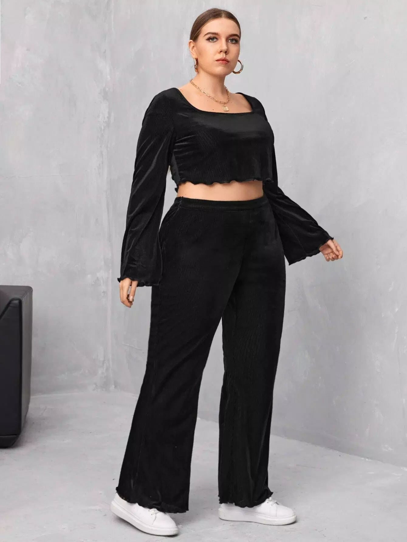 طقم بلوزة مخملية بحواف مخملية وبنطال بساق واسعة بلاس بلس