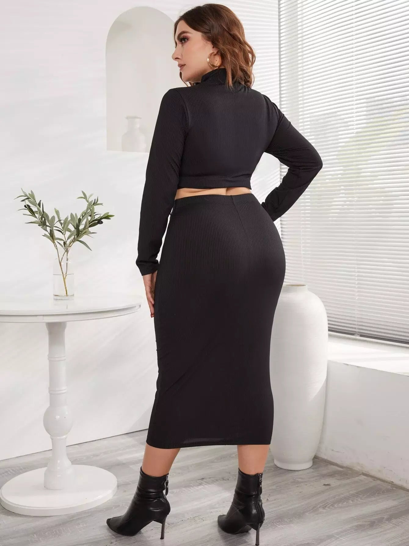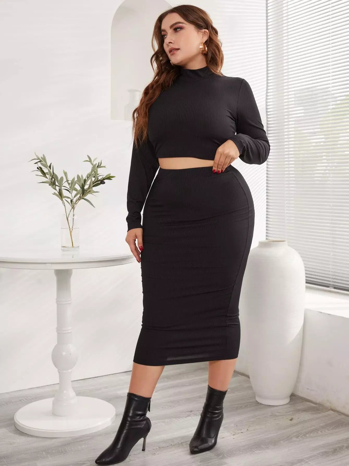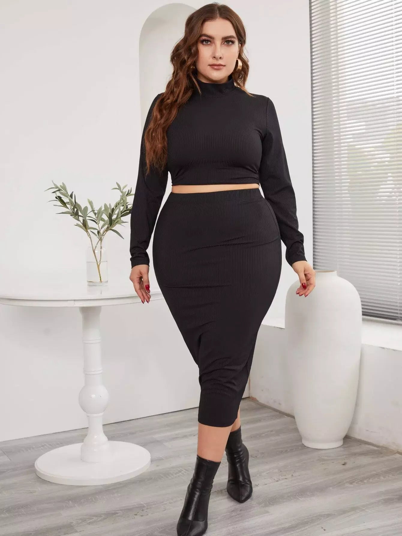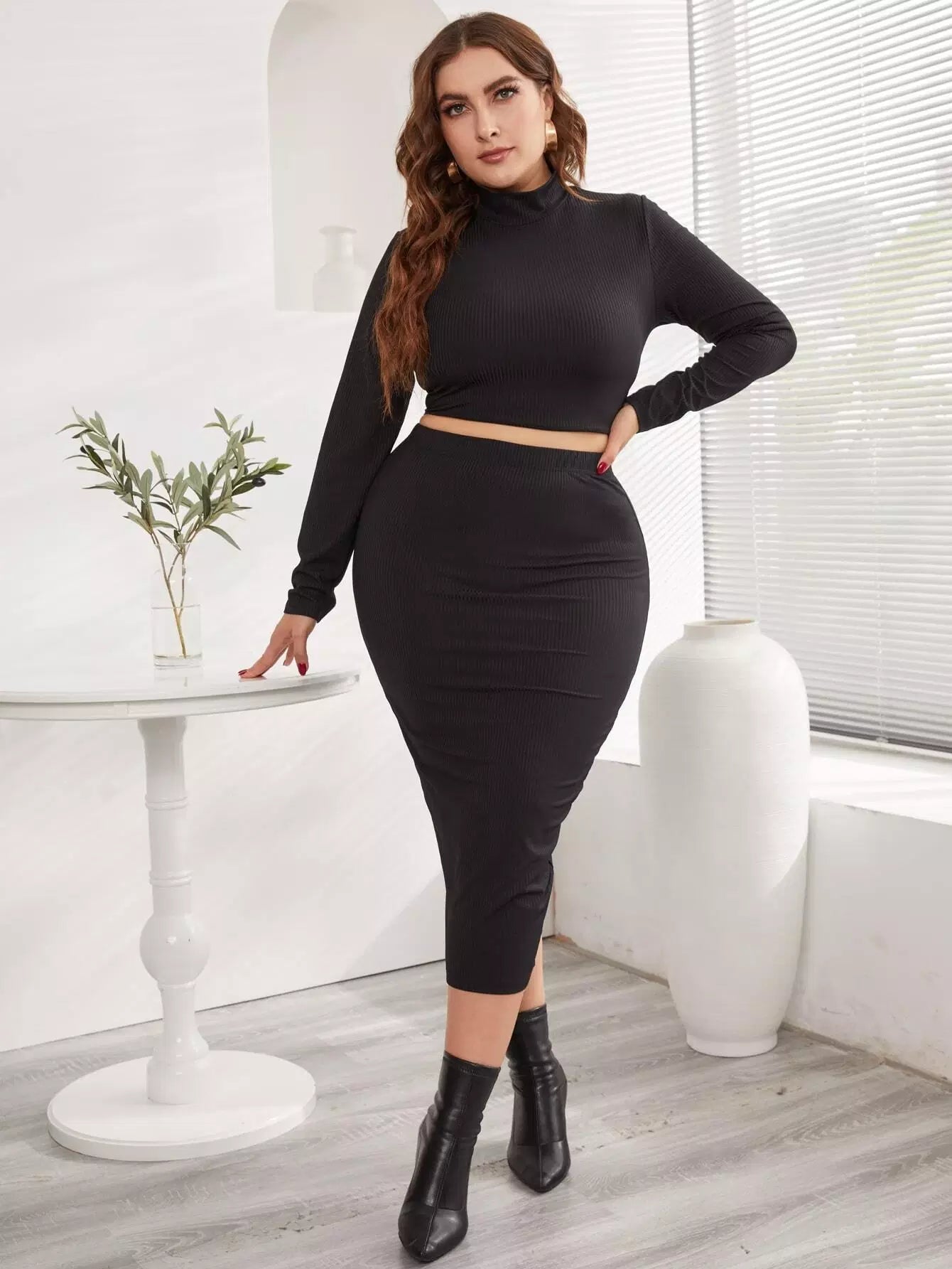 تي شيرت بياقة ضيقة برقبة زائد وتنورة ضيقة بقصّة ضيقة