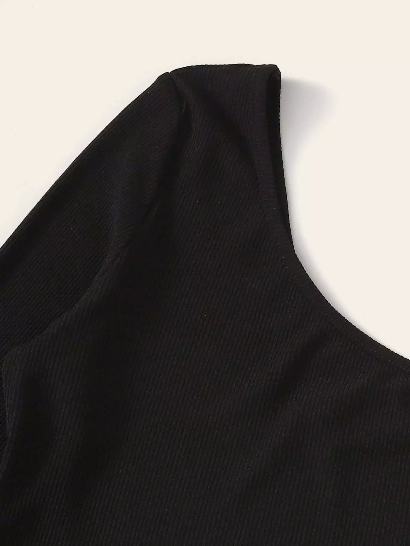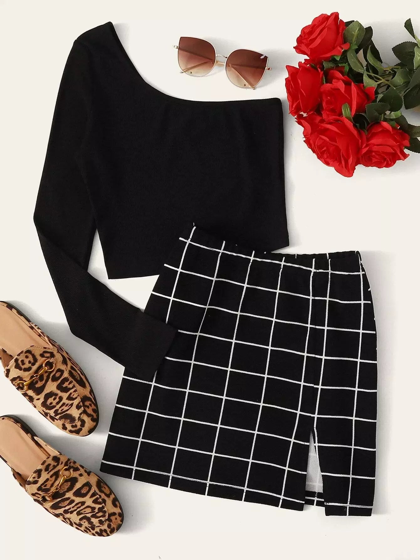 طقم بلوزة سادة بكتف واحد زائد وتنورة شبكية منقسمة