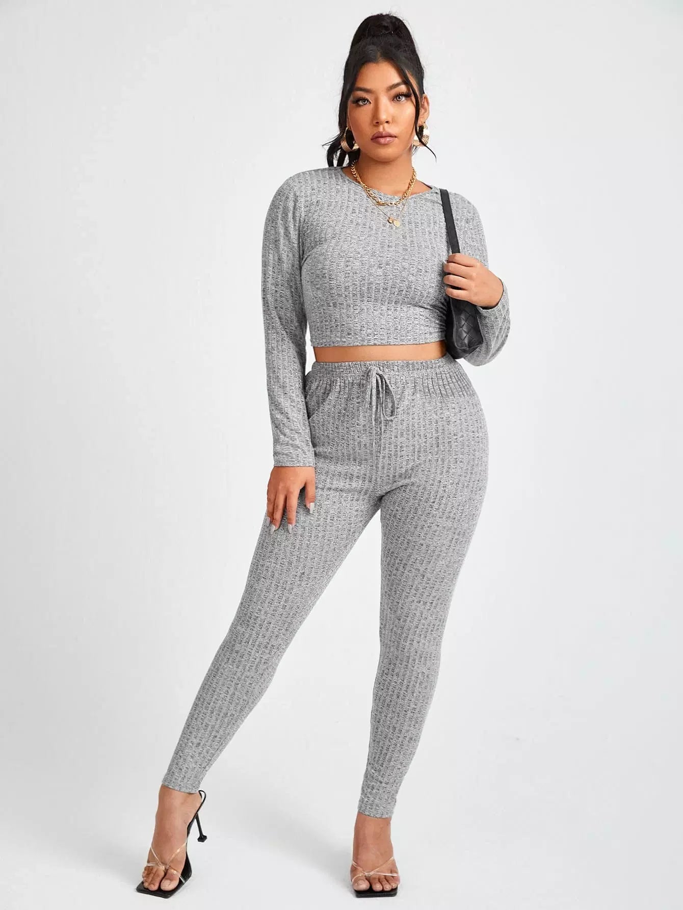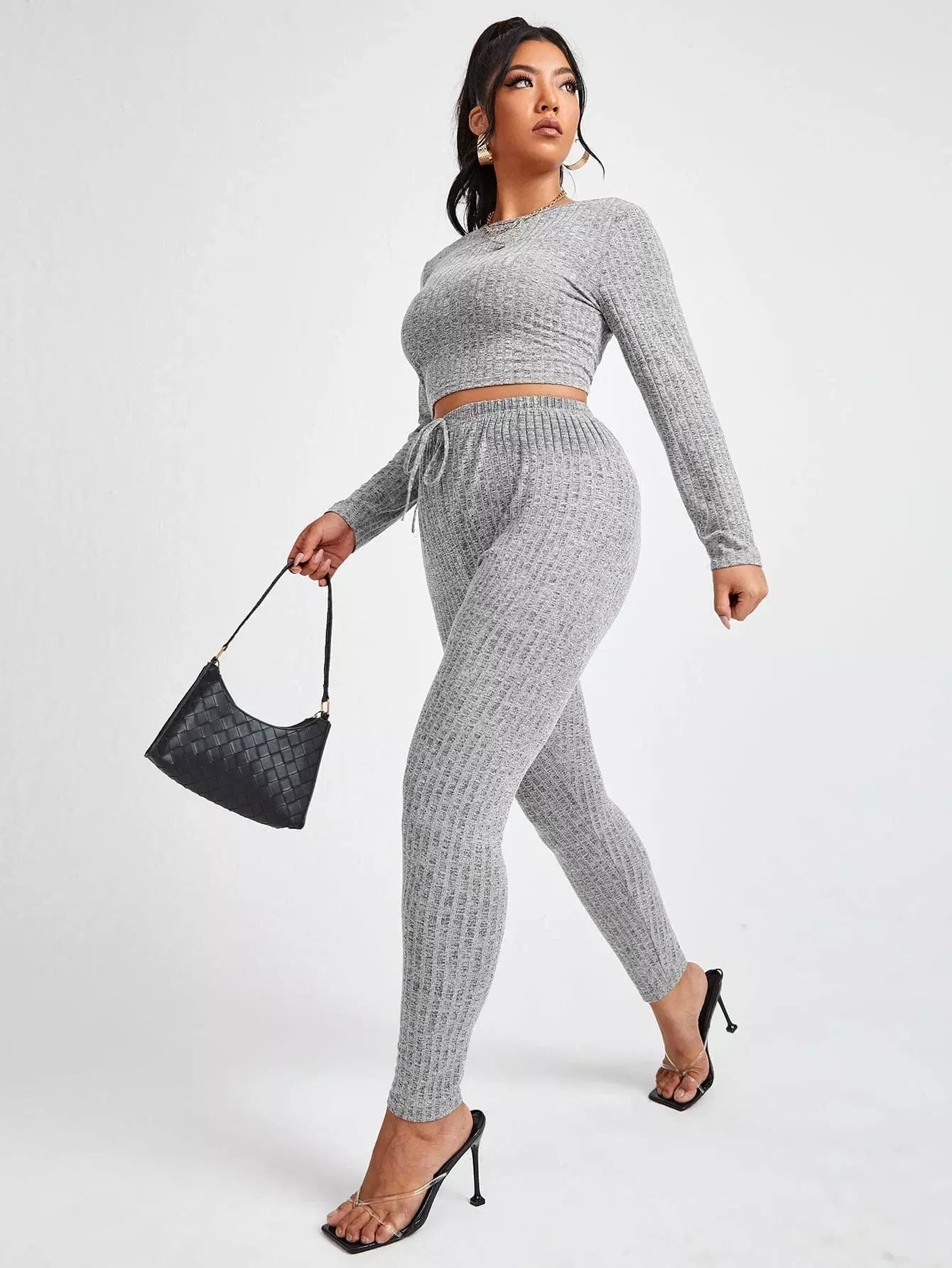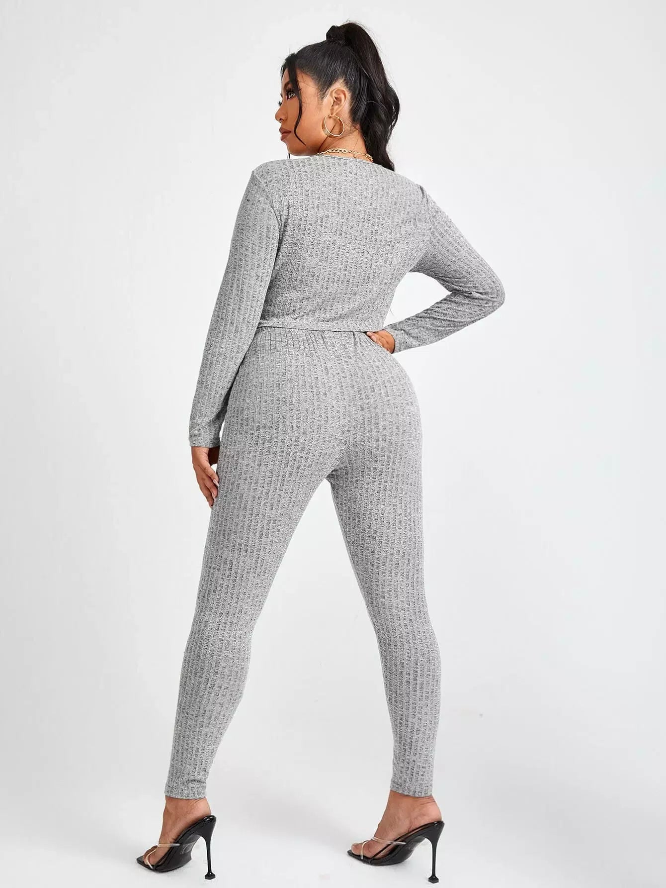 طقم بلوزة ضلع محبوكة على شكل ضلع زائد وبنطال ضيق بخصر معقود