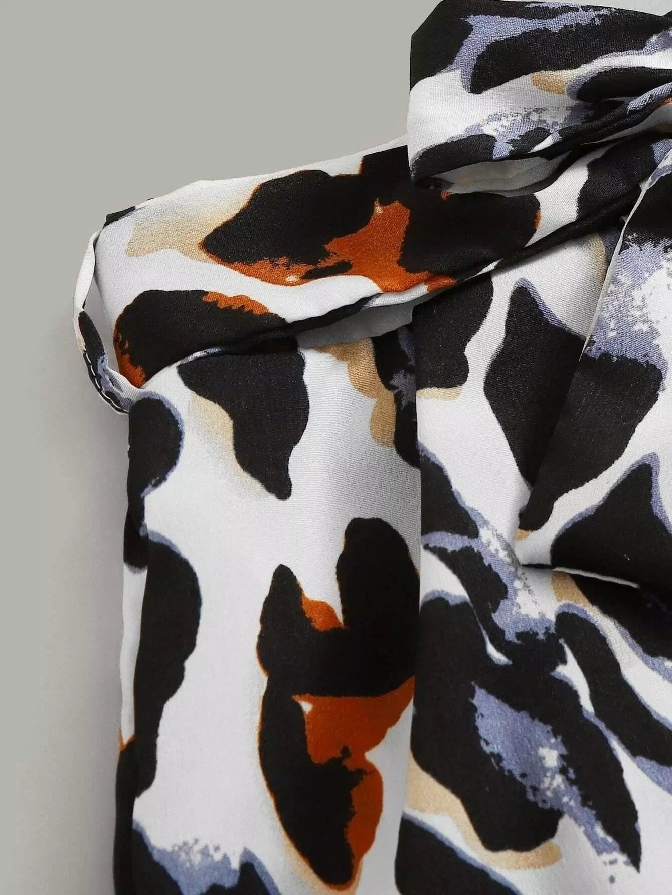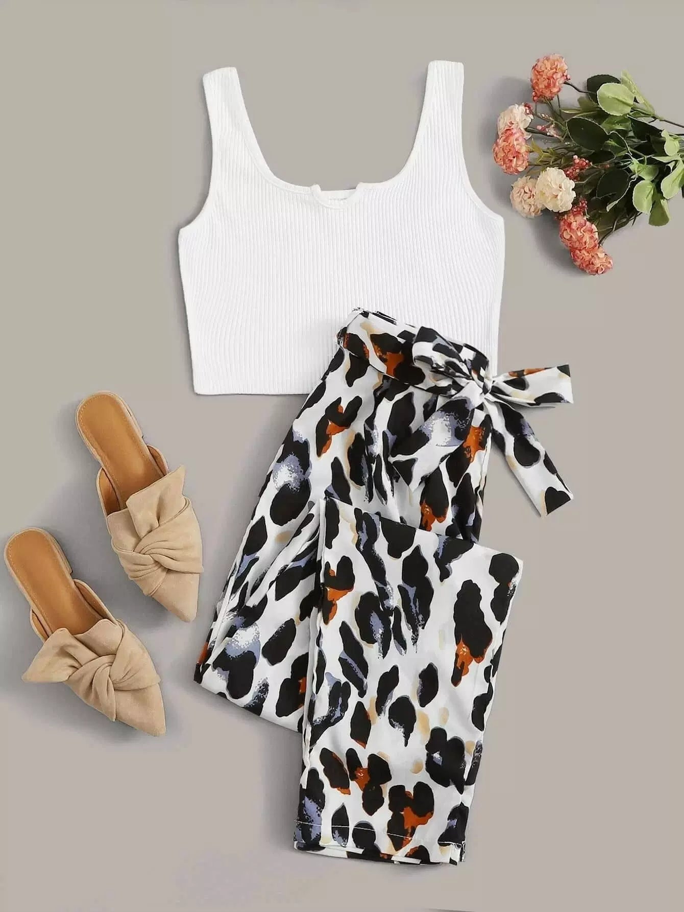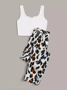 بالإضافة إلى قميص بدون أكمام مضلع مع بنطال برسومات بدون حزام