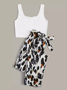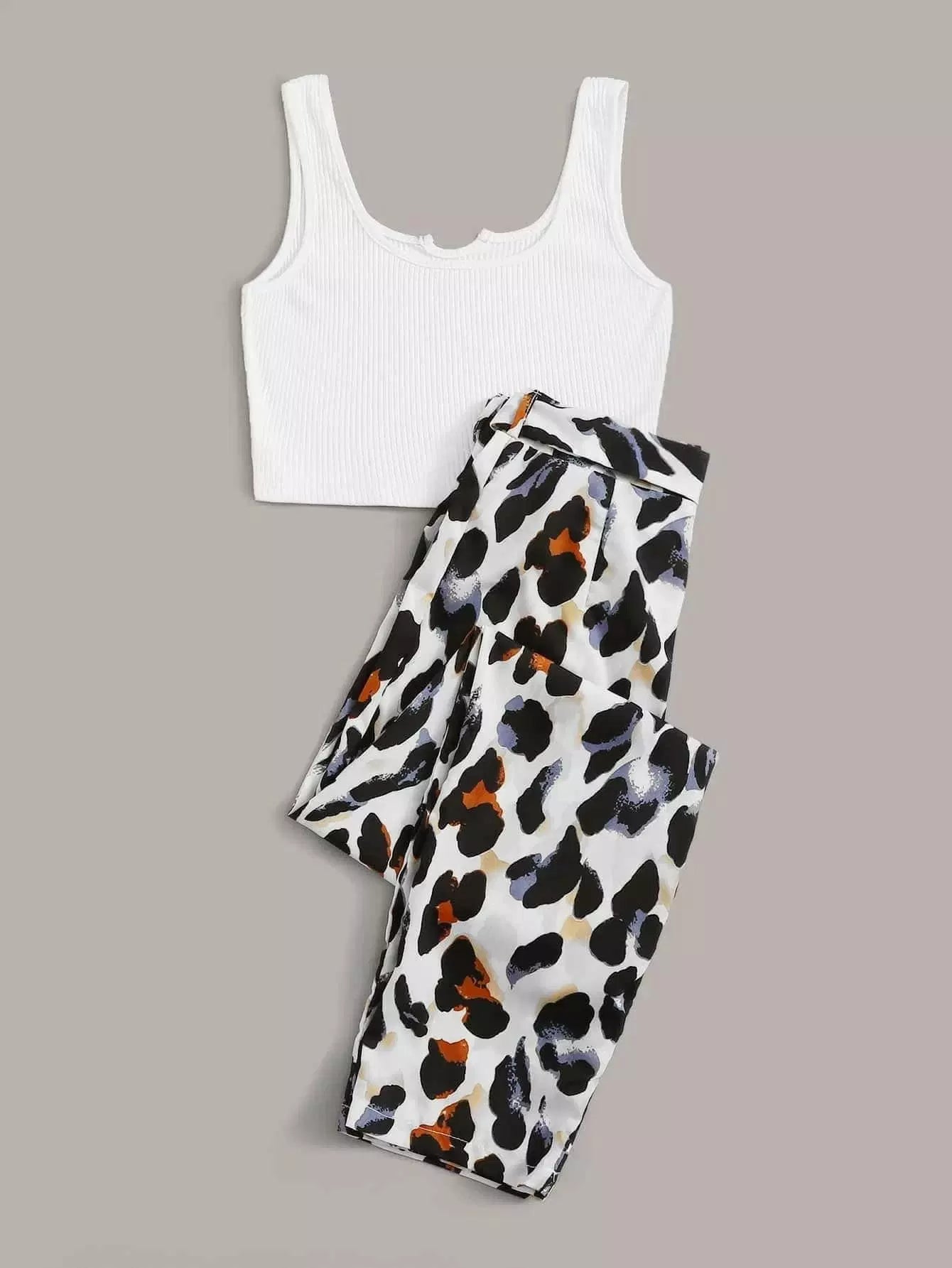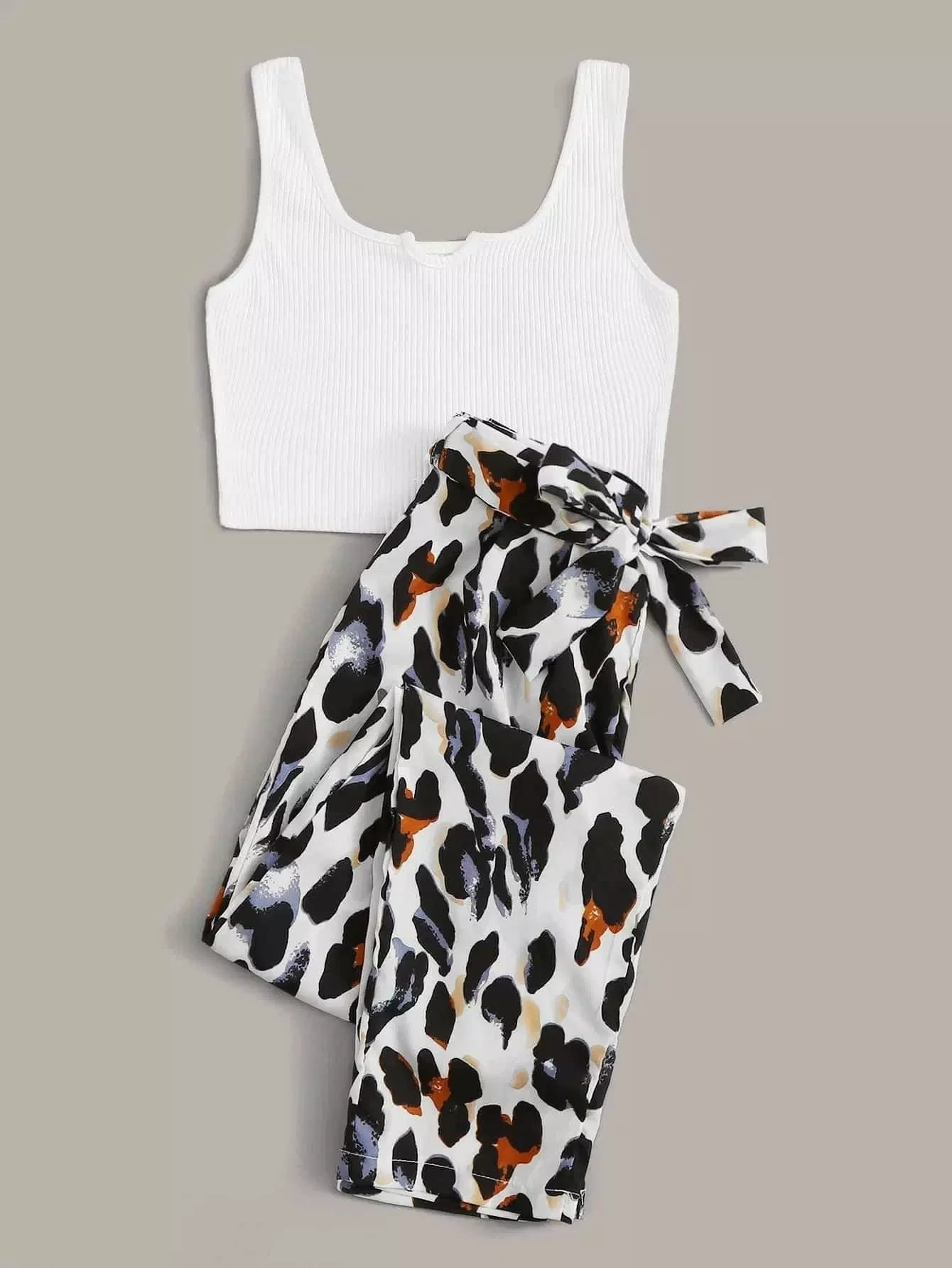 نحيف - مقاس كبير بلوزة بدون أكمام بنسيج مضلع مع بنطال بحزام ورسومات