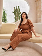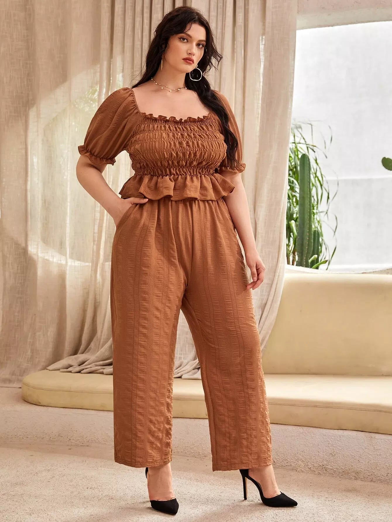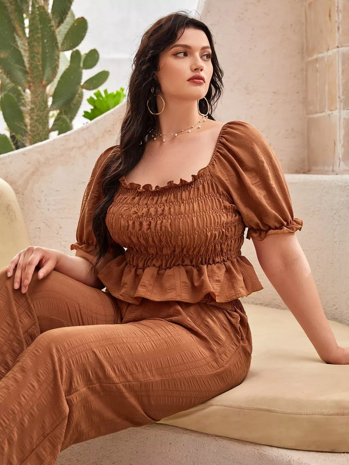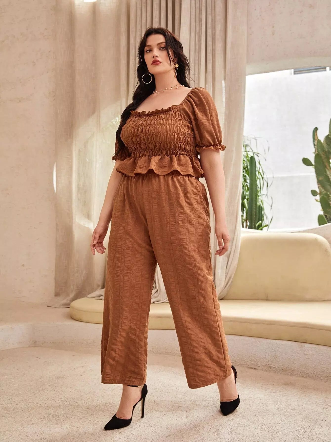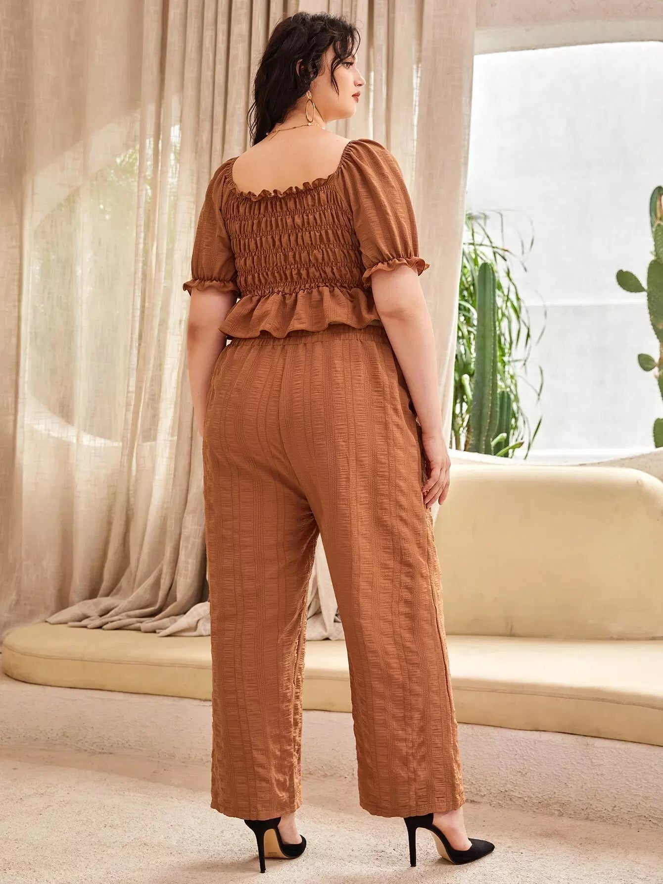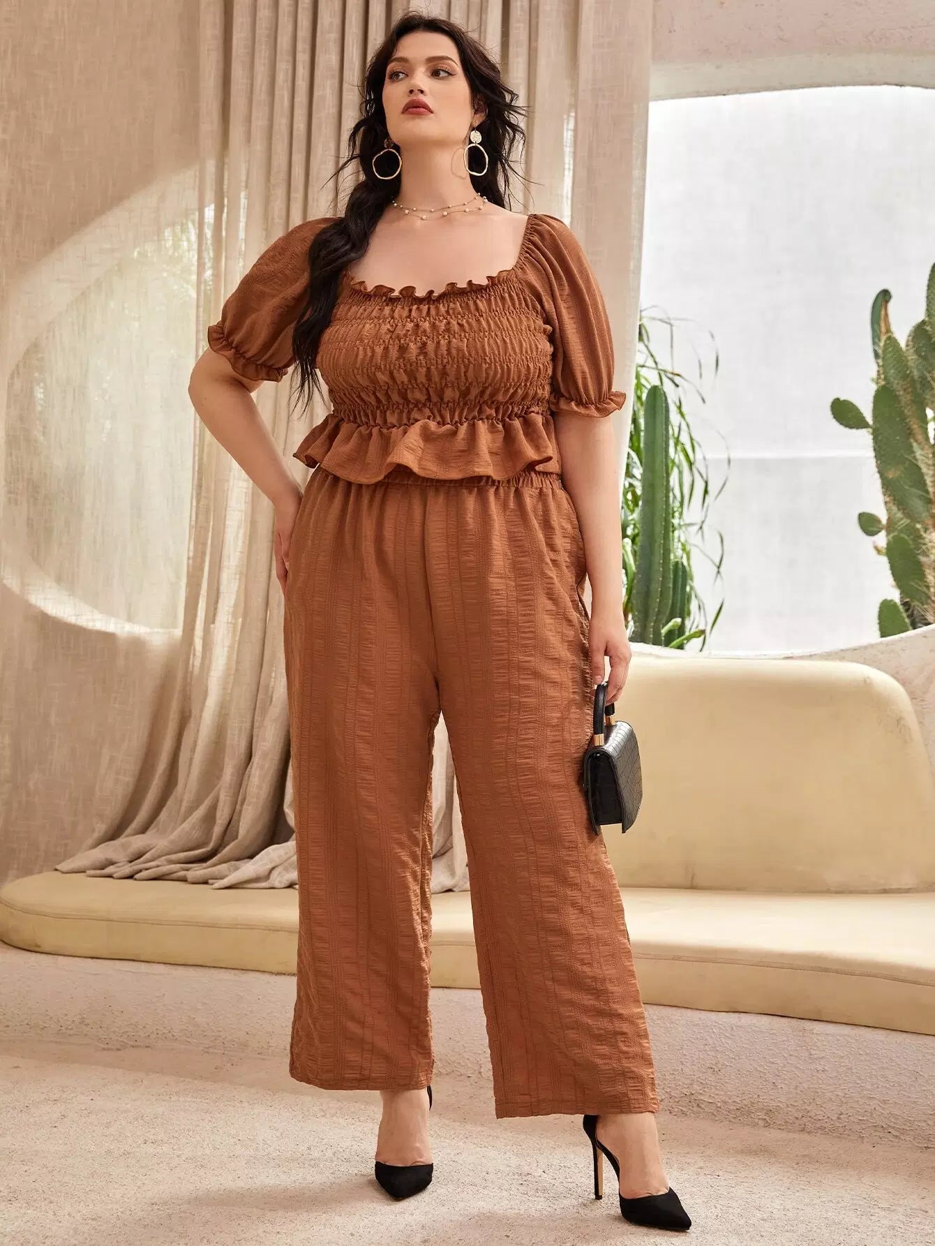 بلوزة بأكمام منفوشة بأكمام منفوشة وبنطال واسع الساقين