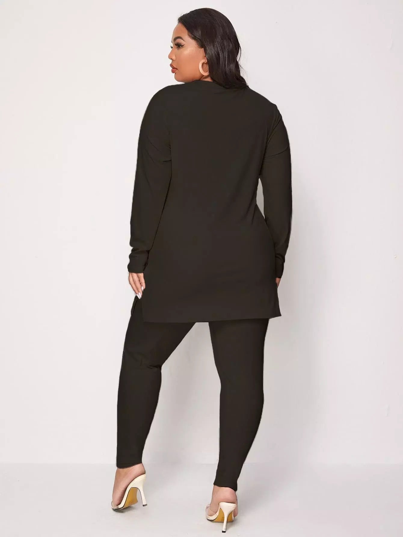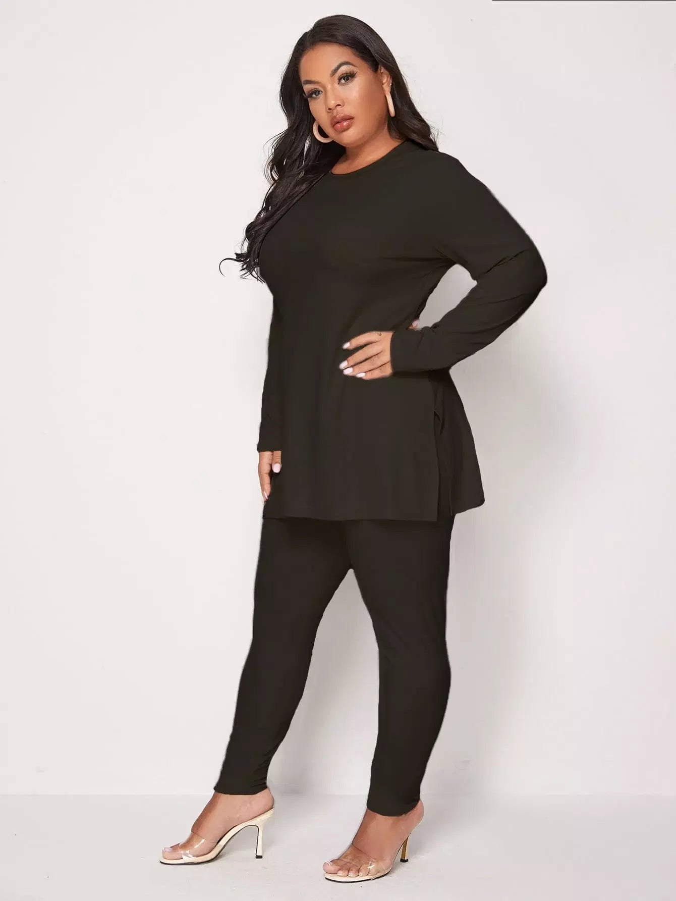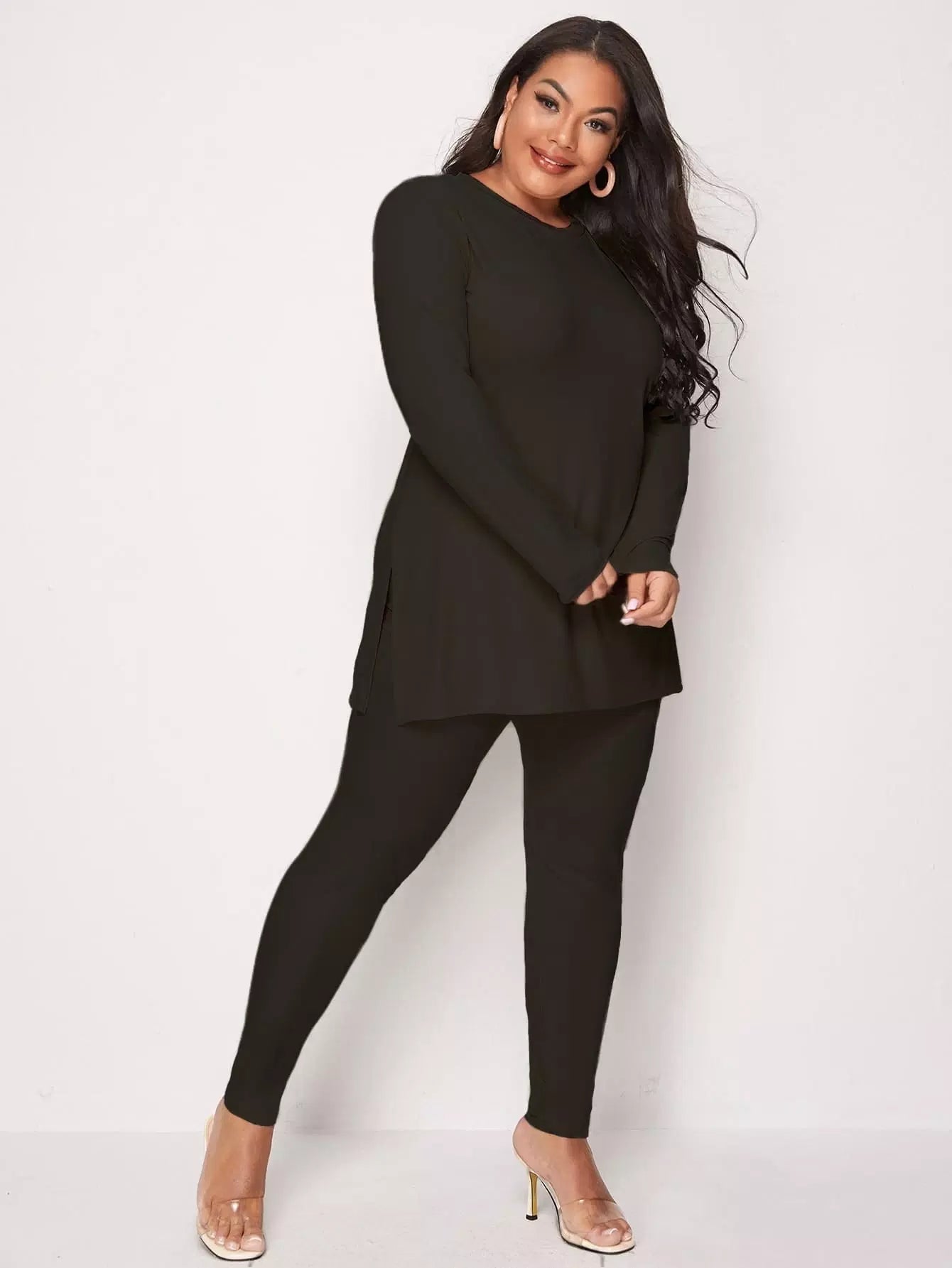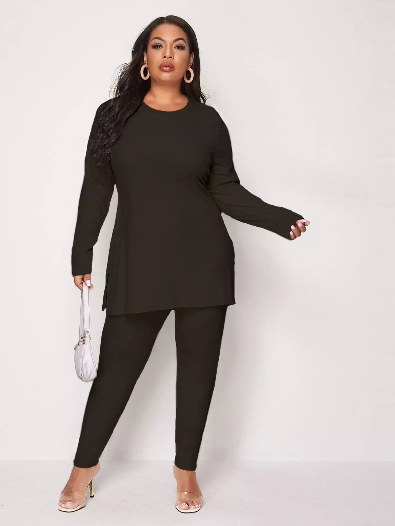 بلوزة وبنطال ضيق بحاشية سادة ذات فتحة طويلة بلاس سادة