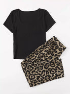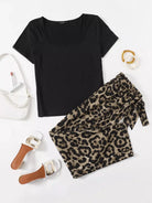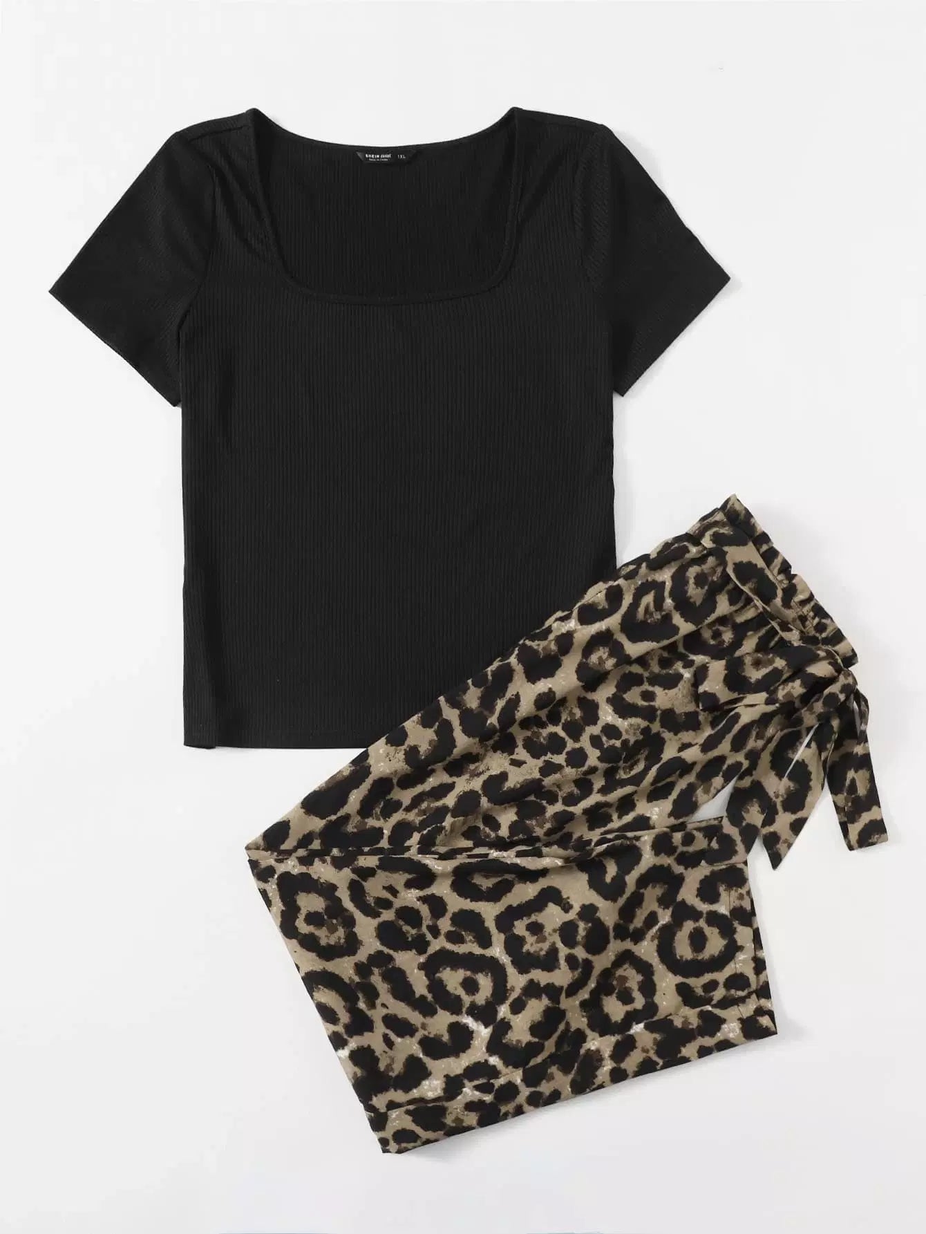 بالإضافة إلى بلوزة مضلعة ذات رقبة مربعة وسروال جلد الفهد على الخصر بدون حزام