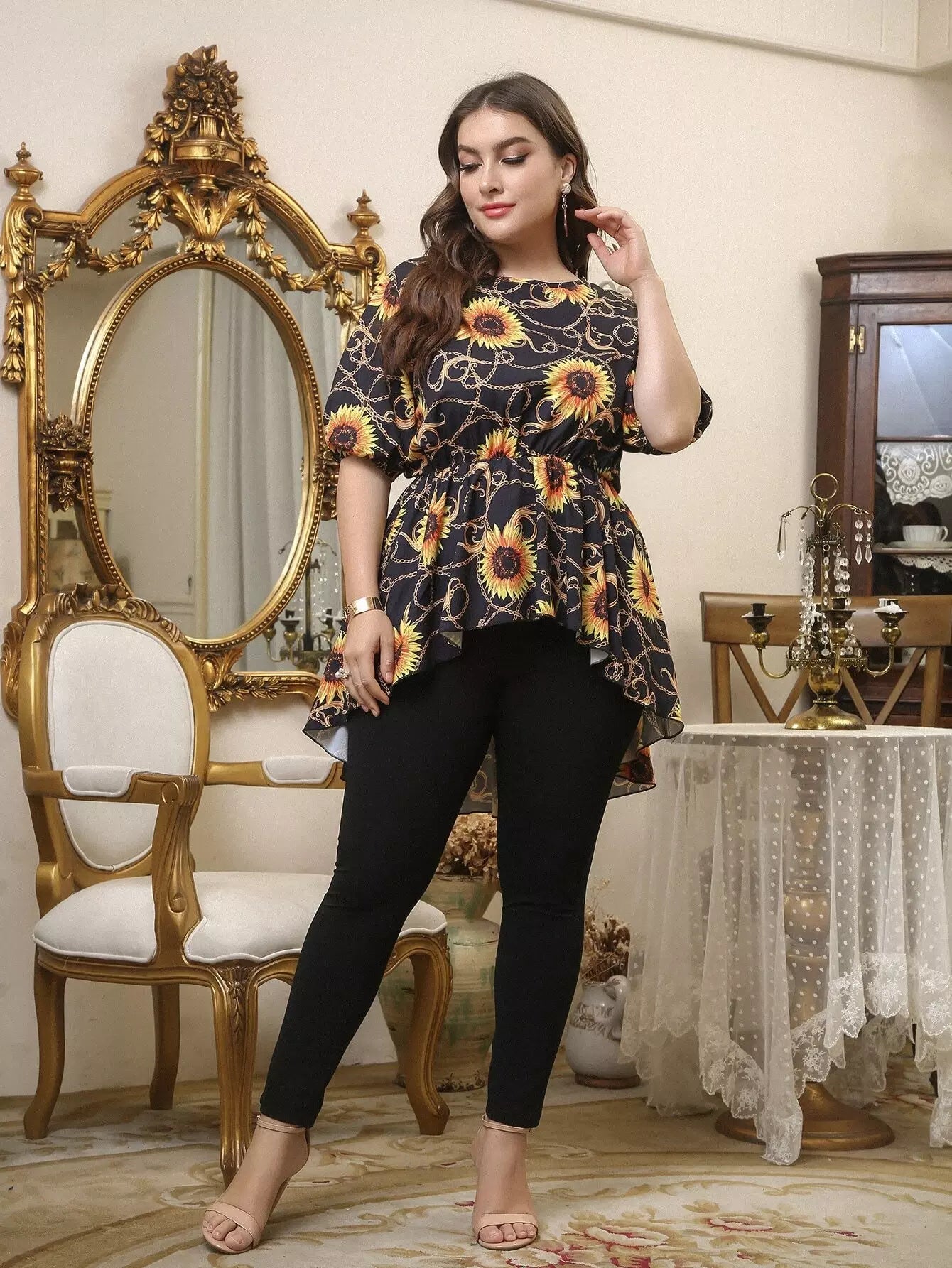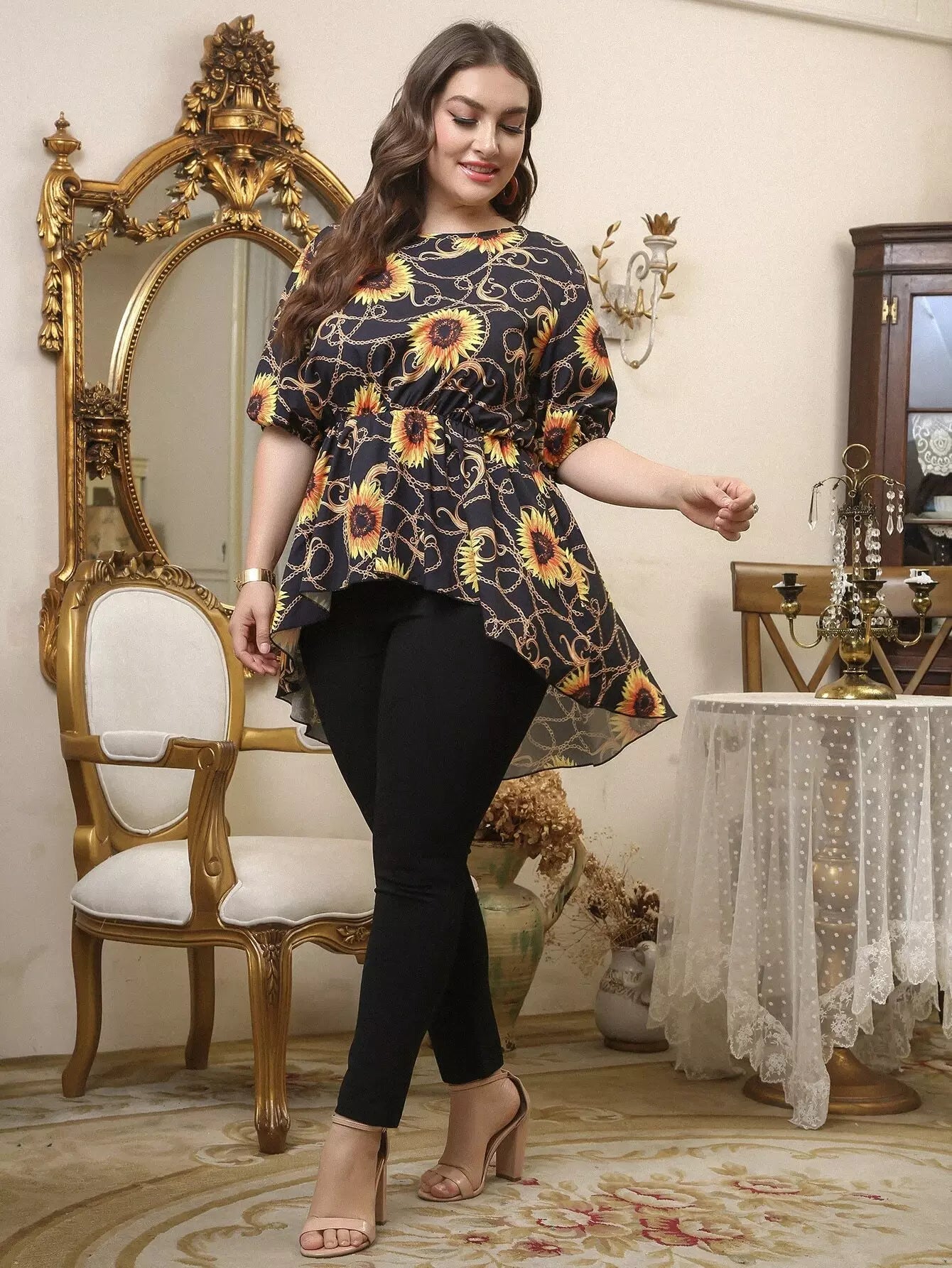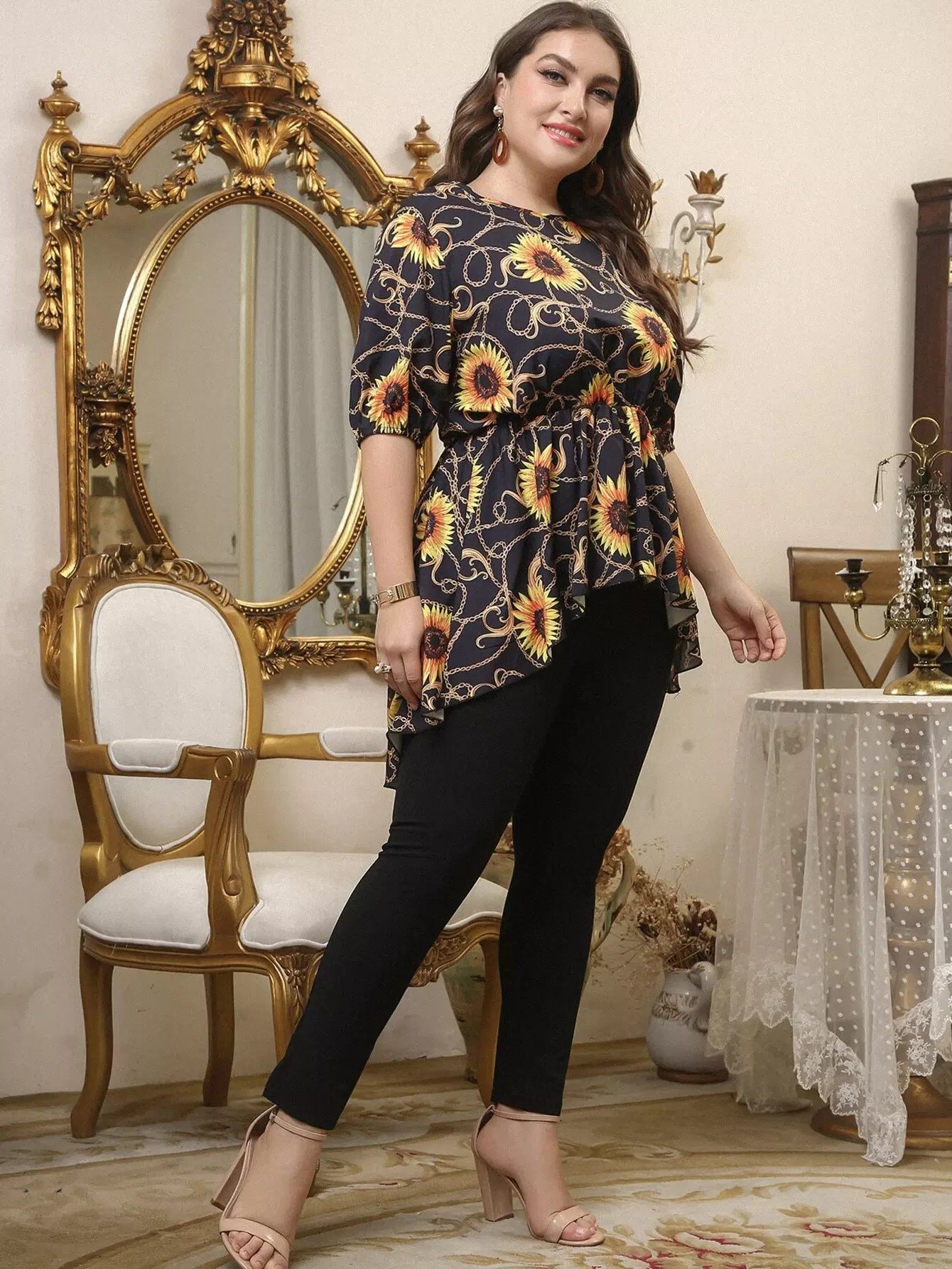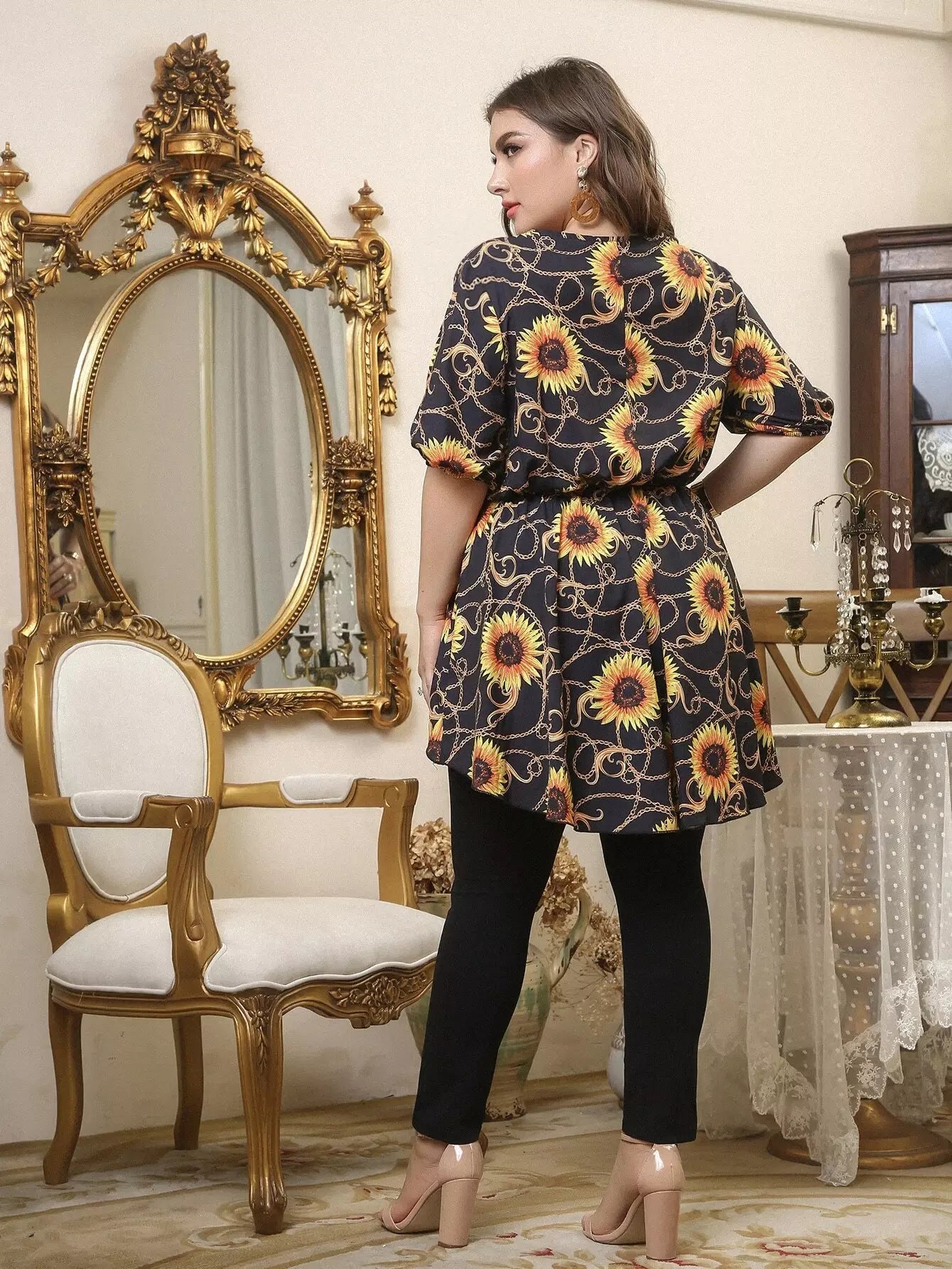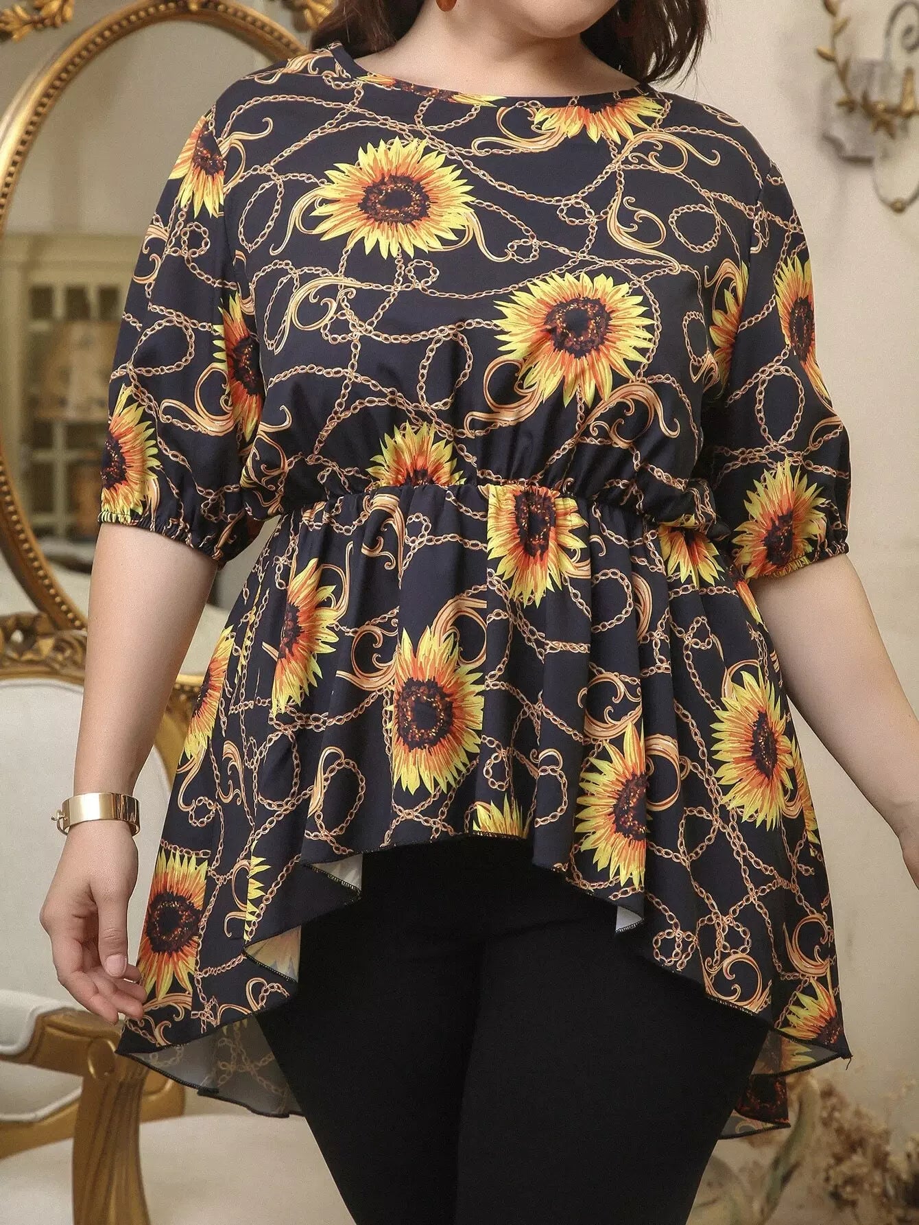 بلوزة بطبعة زهرة دوار الشمس وسلسلة مع بنطلون ضيق