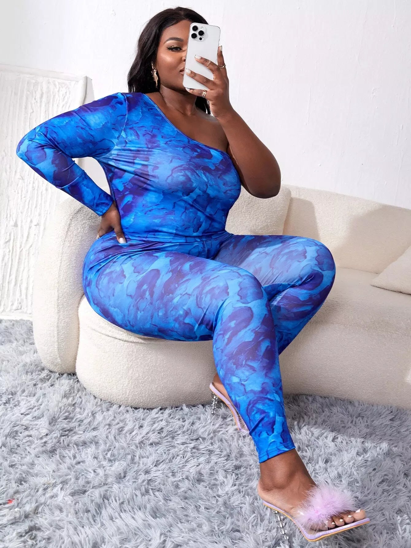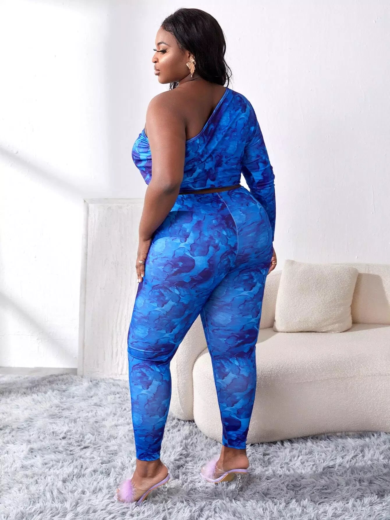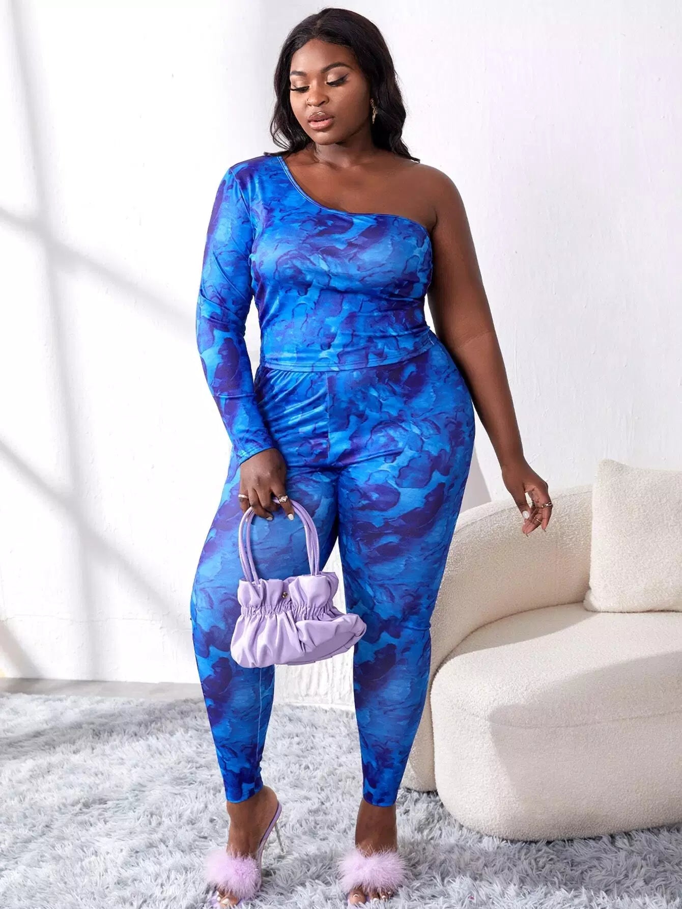 بلوزة بكتف واحد وبنطلون ضيق مصبوغ بربطة عنق زائد