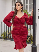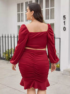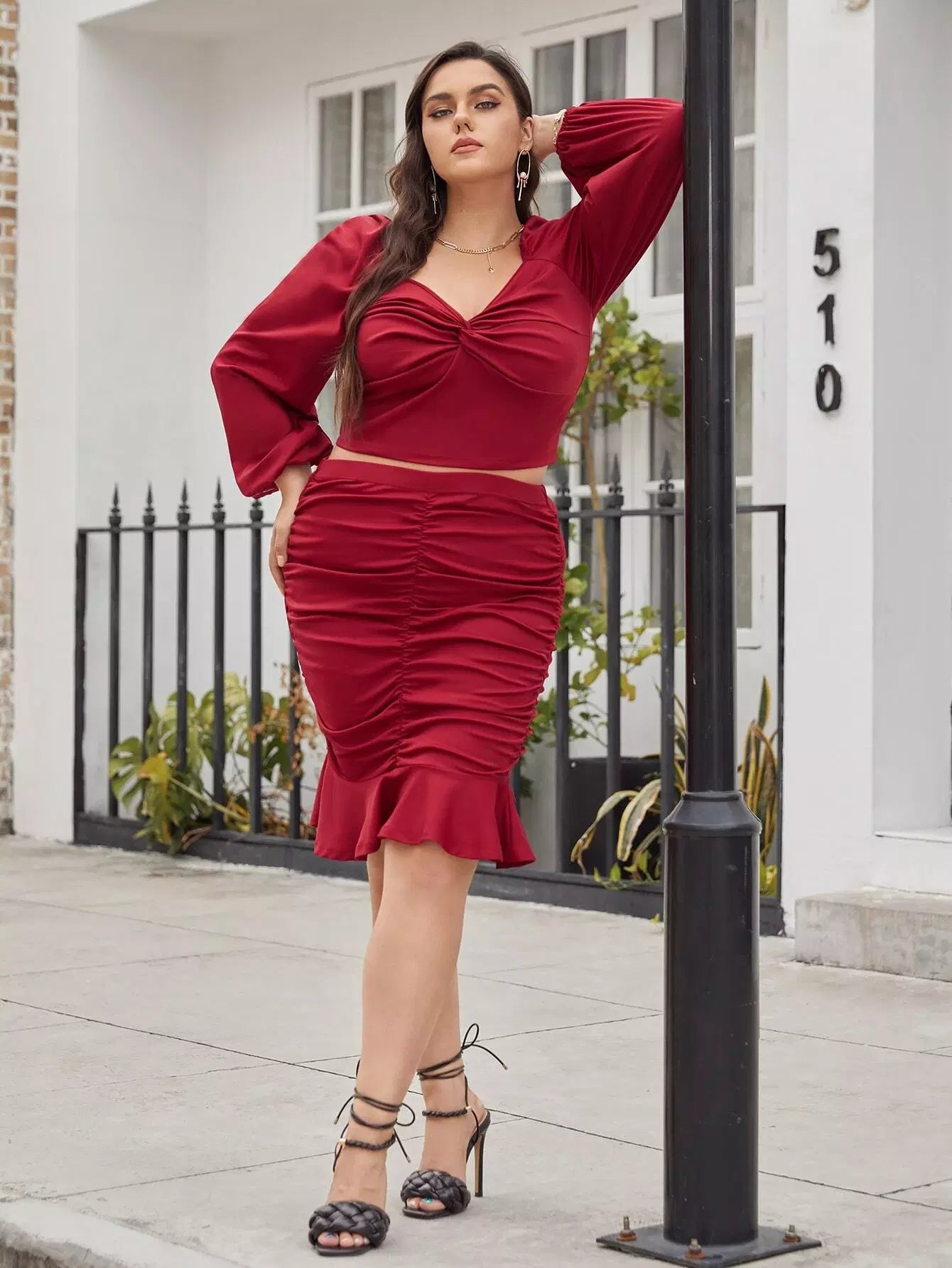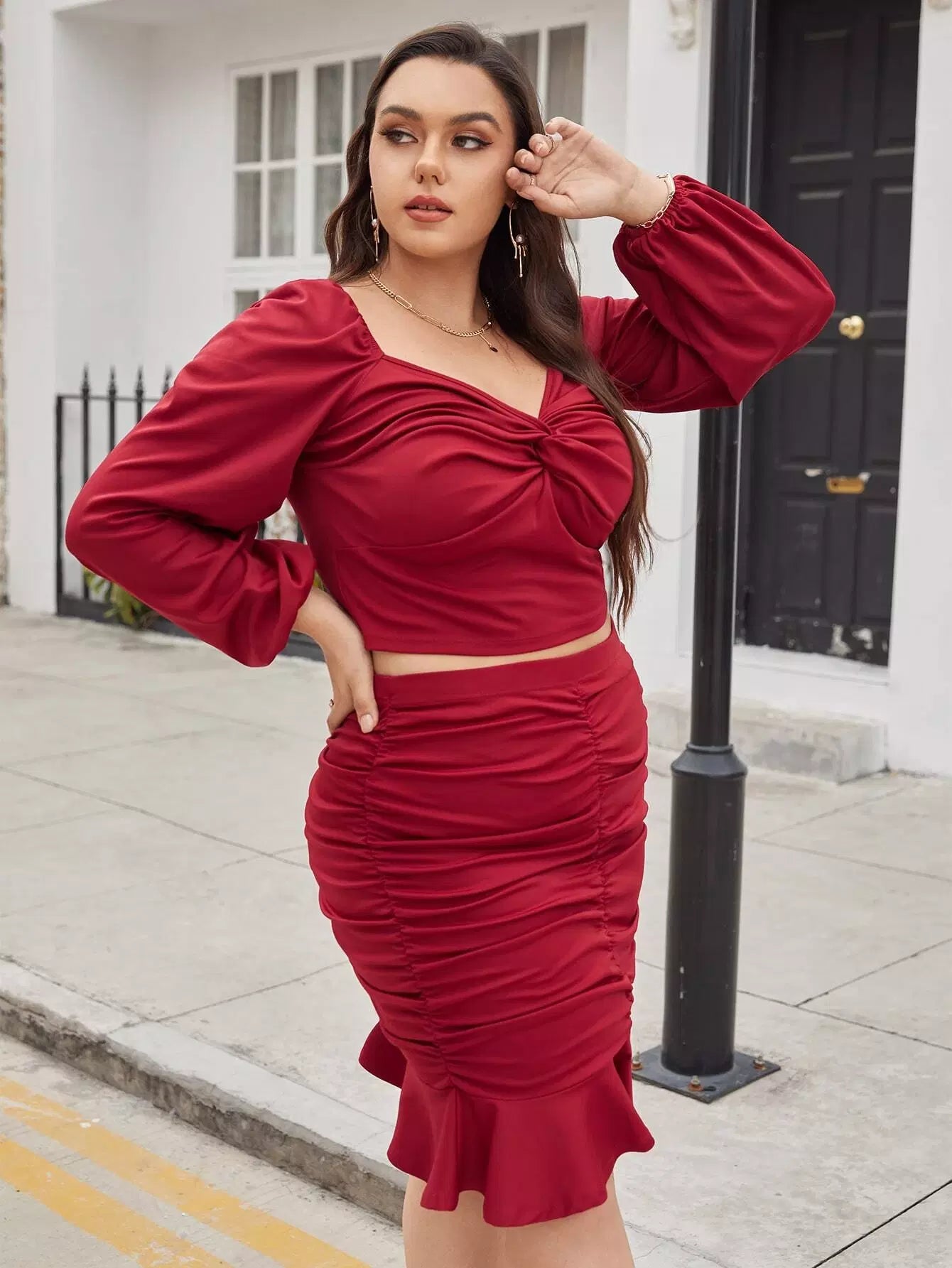 بلوزة قصيرة بفتحة أمامية ملتوية من الأمام وتنورة عالية الخصر مكشكشة ذات حواف مكشكشة