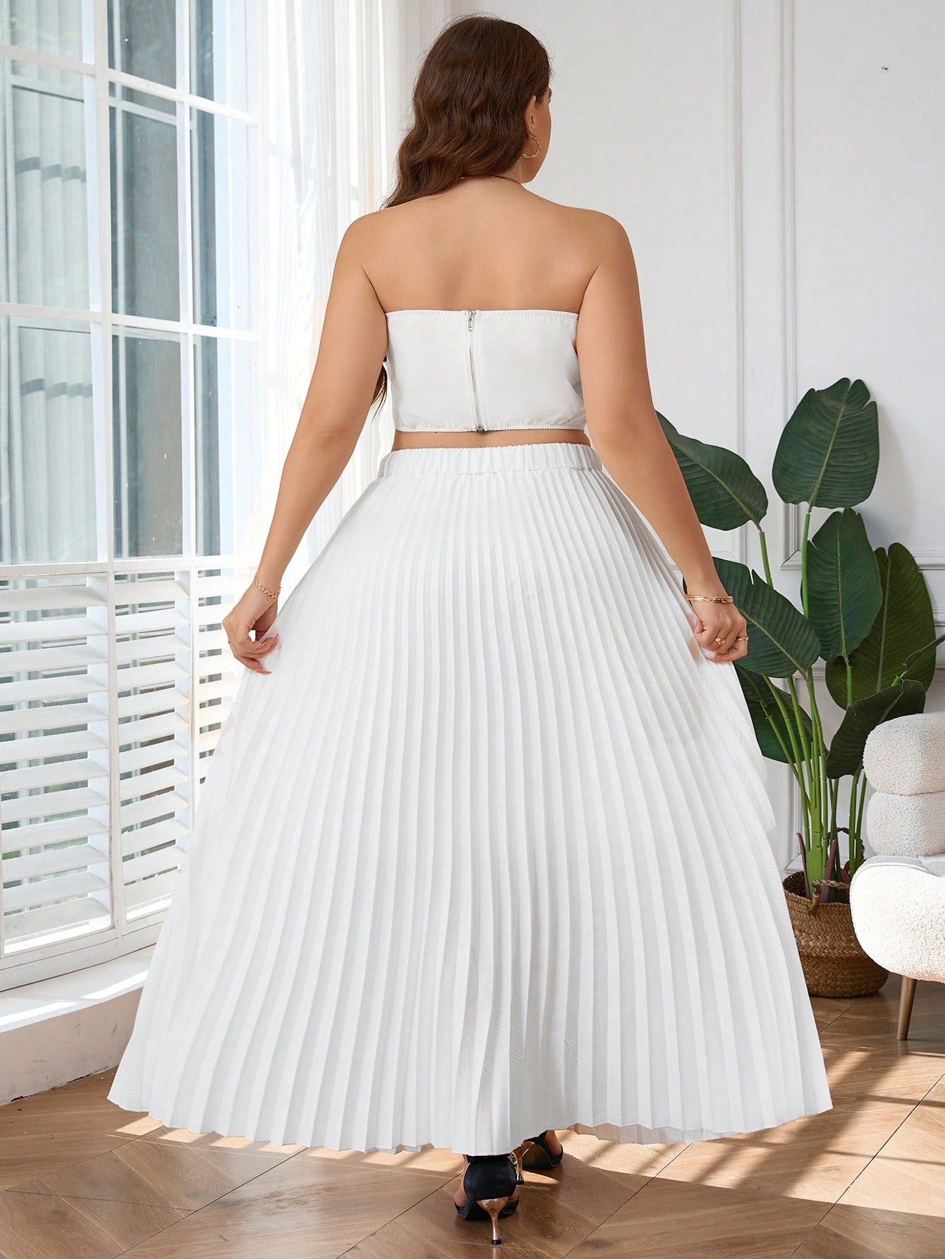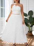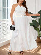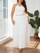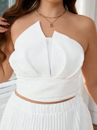 Privï½ Plus Size Women's 2 Pieces Set: Elegant White Asymmetrical Ruched Crop Top With Puff Collar And
