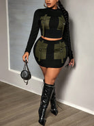 Slaydiva 2pcs/Set Plus Size Women Street Style Multi-Pocket Long Sleeve Top And Bodycon Midi Skirt Set