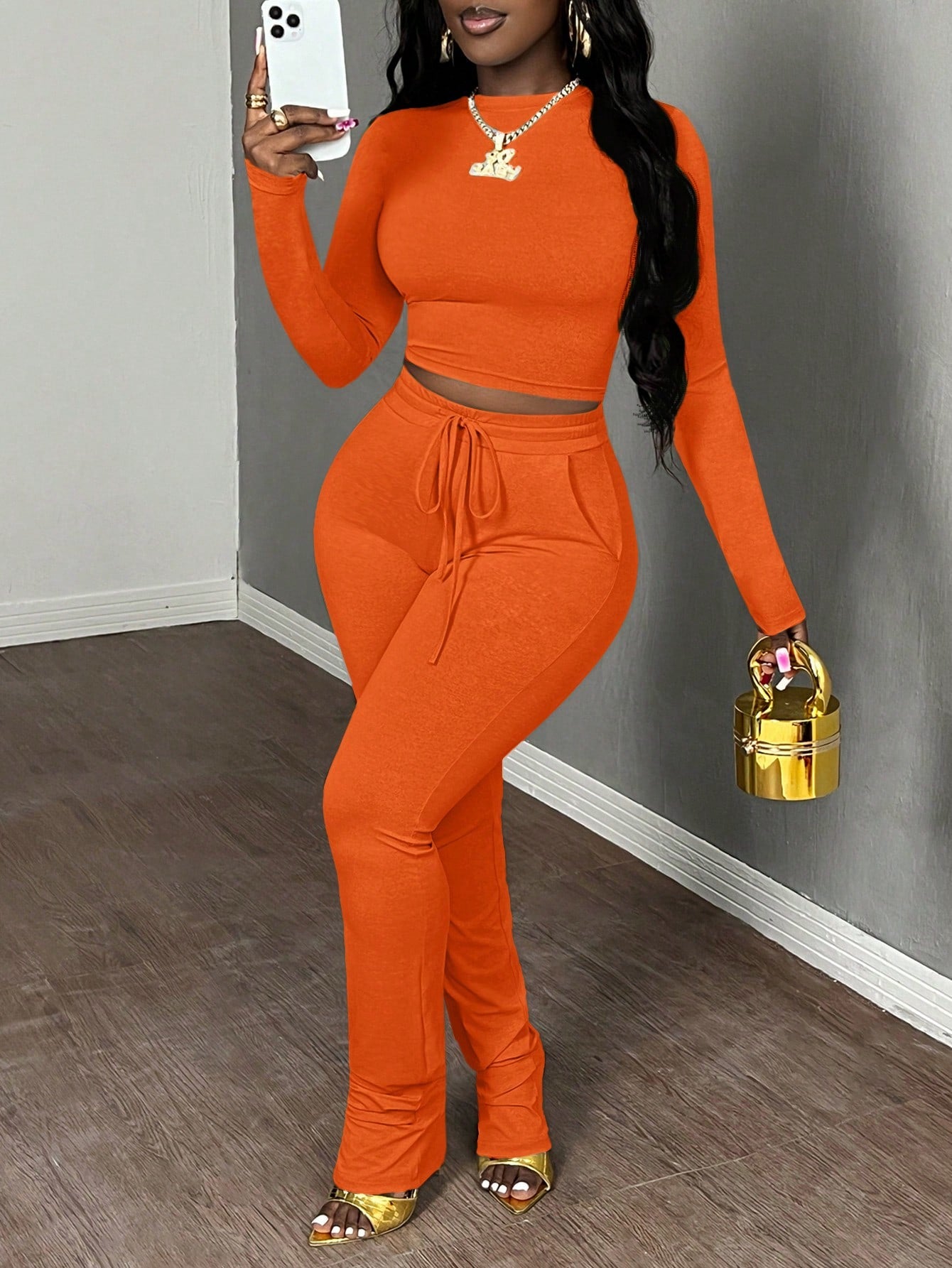 women Slaydiva Women 2pcs Set Basic Casual Tight Fitting Crew Neck Long Sleeve Top & Drawstring Elastic Waist Tight Fitted Pants Suit