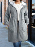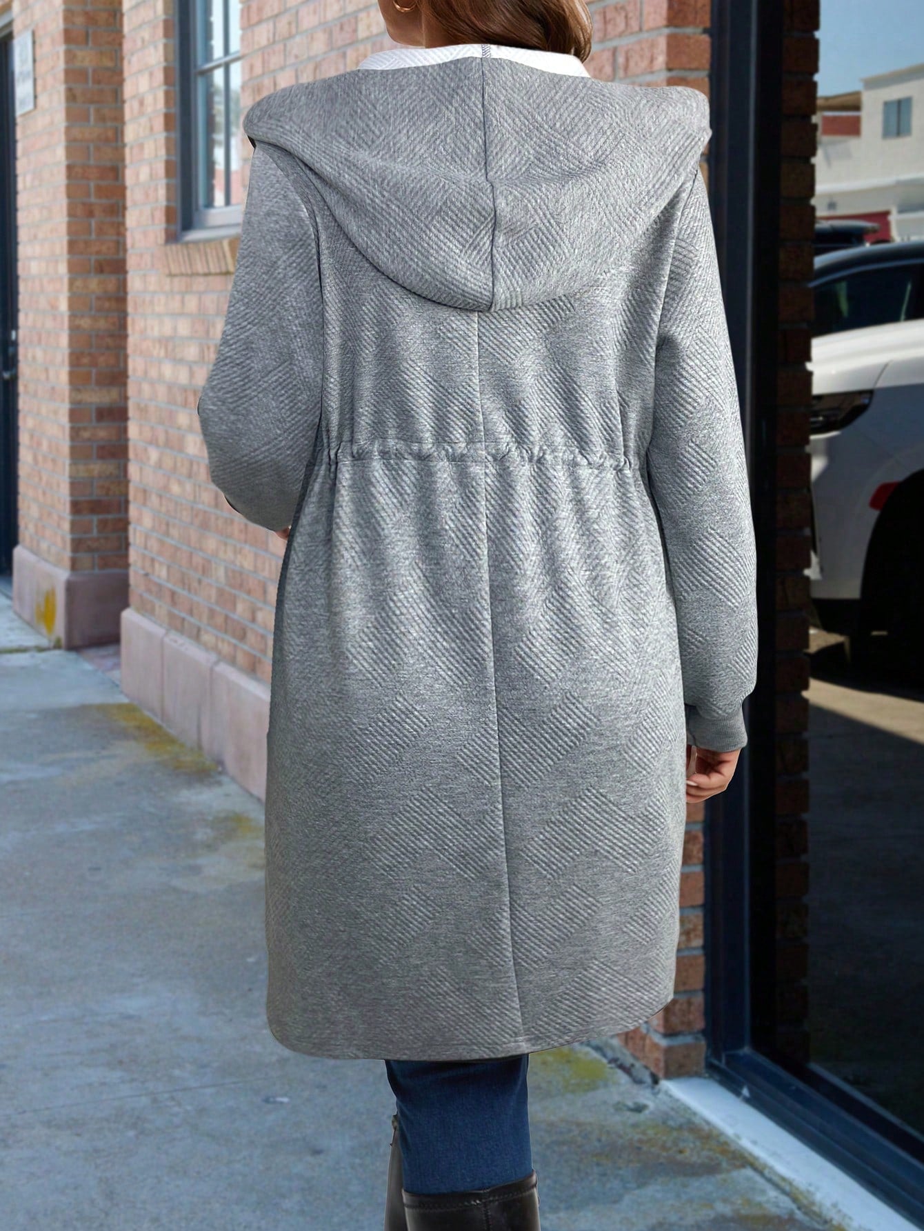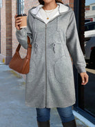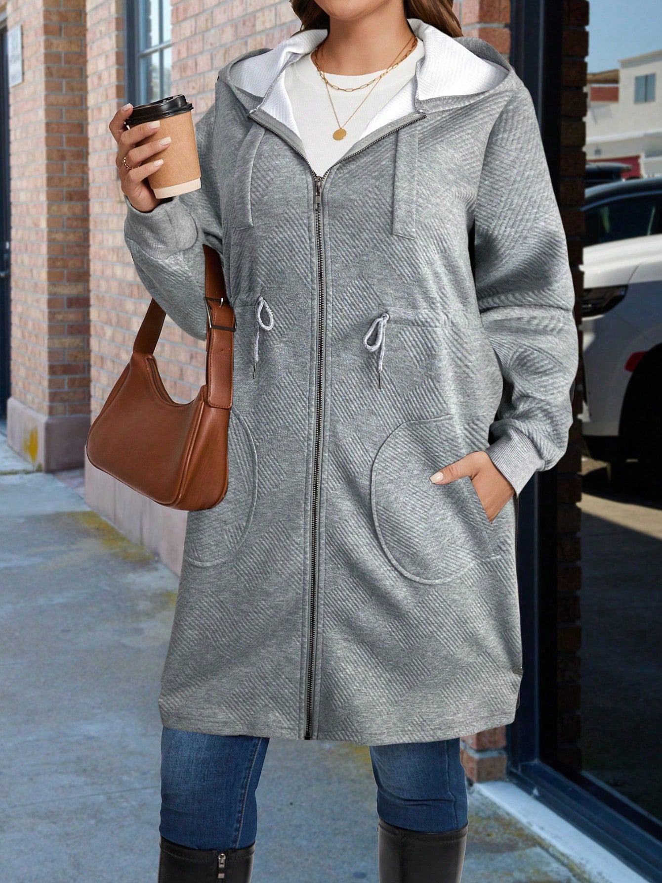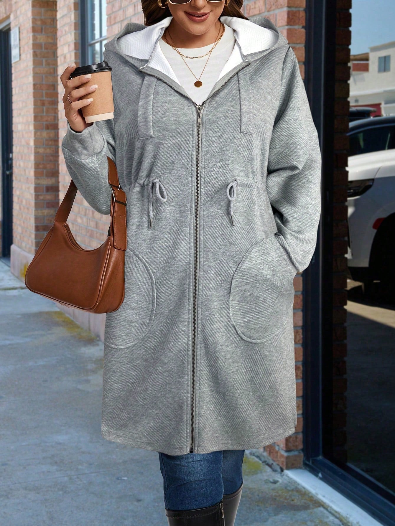 Plus Size Hooded Zipper Jacket Featuring Asymmetric Plaid Textured Fabric And Cinched Waist