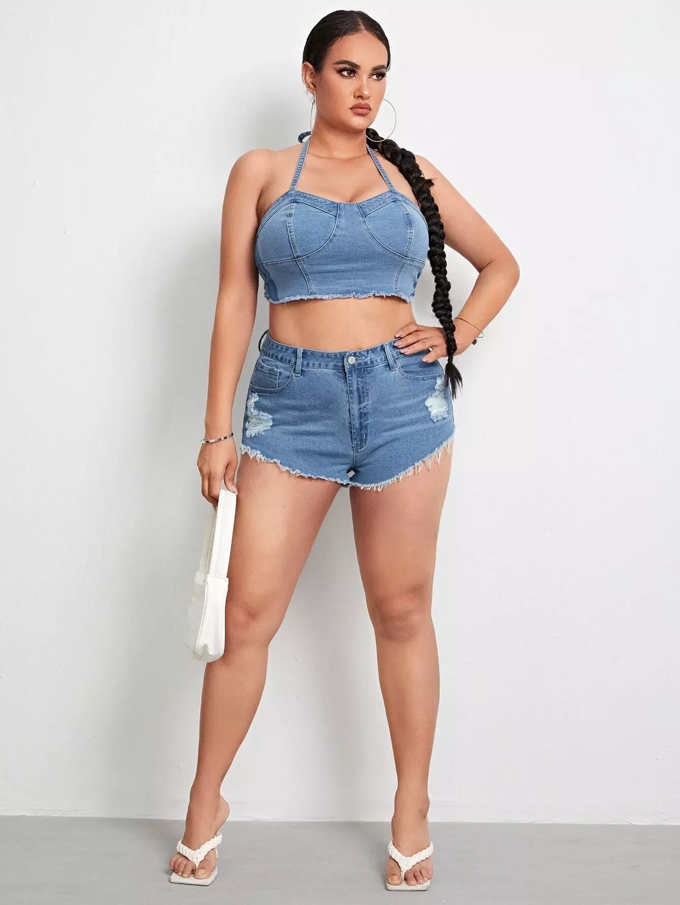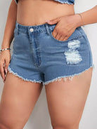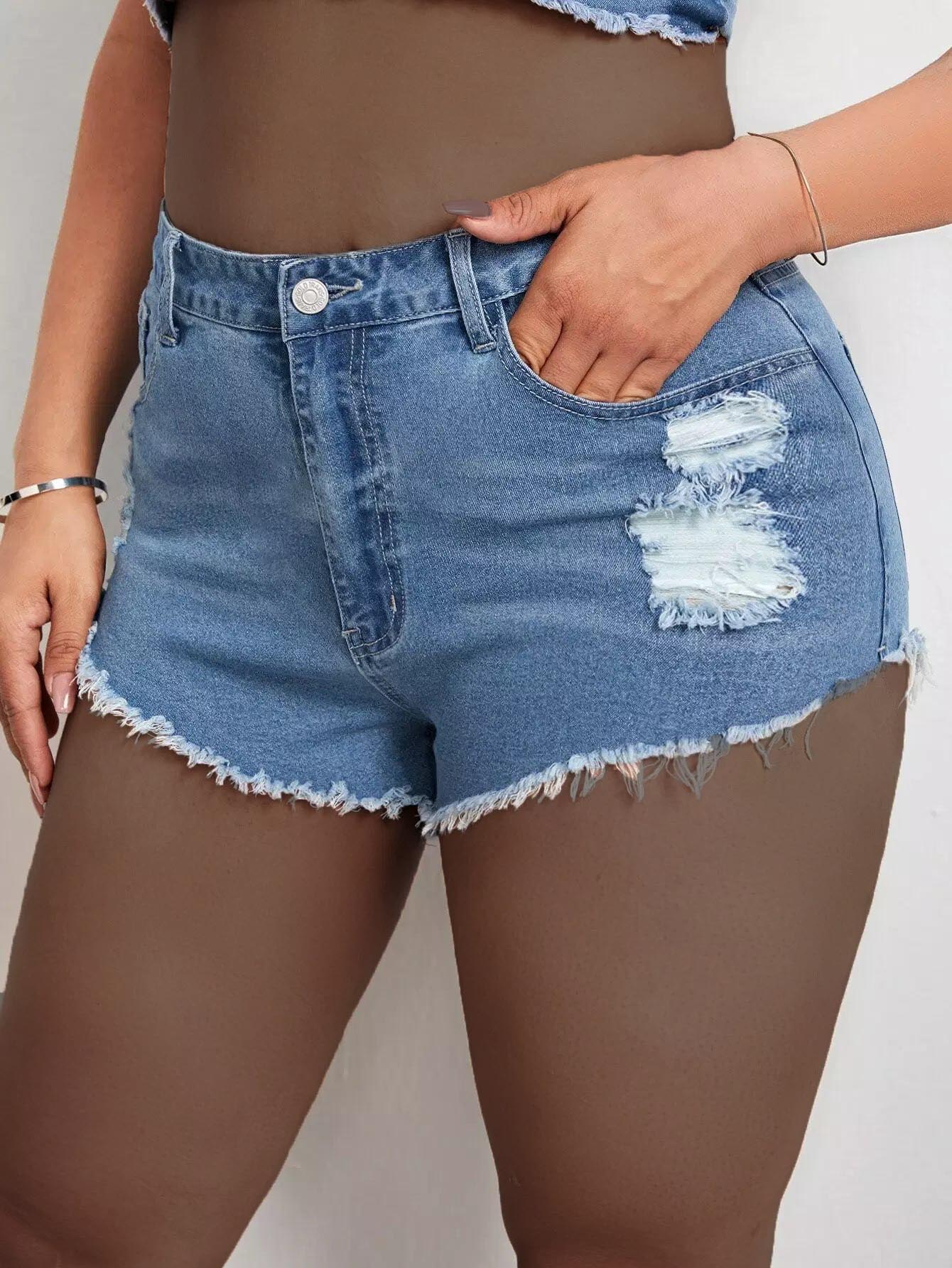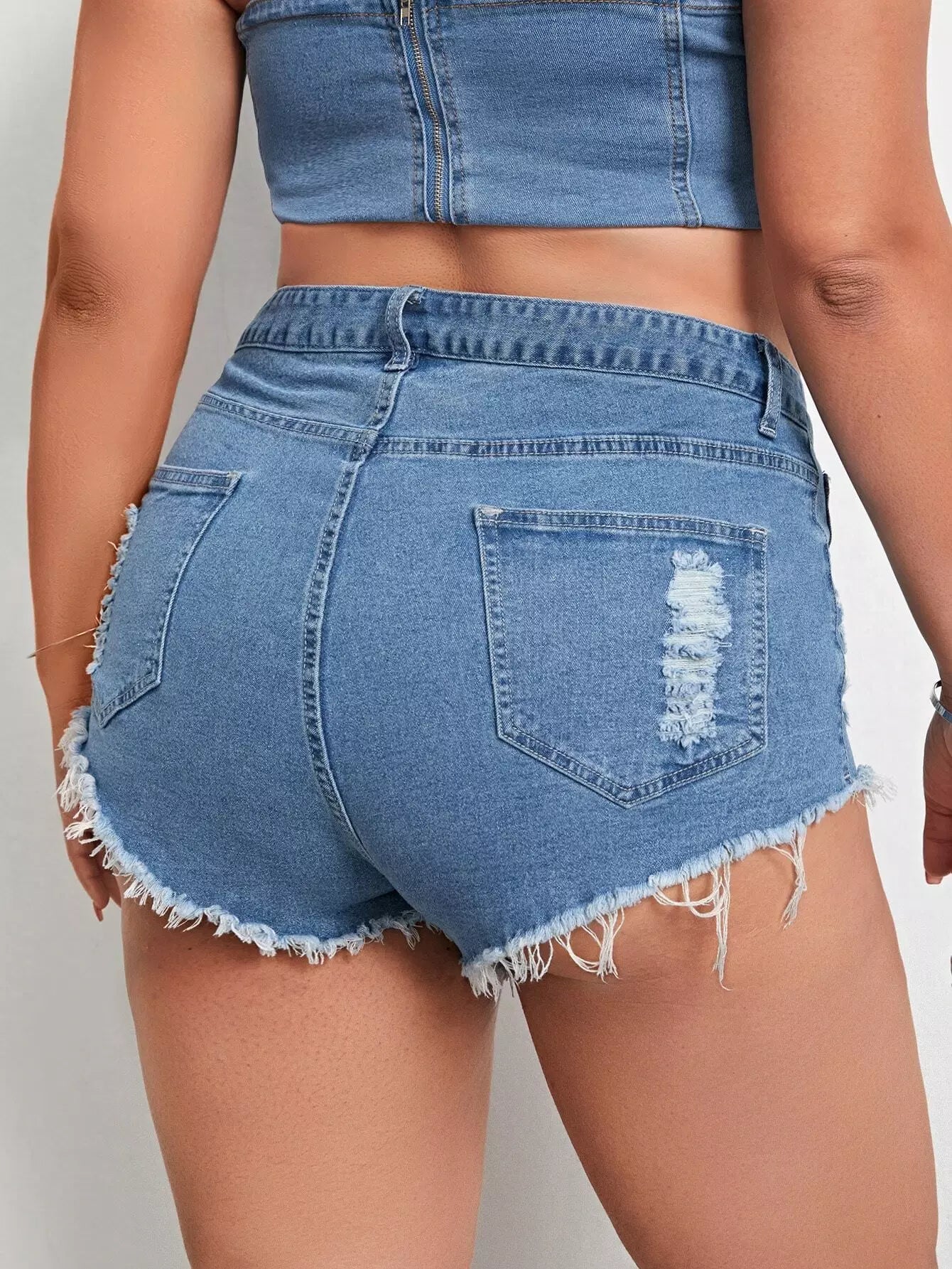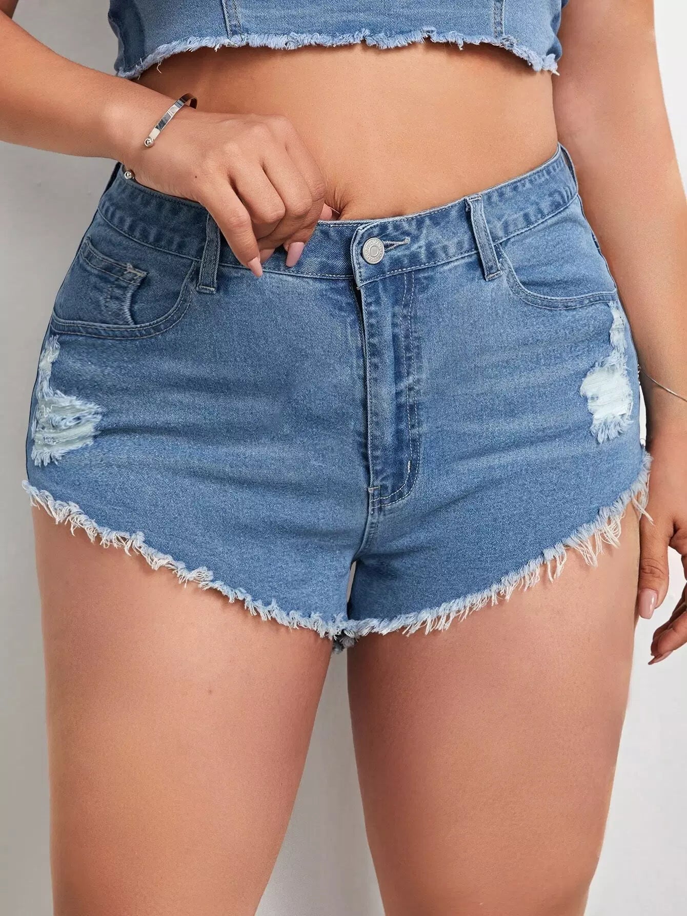 شورت جينز ممزق عالي الخصر عالي الخصر بحاشية خمر ممزق