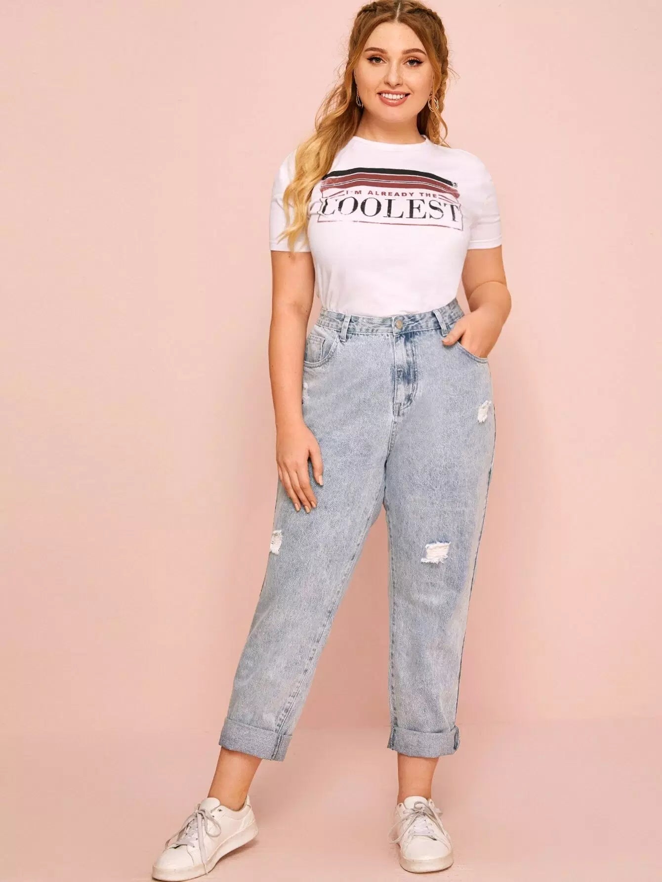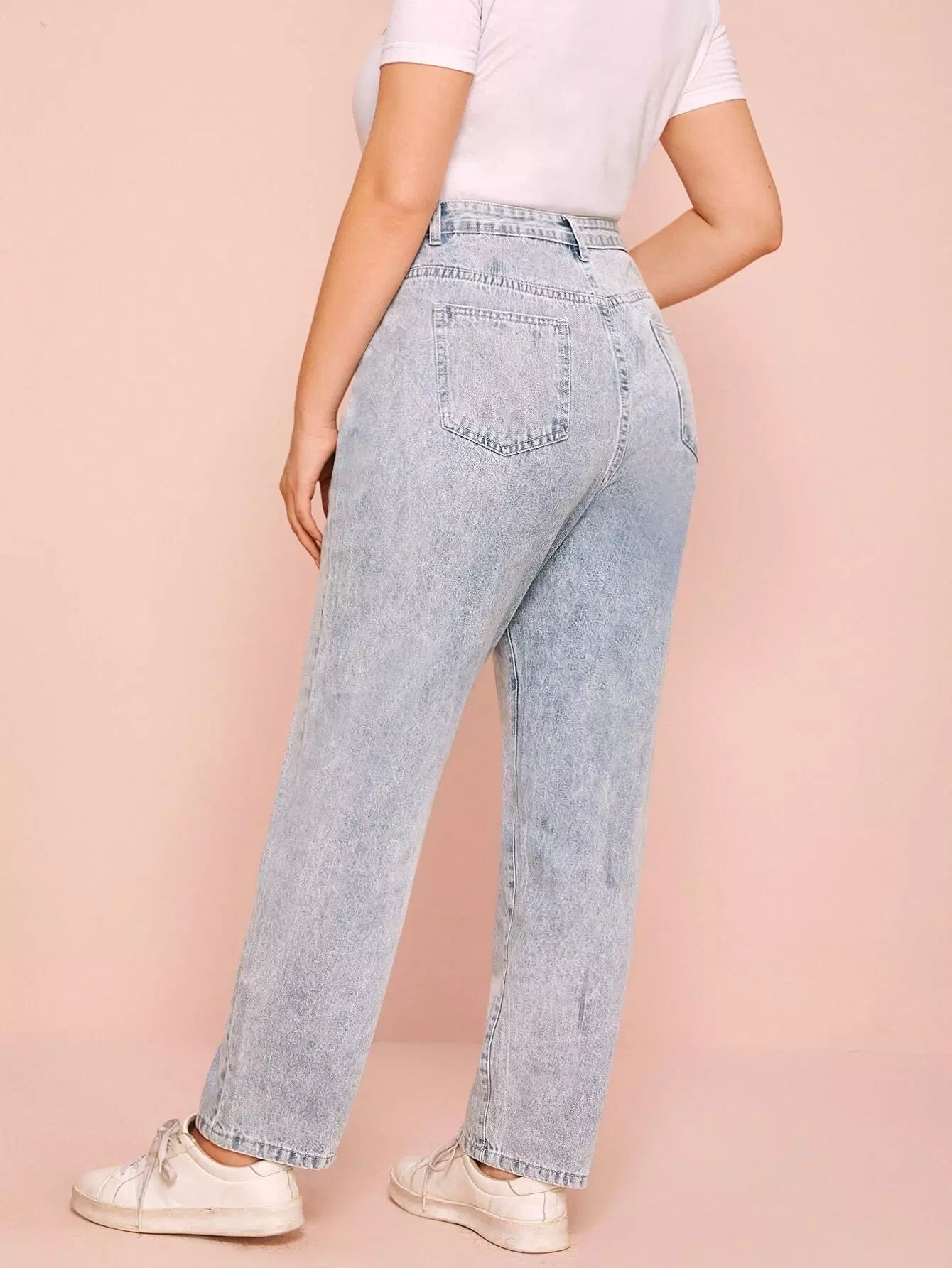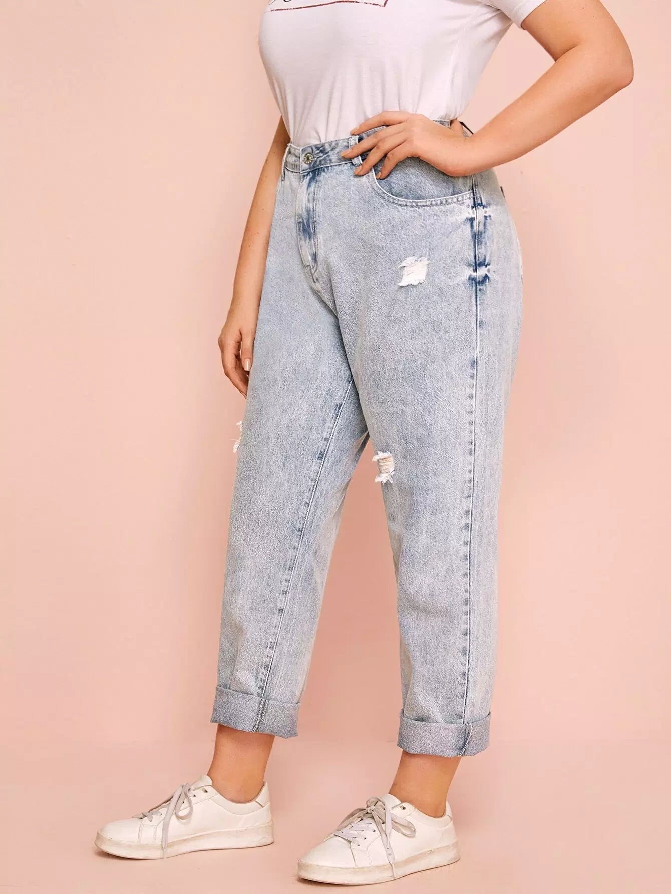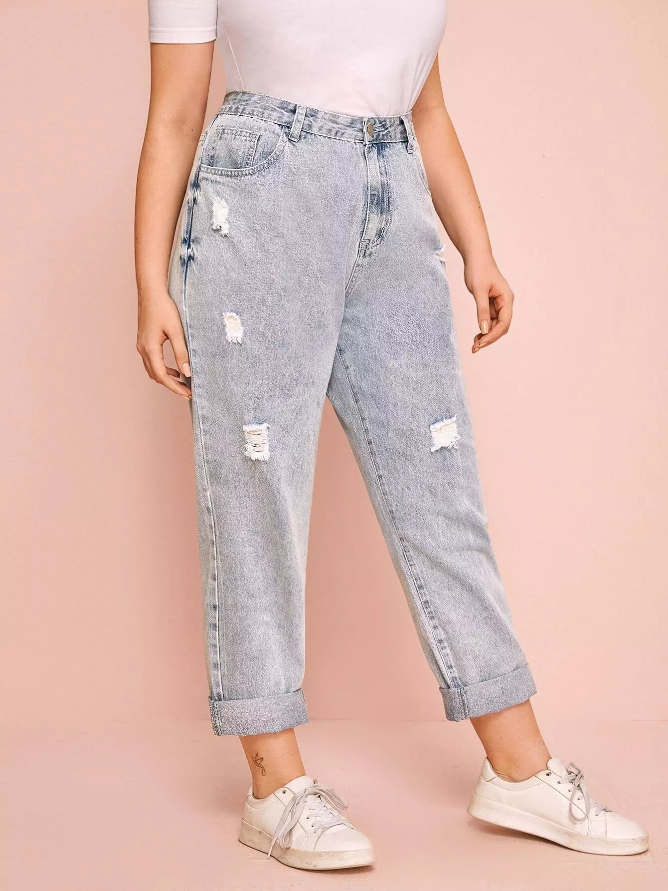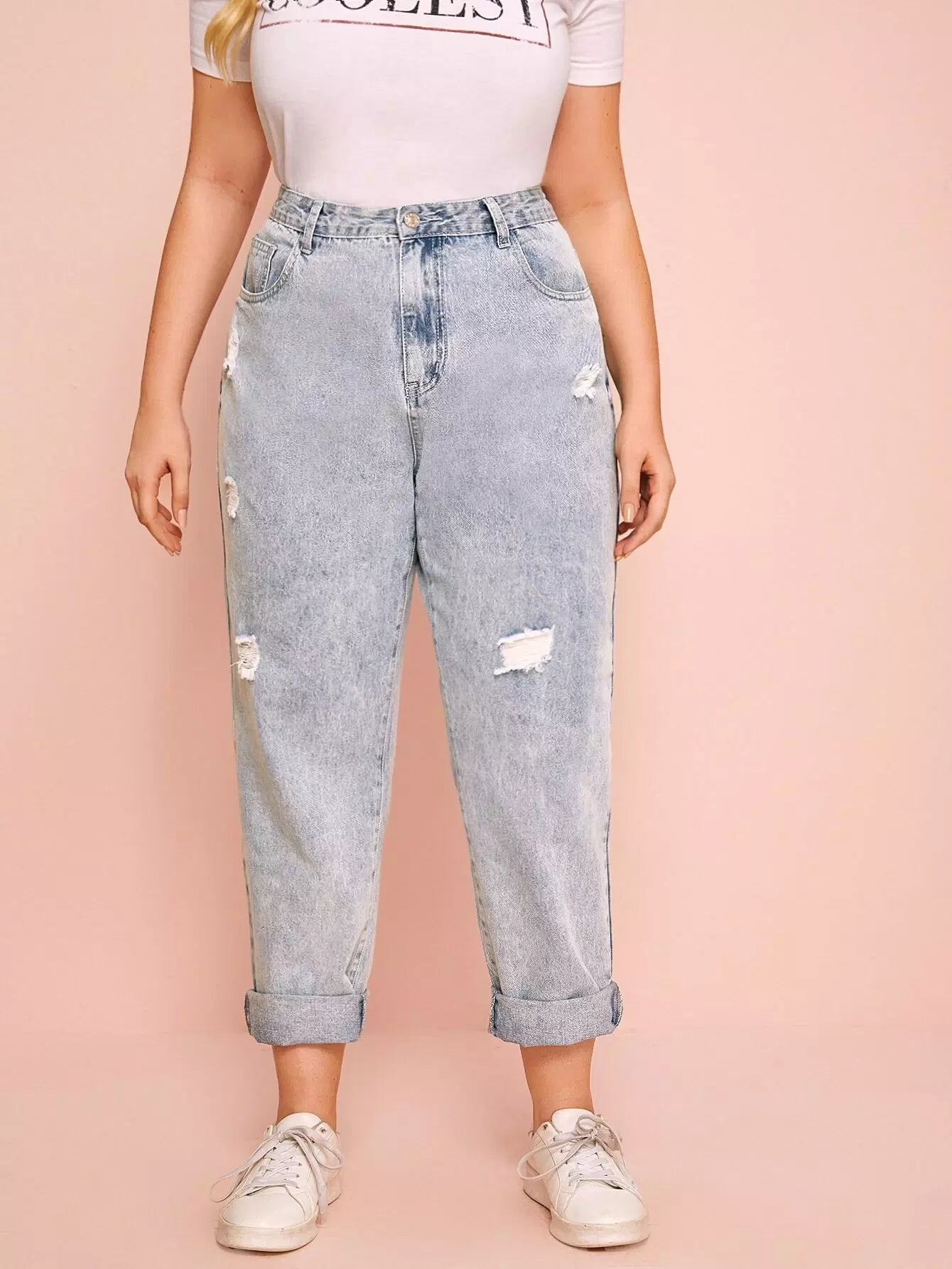 نحيف - مقاس كبير جينز أمي ممزق مغسول خفيف