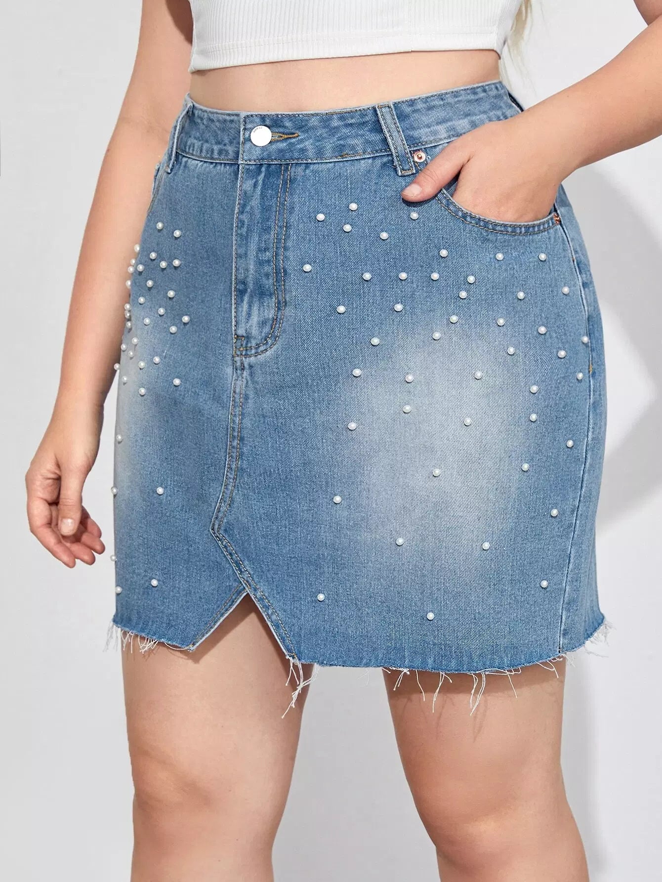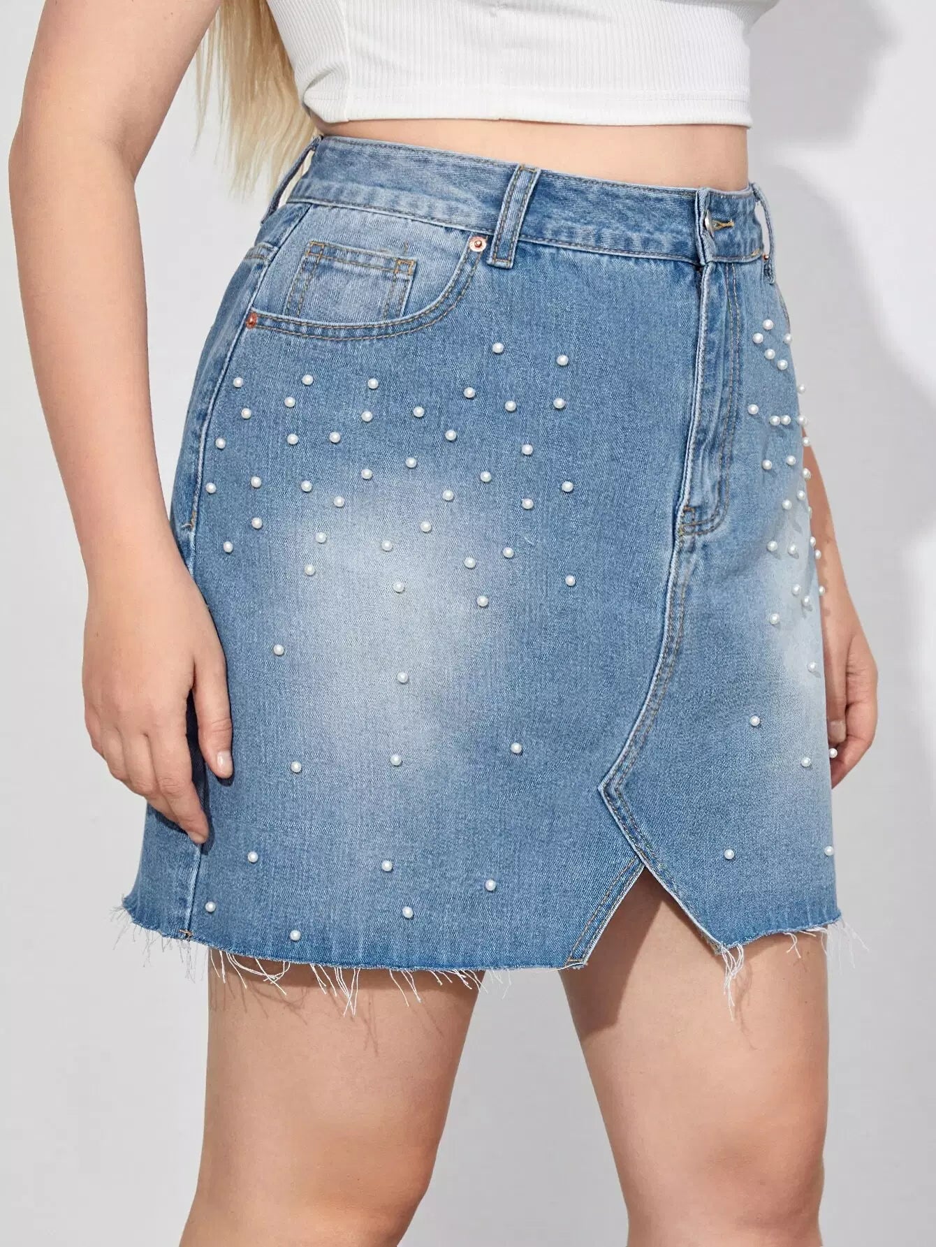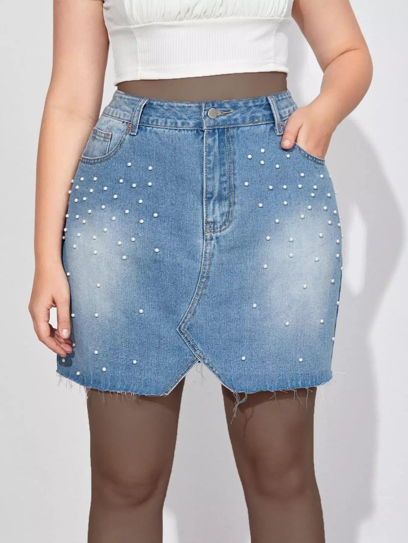 تنورة دنيم مطرزة بالخرز واللؤلؤ زائد