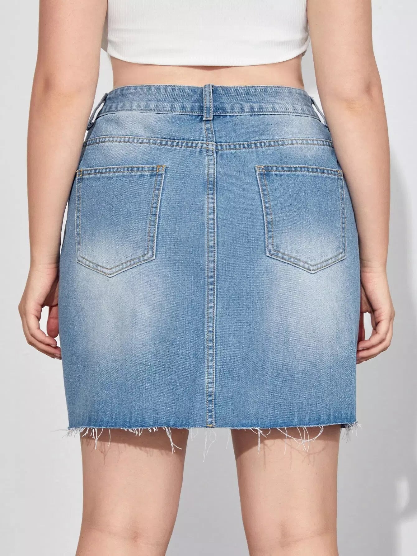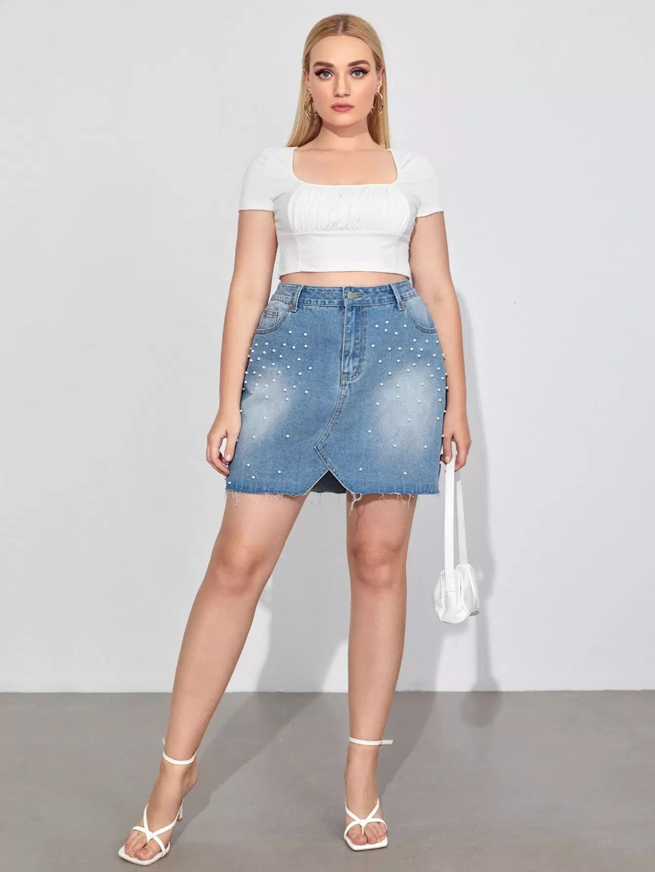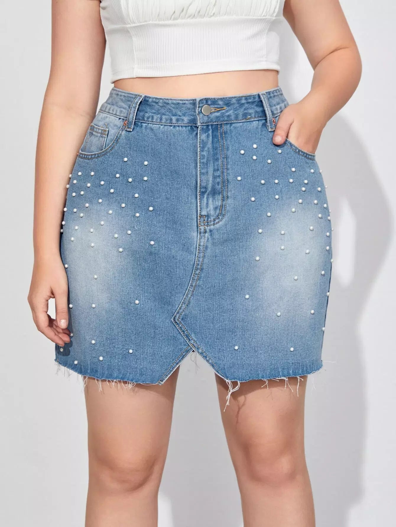 تنورة دنيم مطرزة بالخرز واللؤلؤ زائد