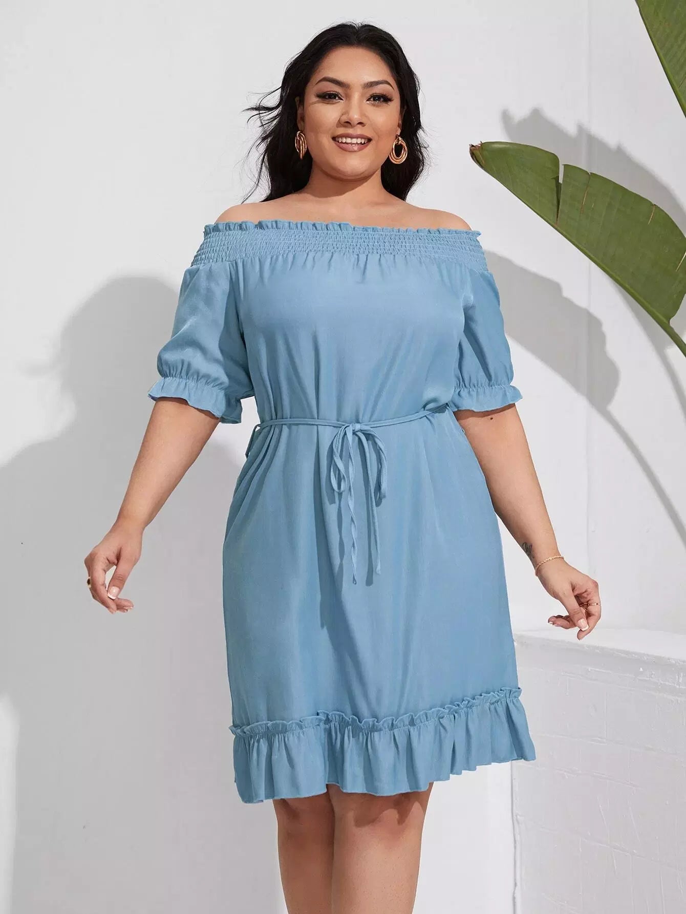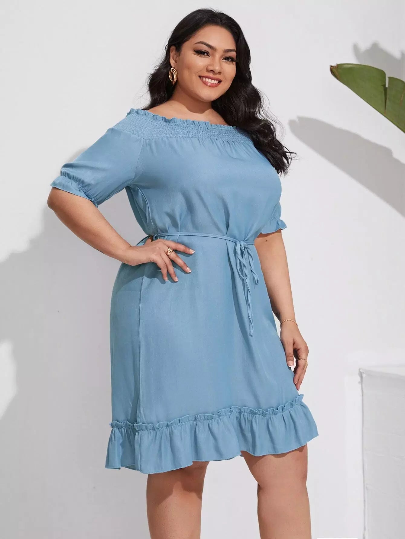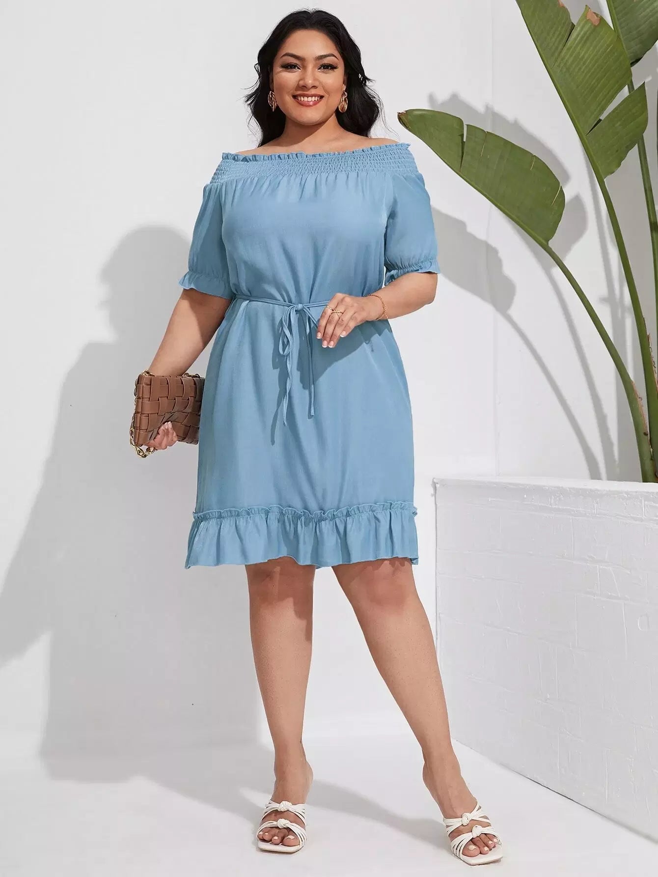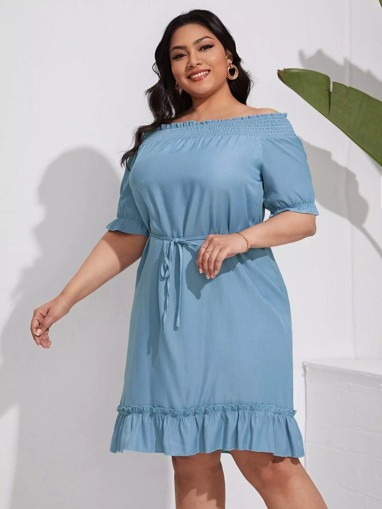 بالإضافة إلى فستان من الدنيم بحاشية مكشكشة مكشوفة الكتفين بدون حزام
