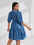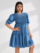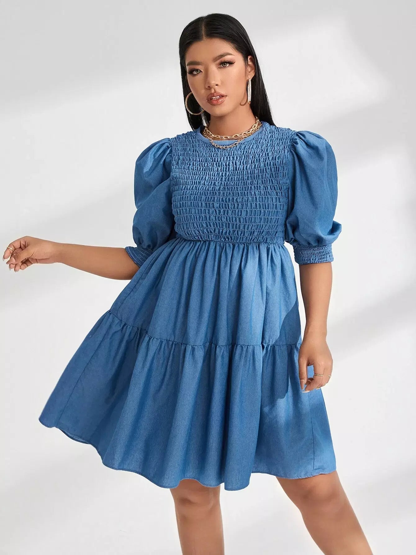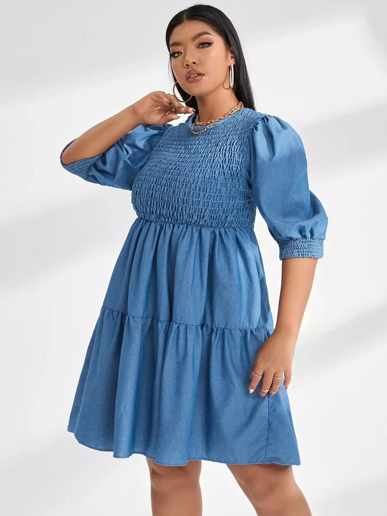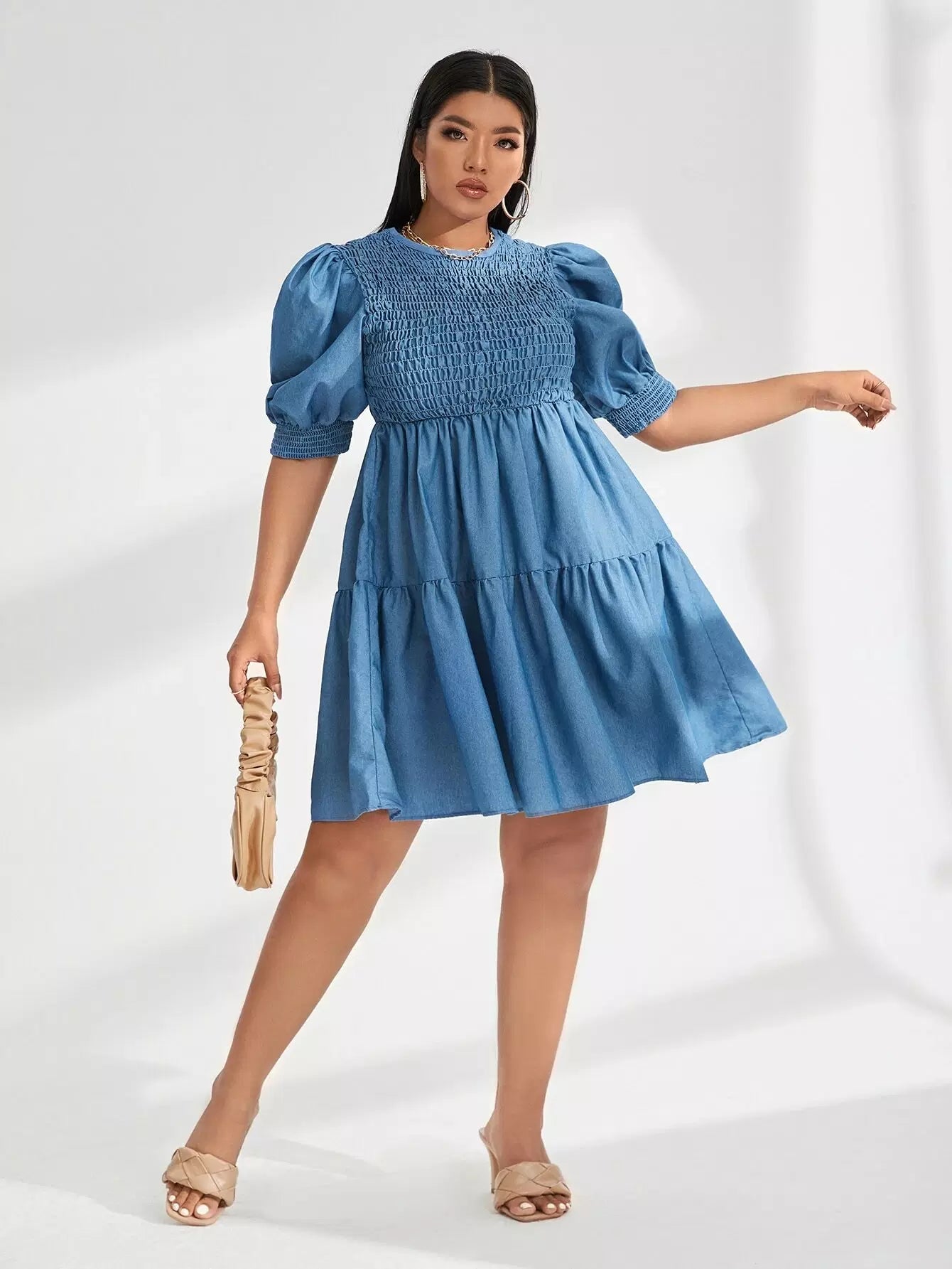 فستان دنيم بأكمام منفوشة بأكمام منفوشة زائد