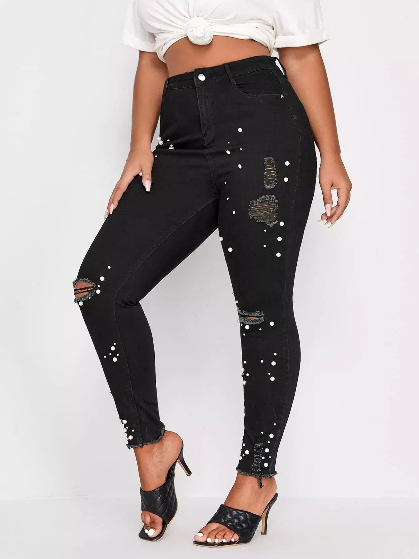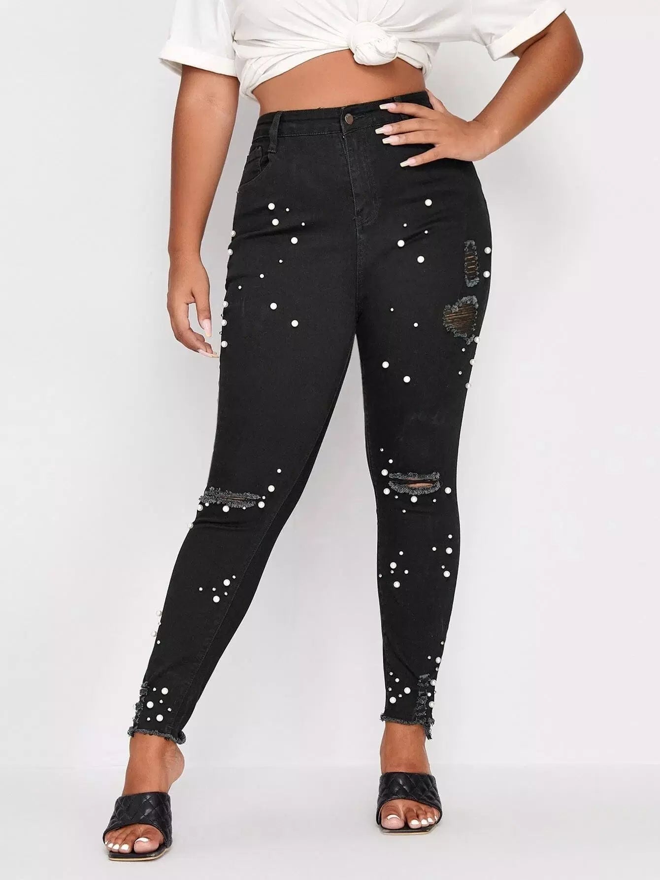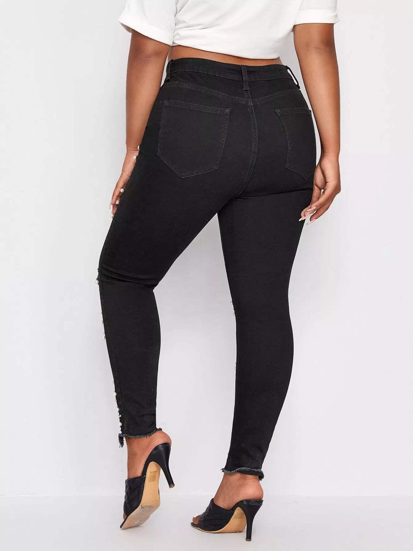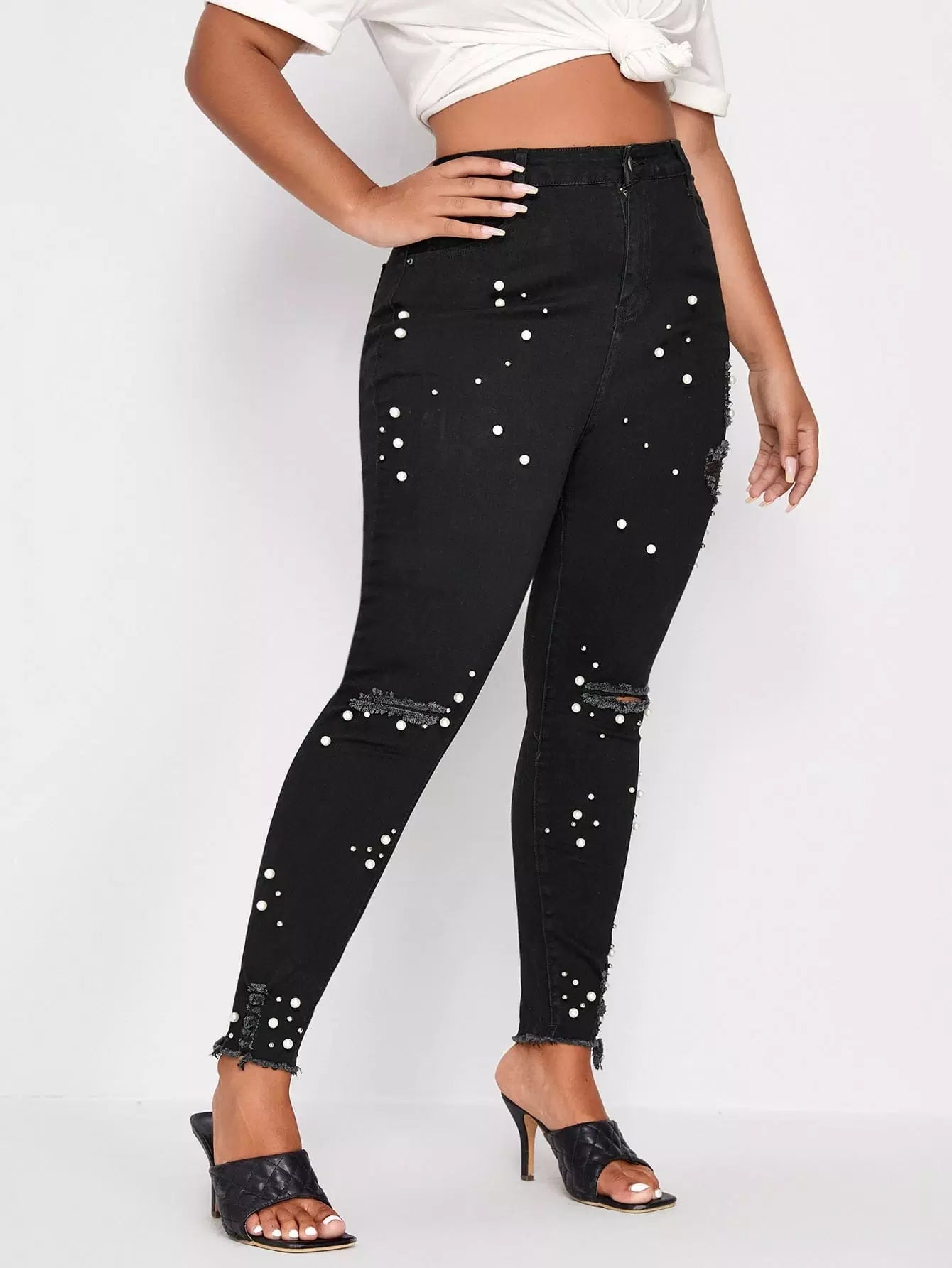 نحيف - مقاس كبير جينز مطرز باللؤلؤ الممزق بحاشية خام