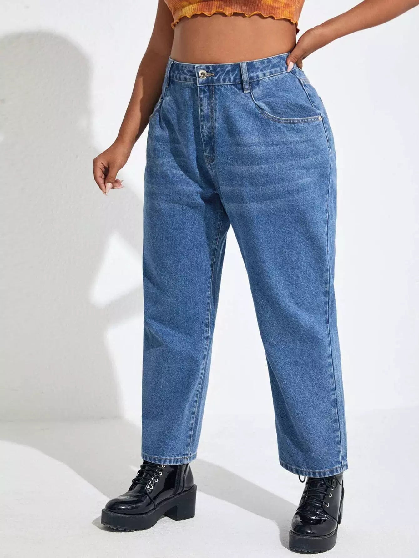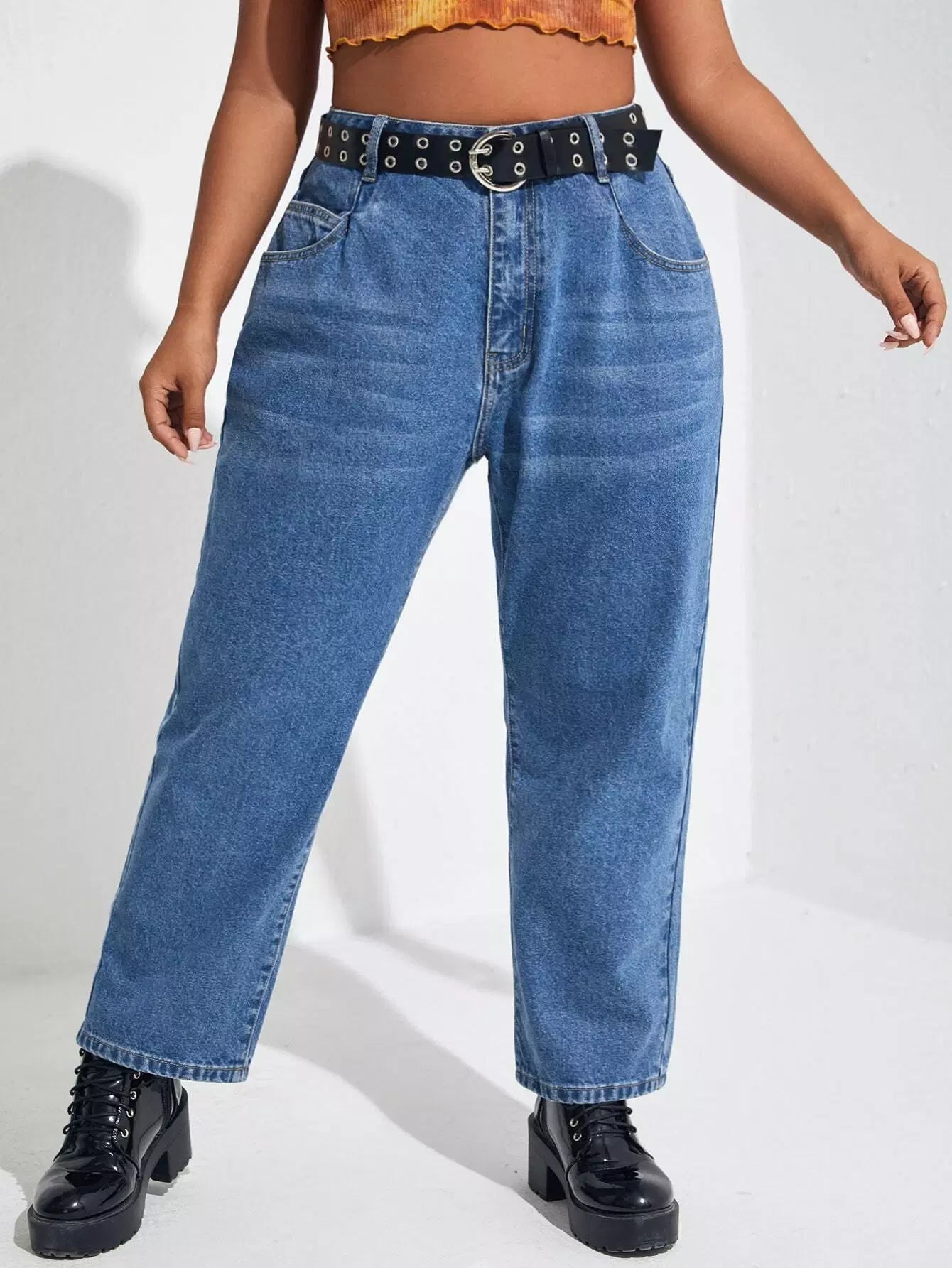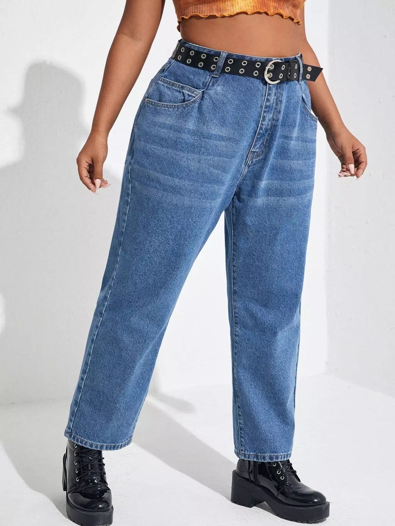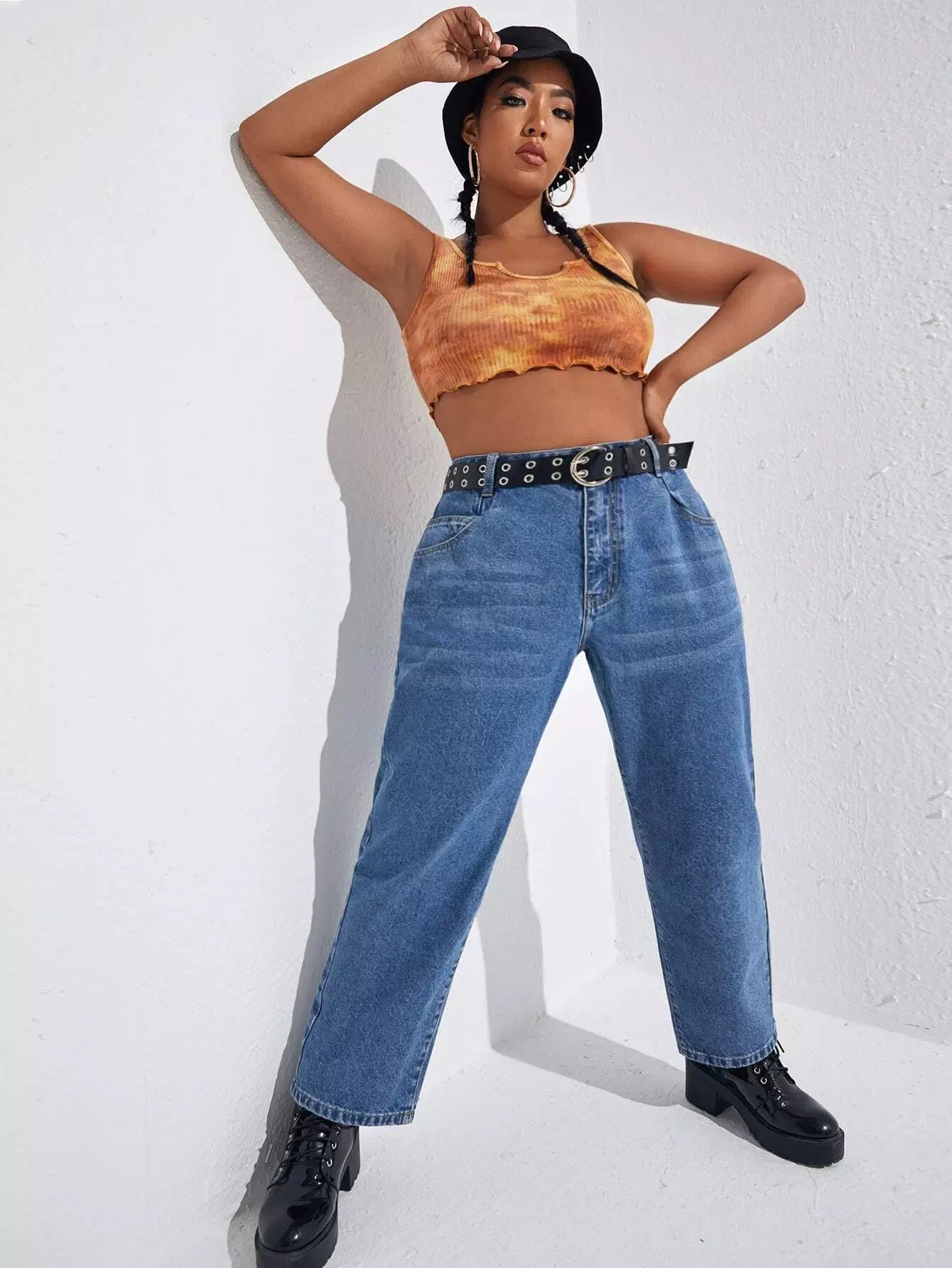 بالإضافة إلى بنطال جينز سادة بأرجل مستقيمة بدون حزام