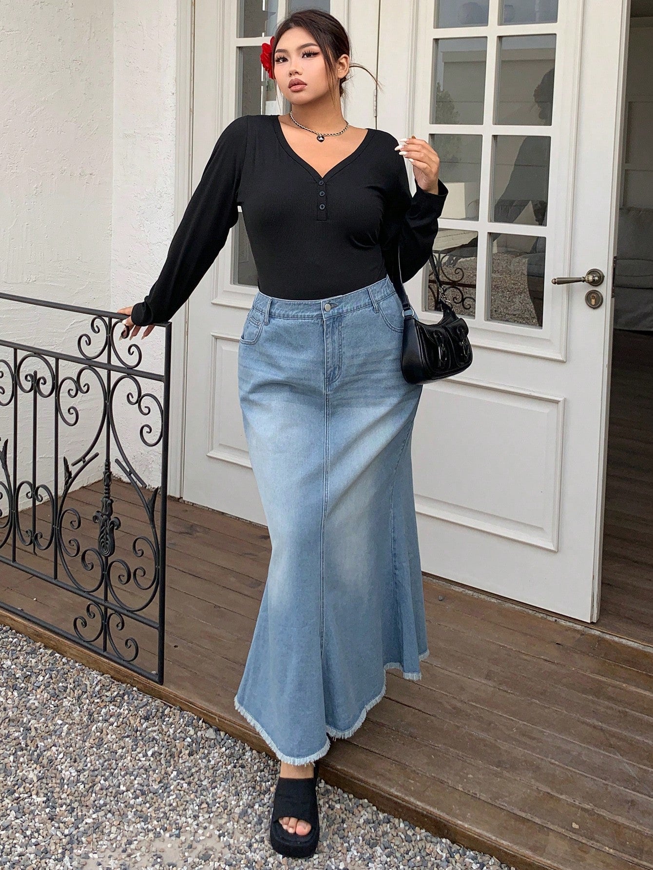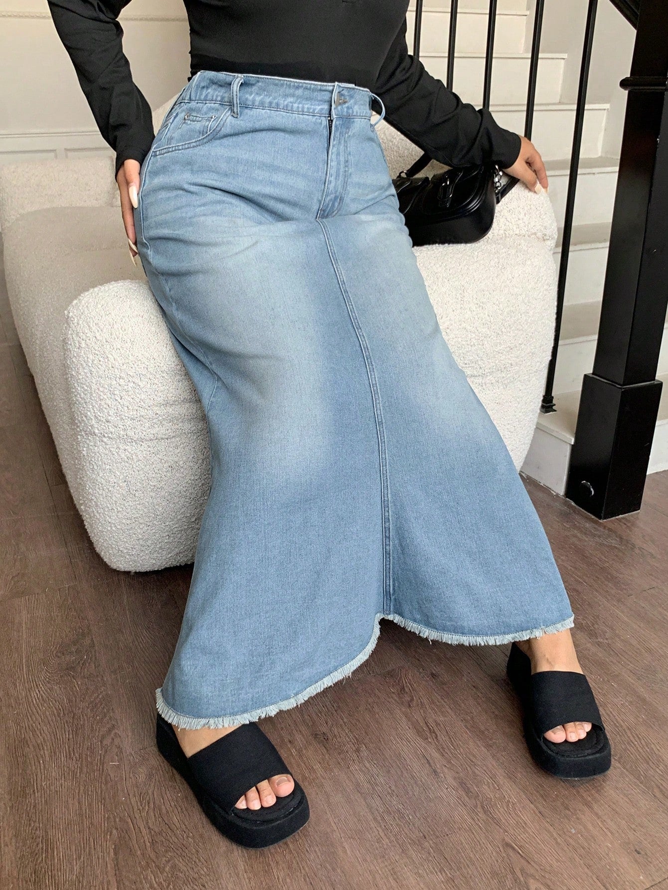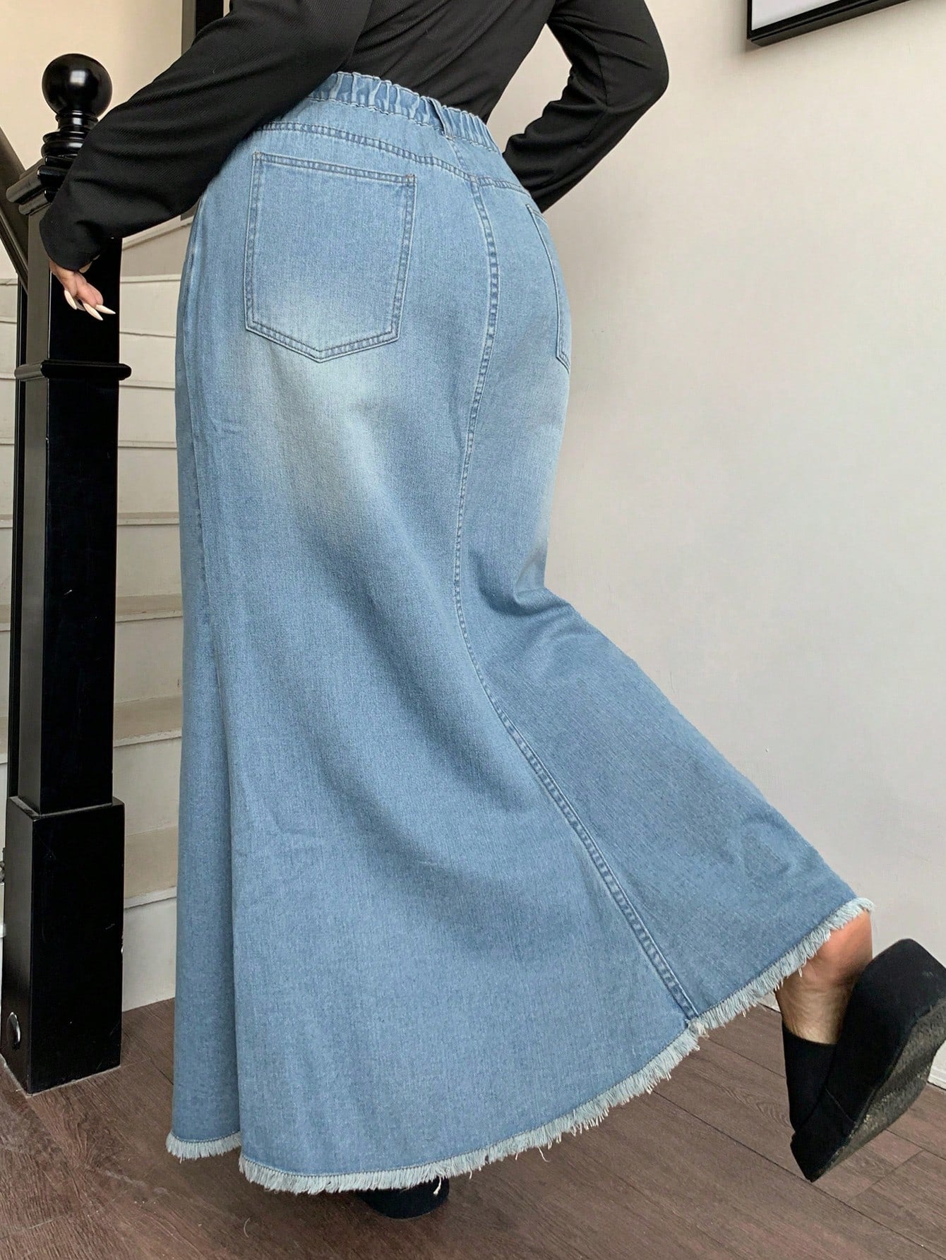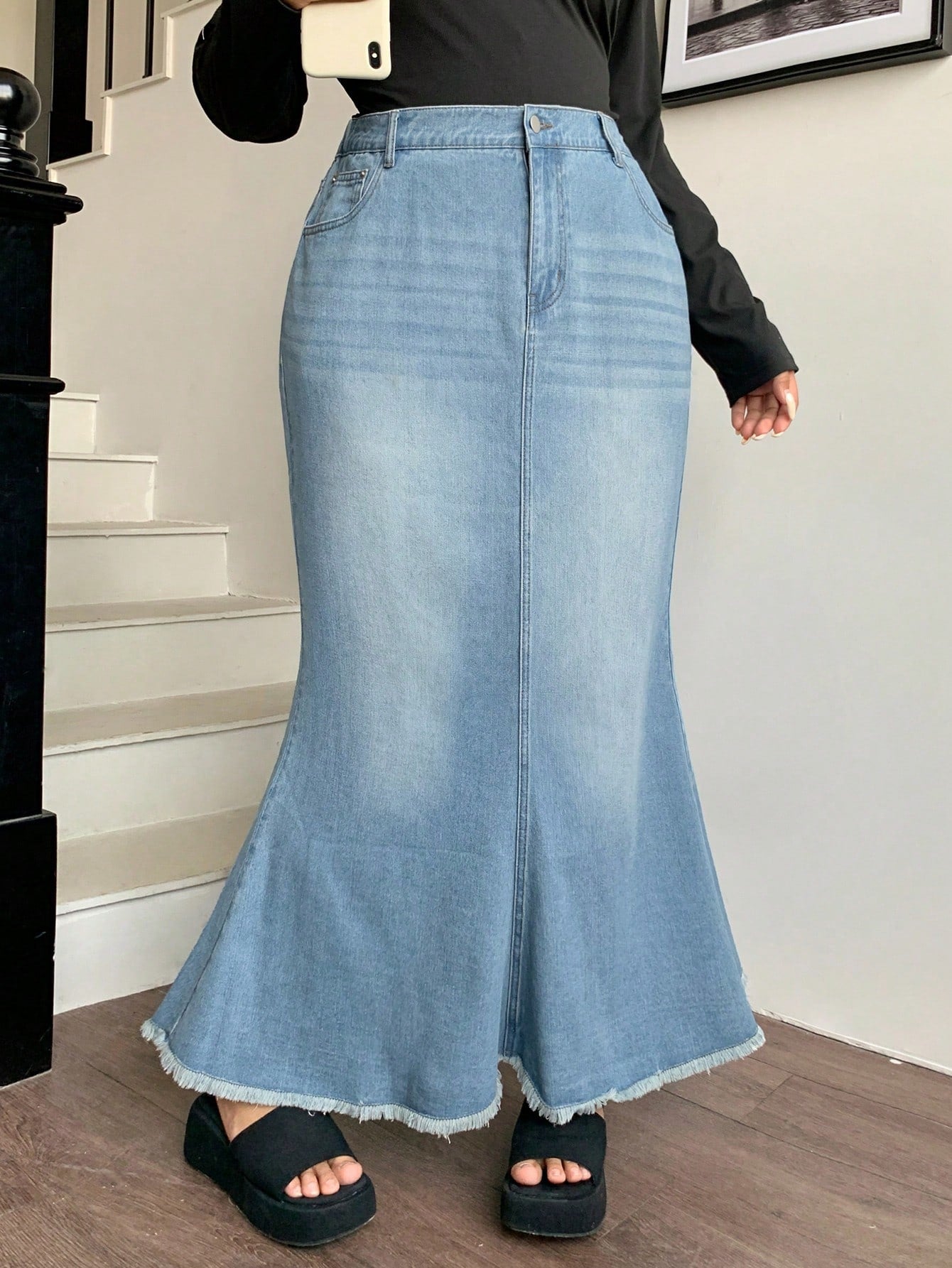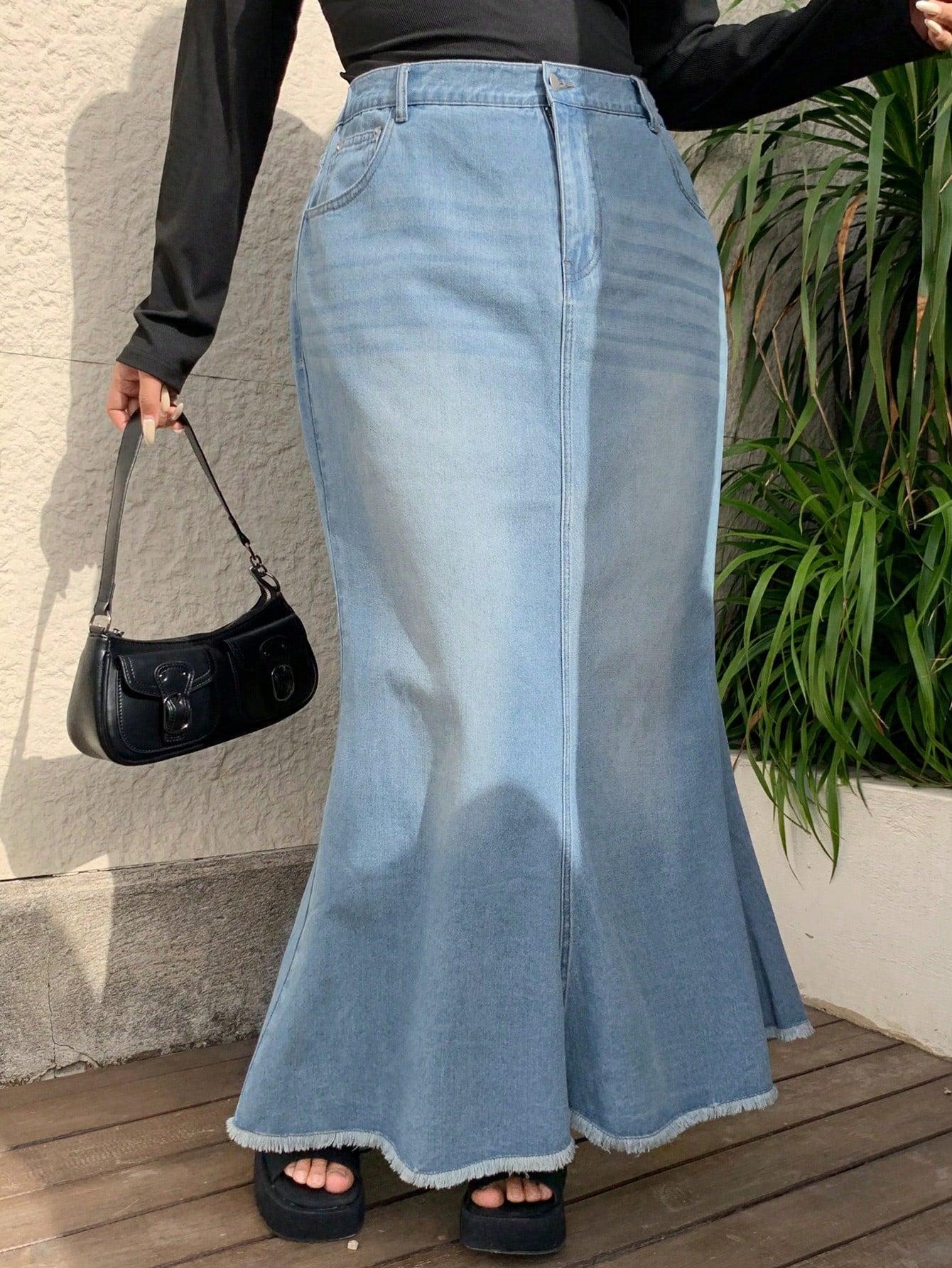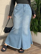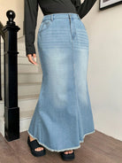 تنورة جينز عالية الخصر بتصميم ذيل السمكة من Dazy Plus، مقاسات كبيرة، بحافة ممزقة.