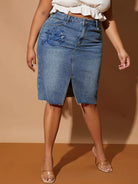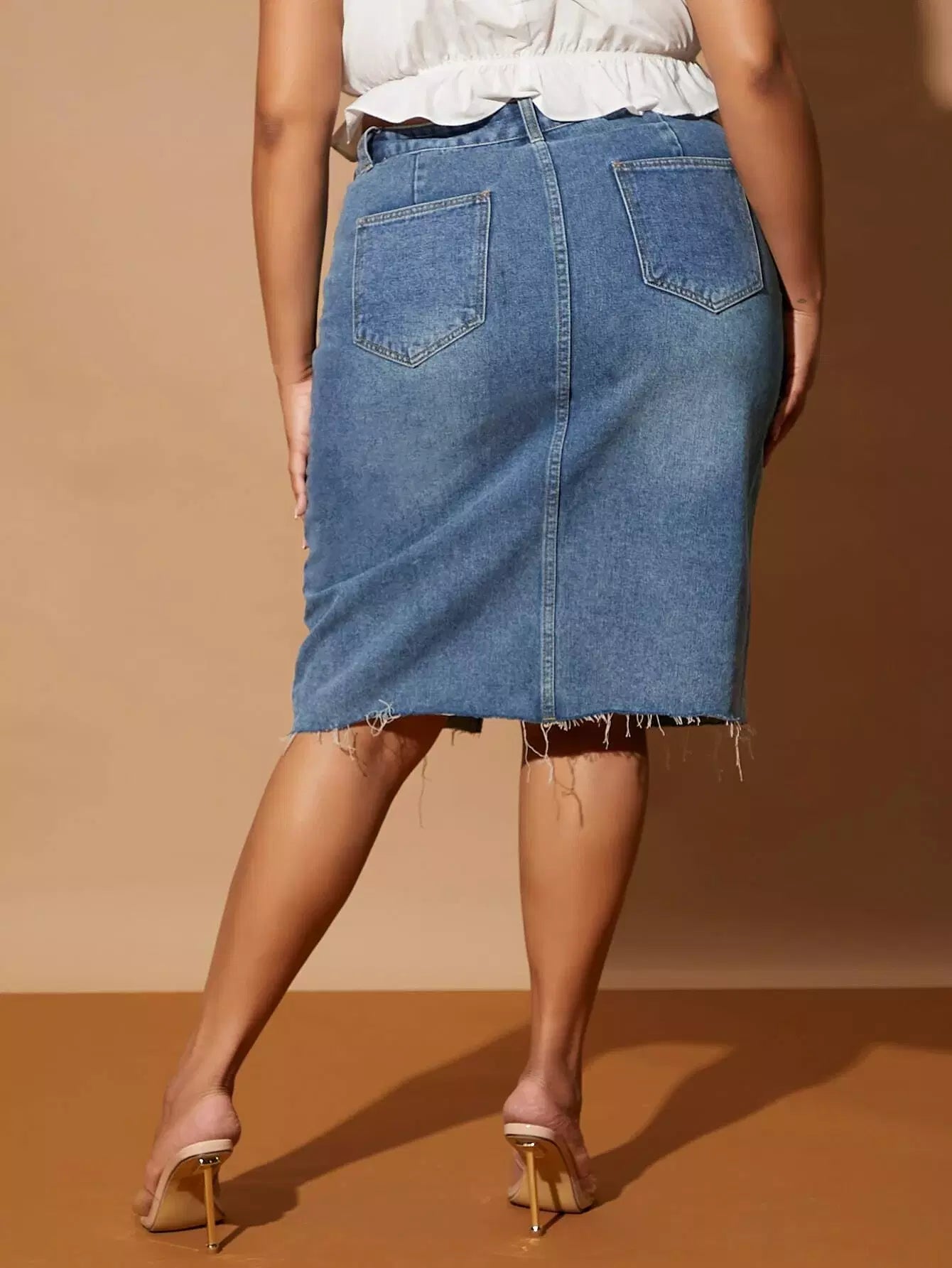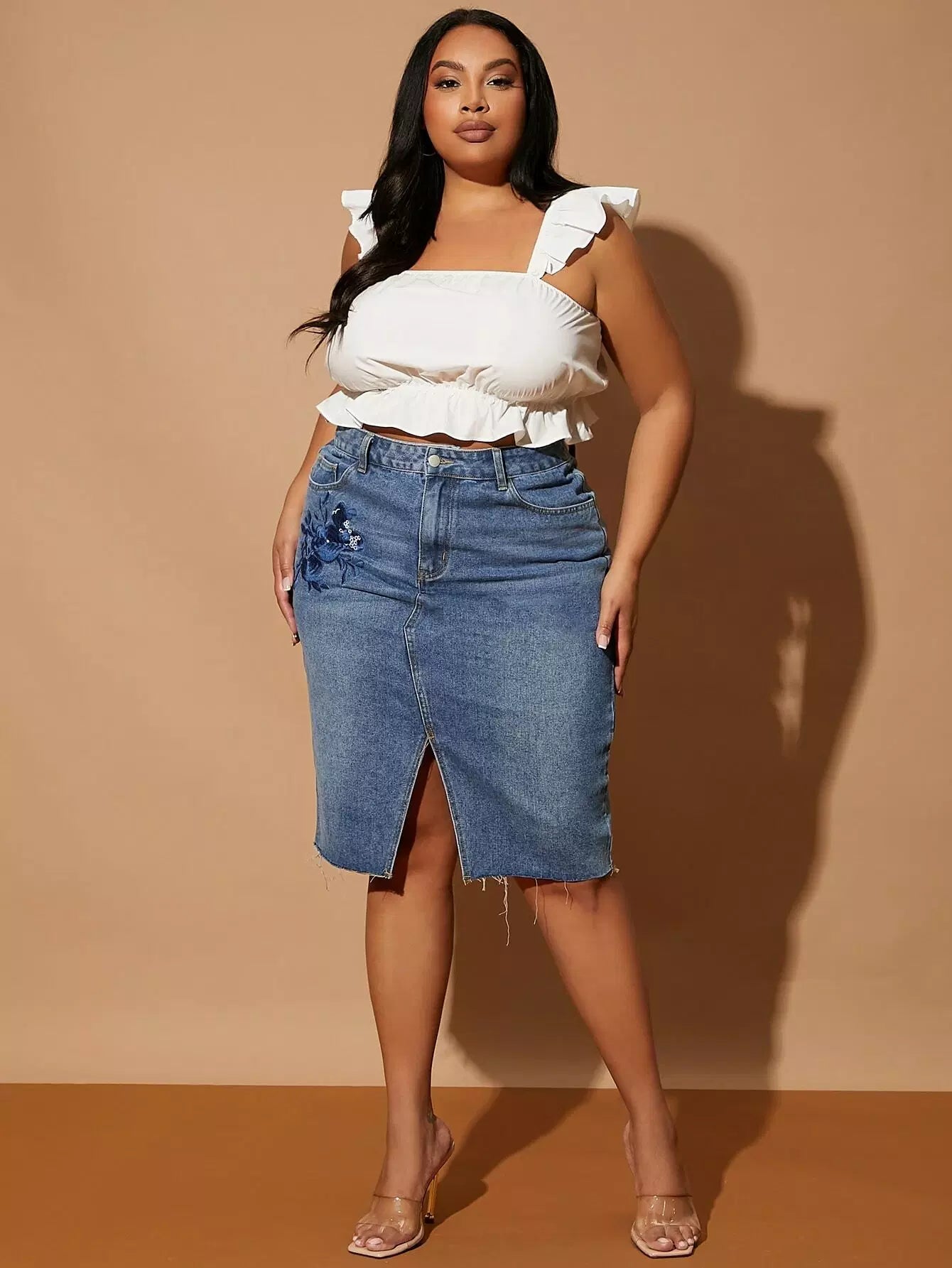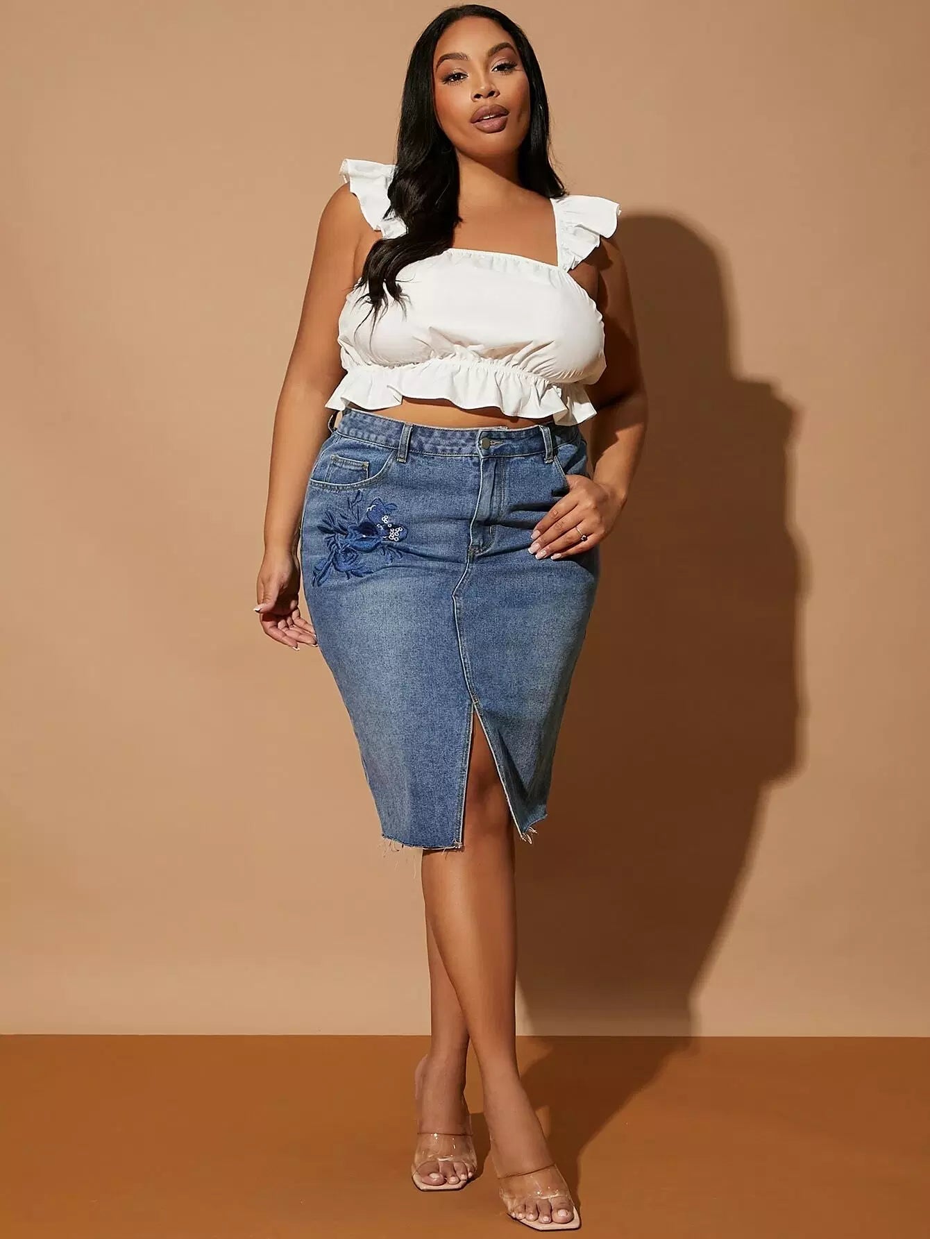 تنورة دنيم عالية الخصر مطرزة بالورود ذات فتحة عالية الخصر