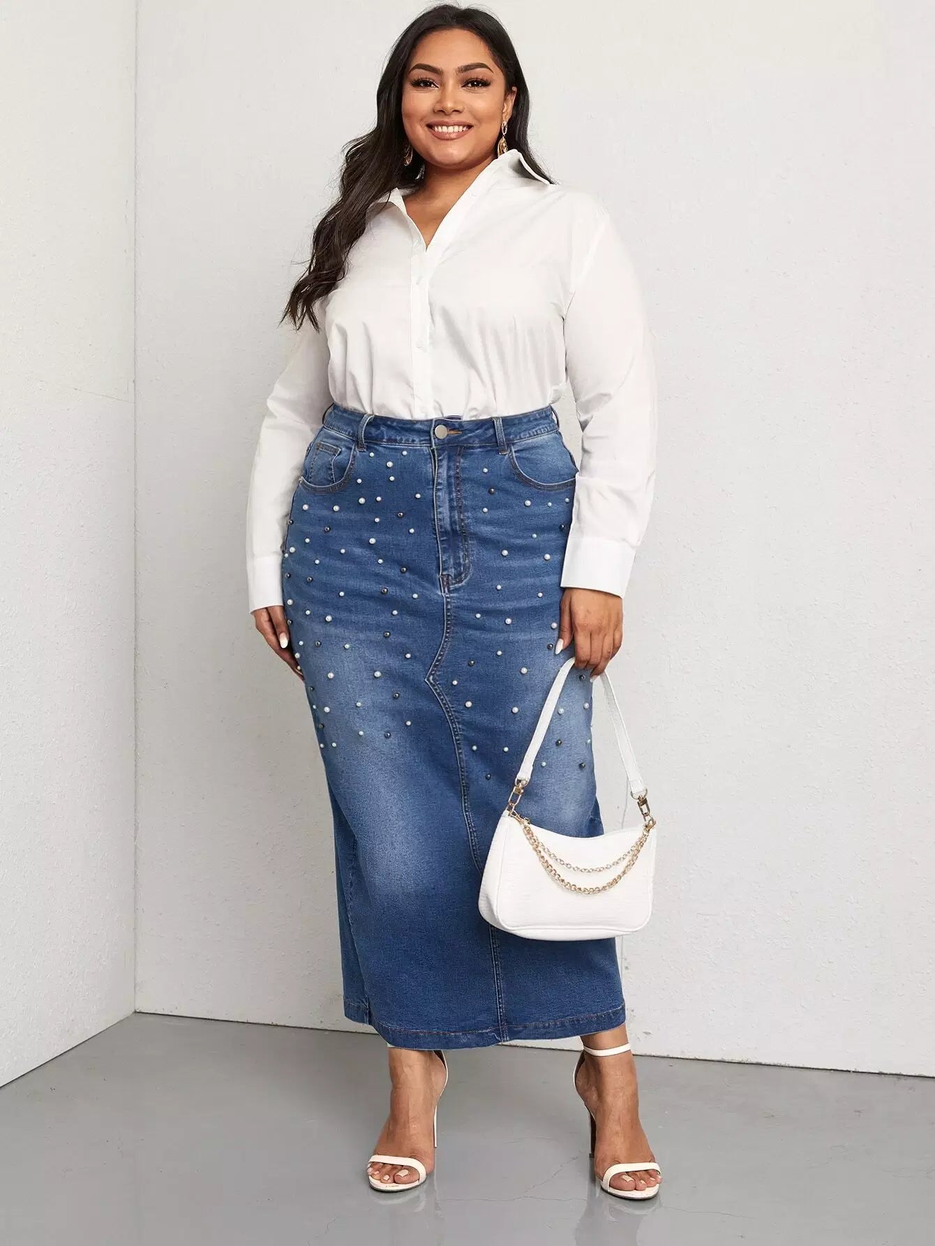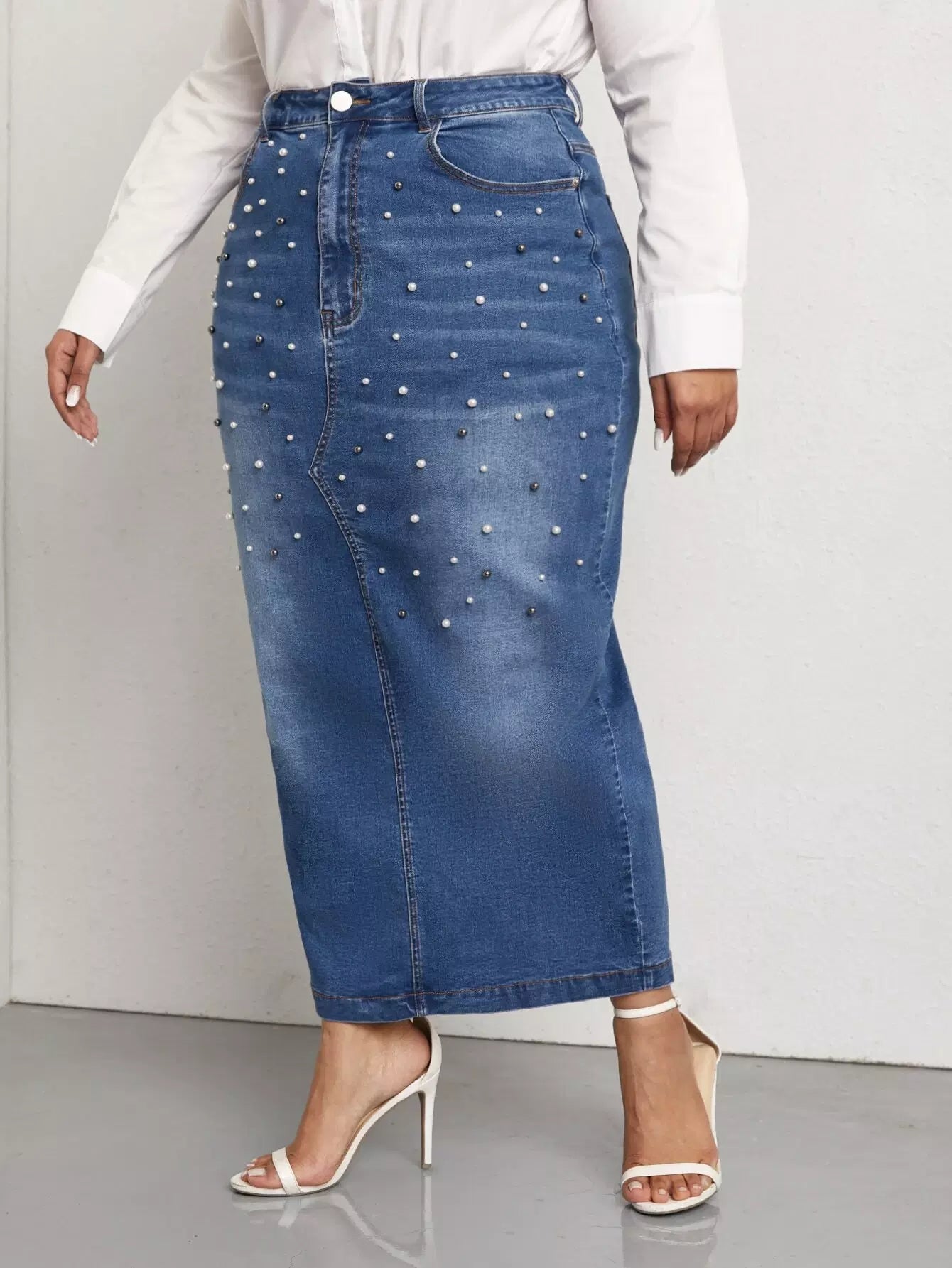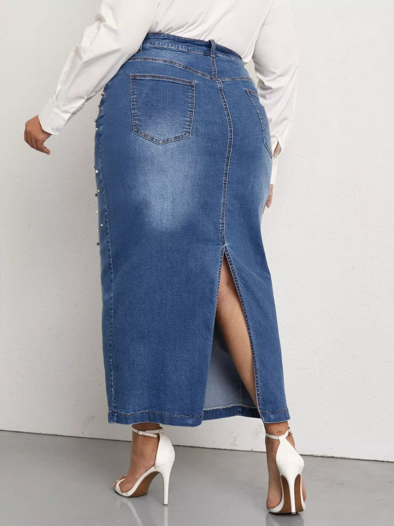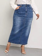 تنورة دنيم دنيم مزينة بالخرز واللؤلؤ والخرز المشقوق من الخلف