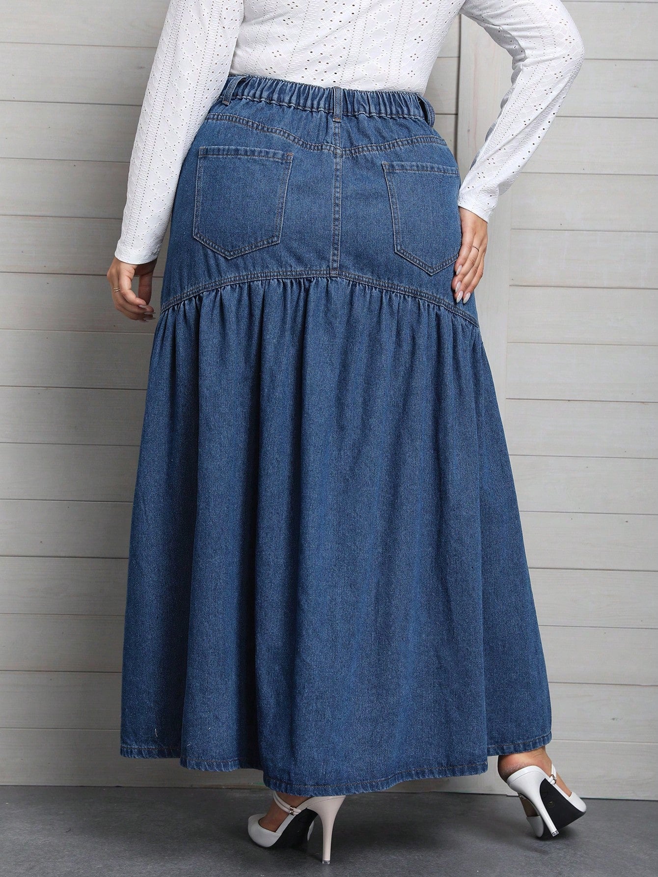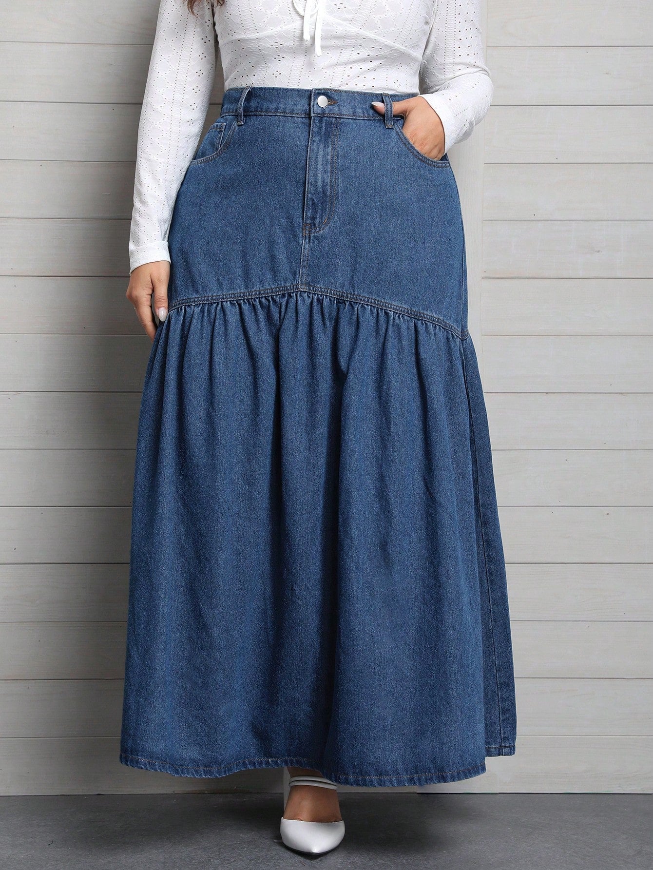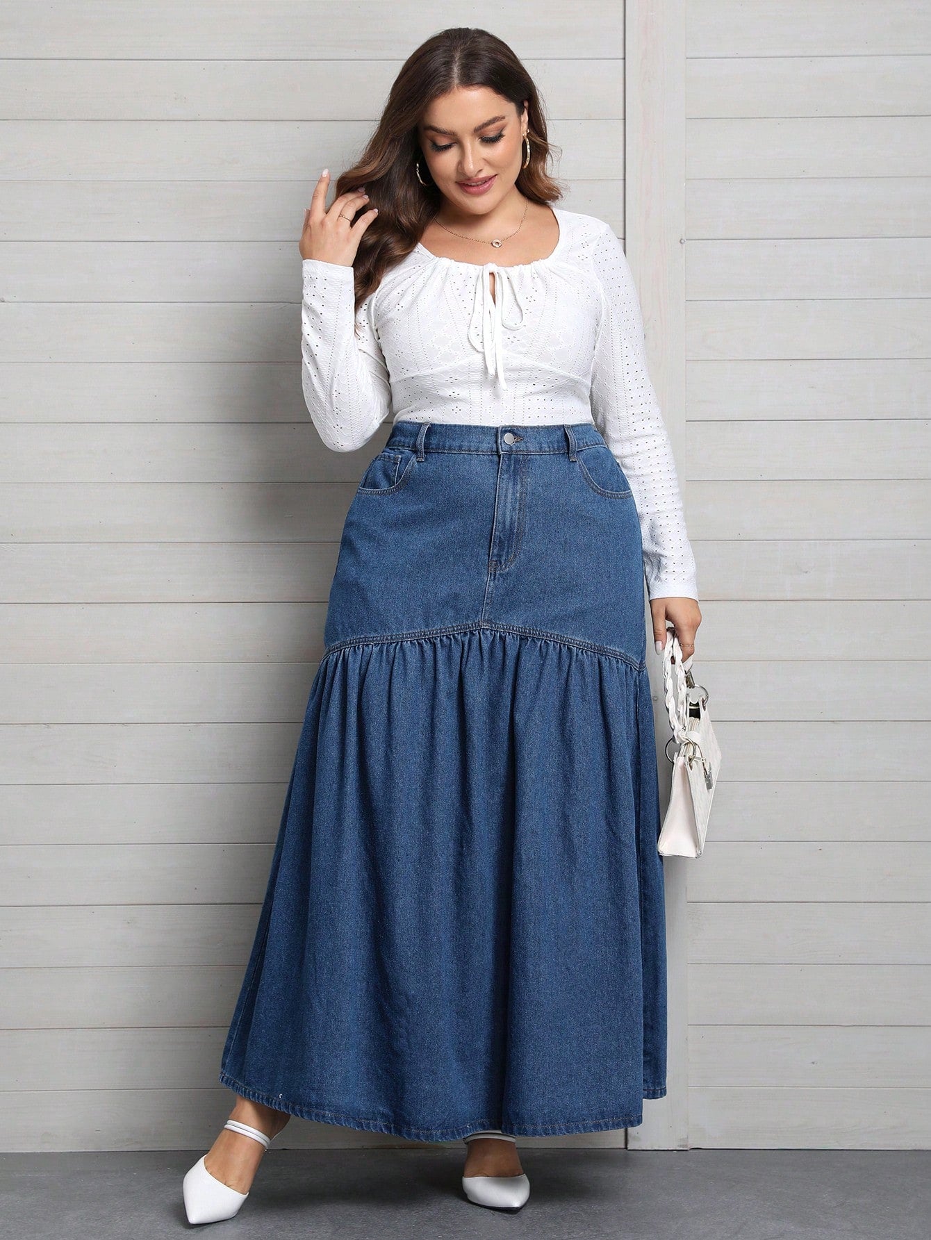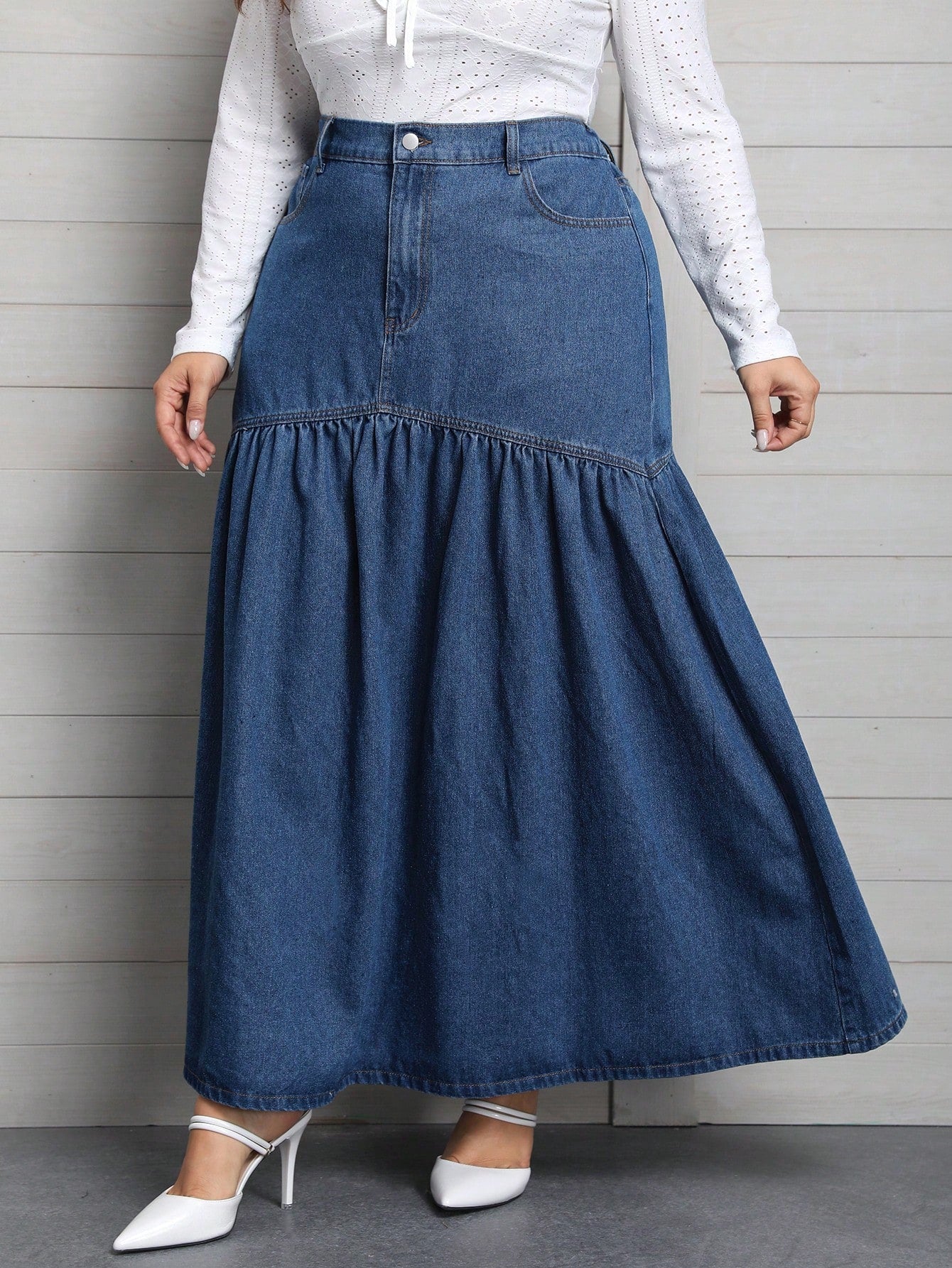 SHEIN Privï؟½ Plus تنورة طويلة من الدينيم بخصر مرتفع وبحواف مكشكشة